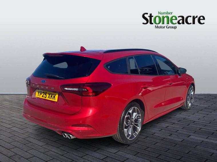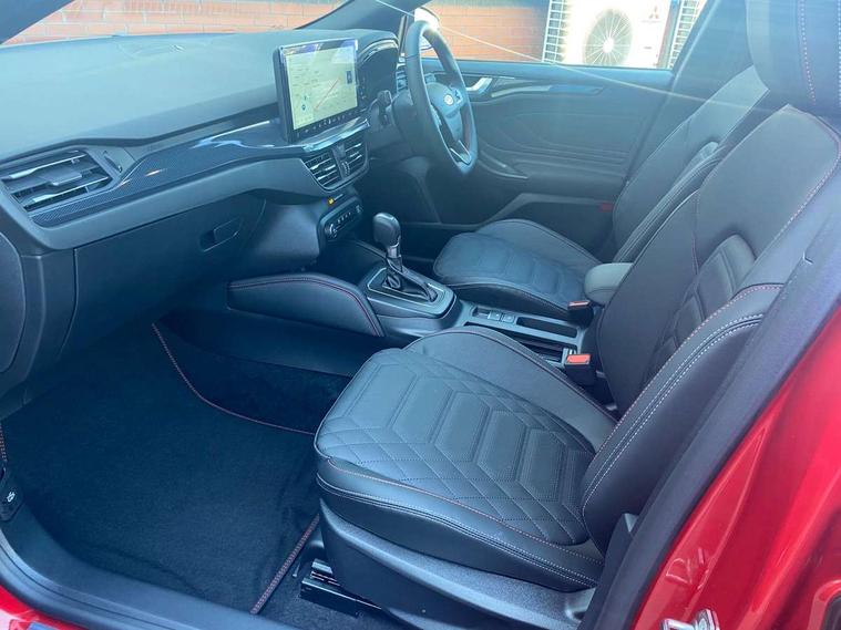12.3" Digital instrument cluster, Bluetooth system, Digital clock, Easy fuel capless refuelling system, Eco mode, Ford SYNC4 Nav with 13.2'' touchscreen, DAB, Emergency Assistance, Apple Carplay & Android Auto, B&O Premium Audio with 10 speakers, FordPass Connect, Lane keeping system - lane keeping alert and lane keeping aid, PAS, Rev counter, Selectable drive mode, Service interval indicator, Trip computer, Wireless charging pad, Sports tuned suspension, 2 USB ports, Auto headlamps (on/off), Body coloured door handles, Electrically operated front and rear windows with one touch opening and closing, Electrically operated heated power fold door mirrors with puddle lamp with side indicators, Front variable intermittent wipers with electric wash, Heated rear window, LED daytime running lamp, LED rear lamps, LED third brake light, Polished twin tailpipe, Privacy glass, Quickclear heated windscreen, Rain sensor, Rear side wing doors, Tailgate wash/wipe, Unique ST-Line grille, full bodystyling kit, and large body coloured rear roof spoiler, 3 rear headrests, 3 seat bench in 2nd row, Dual zone electronic air temperature control, Full sensico premium upholstery, Height adjustable front headrests, Isofix child seat preparation, Load through ski hatch, Manual 2-way passenger seat adjust, Power 4-way driver seat adjust, with power lumbar adjust, Reach + rake adjustable steering column, Single front passenger seat, ST-Line Design pack - Focus, Winter pack - Focus, 3x3 point rear seatbelts, ABS+Electronic Brake force Distribution, Auto hold function, Driver airbag, EDL traction control, Electronic parking brake, Electronic stability control, Front and rear seatbelt reminder, Front inertia reel height adjustable seatbelts with pre-tensioners, Front passenger airbag, Front side airbags, Passenger airbag deactivate switch, Post collision braking, Pre collision assist with autonomous emergency braking and pedestrian/cyclist detection, Remote/power child rear door locks, Side curtain airbags, Three rear inertia reel lap/diagonal seatbelts, Tyre pressure monitoring system, Keyless entry and keyless start, MyKey system, Remote central locking & engine immobiliser, Thatcham alarm with power door dead locks, 18" 5x3 spoke pearl grey high gloss machined finish alloy wheels with mini spare wheel,