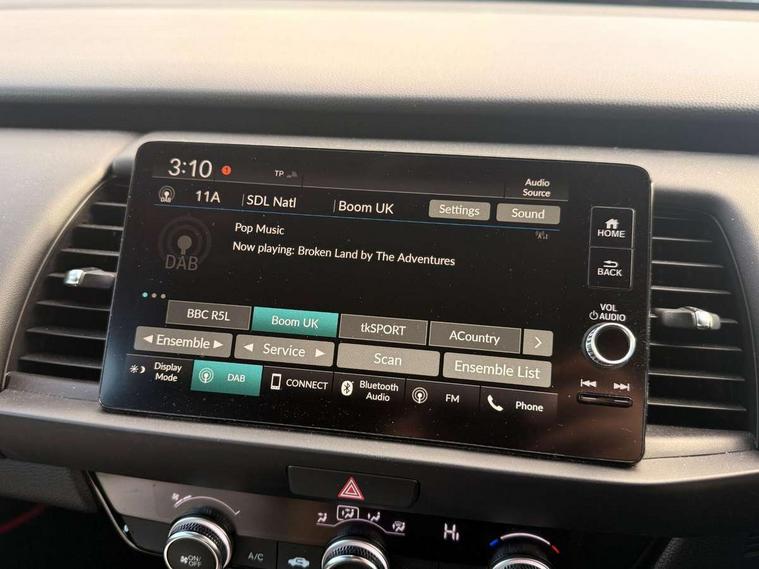 Adaptive cruise control, Adjustable speed limiter, Agile handling assist, Bluetooth hands free telephone connection, Econ mode, Electric power steering wheel with variable gear ratio steering, Emergency stop signalling system, Forward collision warning, Front and rear parking sensors, Honda CONNECT with 9" touchscreen, AM/FM/DAB/Apple Carplay and android auto, Idle stop, Intelligent speed limiter, Lane departure warning system, Lane keep assist system, Low speed following, Multi-information display, Road departure mitigation, Traffic sign recognition, Vehicle stability assist, 'Shark fin' mobile antenna, 2x USB Front socket (1 data & 1 charge), 4 speakers, Remote audio controls on steering wheel, Aspheric door mirrors, Auto wipers, Automatic headlights with on/off timer, Coming/leaving home function, Body colour door handles, Body colour door mirrors, Body coloured bumpers, eHEV emblem, Electric adjustable door mirrors, Electric front windows, Electrically folding door mirrors, Heated door mirrors, High beam assist, LED daytime running lights, LED Headlights, LED rear lights, Single exhaust tailpipe, 60/40 split rear bench seat, Cargo net hooks, Climate control air conditioning, Driver and front passenger seat armrests, Driver and passenger front seat pockets, Driver's seat height adjustment, Fabric/leather upholstery, Front accessory power socket, Front head restraints, Front map lights, Front/rear courtesy lights, Isofix child seat restraint mechanism, Isofix points, Magic seat flexibility system, Plating interior door handles, Rear head restraints, Rear parcel shelf, Sunvisors with vanity mirrors, Tilt/telescopic adjustable steering wheel, Tonneau cover, Trunk light, 3x3 point rear seatbelts, Anti-lock braking system (ABS), Brake assist function, Brake hold function, Collision mitigation braking system, Deflation warning system, Driver knee airbag, Driver SRS airbag (single stage inflation), Driver/Front Passenger airbags, Electric parking brake, Front and rear side curtain airbag, Front side airbags, Hill start assist, Passenger SRS airbag cut-off device, Rear side airbags, Whiplash lessening front headrests, Front seat belt with emergency locking retractor, Honda super locks, Immobiliser, Mirrors key fob operation, Remote central locking with 2 remote folding keys, Security alarm, Soft pad leather interior panels, 15" Multi apperance alloy wheels in mat berlina black, Tyre repair kit,