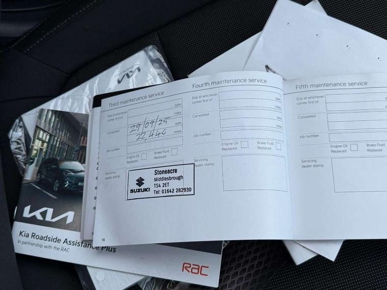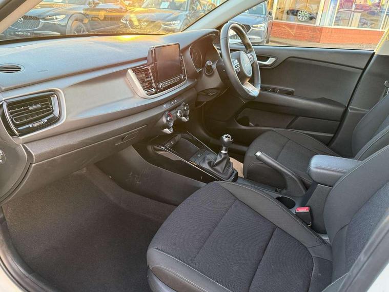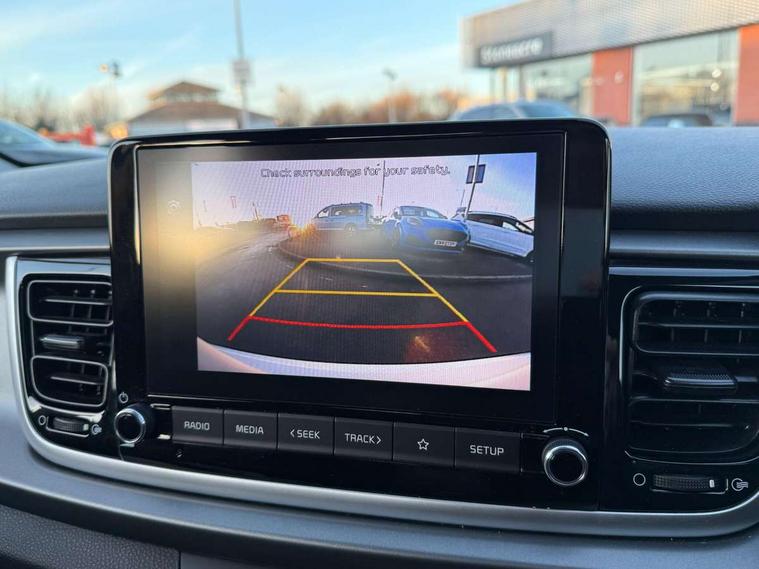 8" touch screen, Apple car play/Android Auto, Cruise control + speed limiter, Digital clock, Electric power steering, Emergency stop signalling system, Gear selection indicator, Manual speed limit assist (MLSA), Outside temperature display, Rear parking sensor, Reversing camera system with dynamic guidelines (Integrated into centre fascia screen), Tachometer, Trip computer, Voice control system, Windscreen washer level indicator, Intelligent Stop and Go, 6 speakers, Bluetooth connectivity including audio streaming, DAB Digital radio, Front USB port for media connection, Rear USB port, Steering wheel mounted audio controls, Aeroblade-type front wipers, Automatic lighting control, Bi-function projection headlights, Black grille with chrome surround, Body colour bumpers, Body colour door handles, Body coloured door mirrors, Cornering light, Electric adjustable/heated/folding door mirrors, Front electric windows with driver's auto up/down function, Headlamp levelling, Heated rear window, LED daytime running lights, LED indicators in door mirrors, Projection front fog lights, Projection headlights, Rear electric windows, Rear fog lamp, Rear wash/wipe, Speed variable front wipers, Tinted glass, Welcome home function, 3 passenger assist grips, 60/40 split/folding 2nd row of seats, Air conditioning, All round height adjustable headrests, Centre Console with Storage Box and Sliding Armrest, Dash illumination dimmer switch, Driver's seat height adjuster, Driver/passenger sunvisors and illuminated vanity mirrors, Front and rear door map pockets with bottle holder, Front passenger seatback pockets, Front USB charger port and 12V socket, ISOFIX top tethers and lower anchor points, Leather trimmed gearshift, Leather trimmed steering wheel, Load area light, Luggage area parcel shelf, Luggage hooks, Overhead console with sunglasses holder, Premium cloth upholstery, Silver interior door handles, Tilt/telescopic adjustable steering wheel, Advanced driving assistance pack - Rio, 3-point front seatbelts, 3x3 point rear seatbelts, ABS with Electronic Brakeforce Distribution (EBD) and Brake Assist System (BAS), Automatic unlocking of doors in case of impact, Cornering brake control (CBC) and Straight line stability (SLS), Electronic stability control (ESC) and vehicle stability management (VSM), Front seatbelt pretensioners + load limiters, Height adjustable front seatbelt anchors, Hill start assist control (HAC), Passenger airbag deactivate switch, Rear child proof door locks, Seatbelt warning, Traction control, Twin curtain airbags, Twin front airbags, Twin front side airbags, Tyre pressure monitoring system, Anti theft alarm, Deadlocking system, Engine immobiliser, Locking wheel nuts, Remote central door and tailgate locking with fold-away key, Speed sensitive auto door locking, Visible vehicle identification number, Silver fascia trim, 15" Alloy wheels, Tyre mobility system,