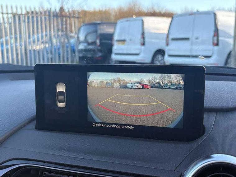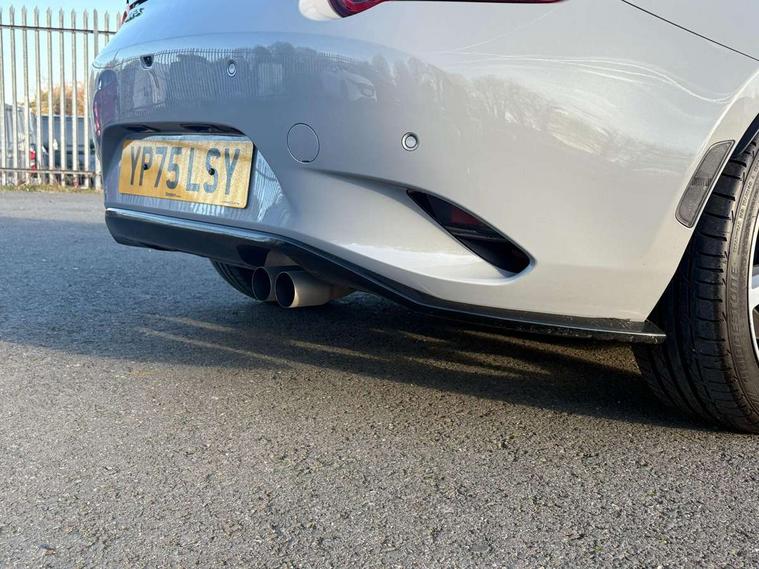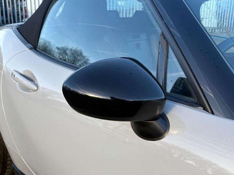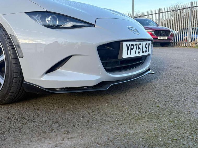 8.8" Colour centre touch screen display with Mazda Connect infotainment, Aha and stitcher app, Analogue speedometer, Apple car play/Android Auto, Blind spot monitoring with rear cross traffic alert, Cruise control with Intelligent speed assist, Driver alert system, eCall emergency call system, Emergency stop signalling system, Engine start/stop button, Hands free phone preparation, Integrated bluetooth with hands-free calling, bluetooth audio and easy access to phone contacts, Integrated navigation system, Kinematic posture control, Lane departure warning system, Lane keep assist, Multi dot display tachometer and electric odometer, PAS, Rear parking sensor, Reversing camera, Service indicator, Traffic sign recognition, Trip computer, Water temperature gauge, Asymmetric limited slip differential, I-ELOOP, i-stop, Sports suspension featuring Bilstein dampers, 2 x USB Type-C inputs, Multimedia Commander including separate volume dial, Premium Bose sound system with 9 speakers with 2 in each front headrest, AM/FM/DAB radio and MP3, Steering wheel mounted audio/bluetooth controls, Adaptive LED Headlights, Automatic headlamp levelling, Black scuff plates with stainless steel insert, Body colour bumpers, Body colour co ordinated interior upper door trim, Body coloured electric/heated door mirrors, Coming/leaving home lighting function, Dual exhaust pipes, Dusk sensitive headlamps, Electric front windows/one touch facility, Exterior body colour co ordinated upper door panel trim with black vinyl and silver stitching, Frameless auto dimming rear view mirror, Front intermittent wipers, LED 3rd brake light, LED daytime running lights, LED indicator lights, LED rear lights, Manually operated black premium cloth soft top with heated rear glass window, Piano Black fashion bars, Rain sensing front wipers, Rear boot, 12V socket, Centre console storage box, Chrome Air conditioning dials, Climate control air conditioning, Coin Box, Driver and front passenger sunvisors with covered vanity mirror and driver ticket holder, Driver seat manual slide, recline and tilt adjustment, Front centre armrest, Front head restraints, Gear shift indicator, Heated front seats, in 3 heat levels, Interior courtesy light, ISOFIX front passenger seat child seat compliance, Leather gear knob, Leather handbrake lever, Leather steering wheel, Lockable rear centre box with lid, Passenger seat + manual slide/recline adjust, Perforated leather upholstery, Single front passenger seat, Strut brace, Tilt/telescopic steering column, Two cupholders, Windblocker, 3 point ELR front seatbelts with pretensioners, ABS+Electronic Brake force Distribution, Deployable Hood System (DHS), Driver and passenger seatbelt reminder audible warning, Dynamic stability control with track mode, Exit warning, Front dual stage driver and single stage front passenger airbags, Front smart city brake support with autonomous emergency braking (SCBS), Hill hold assist, Passenger airbag deactivate switch, Side airbags, Smart city brake support - Rear (SCBS-R), Traction control, Tyre pressure monitor, Remote central locking with deadlocking and remote boot release, Smart keyless entry, Superlocking, Thatcham category 1 alarm + immobiliser, Centre Console - Vinyl leather, Chrome air vent surrounds, Dashboard panel - Black Vinyl, 17" Black machined alloy wheels, Tyre puncture repair kit,