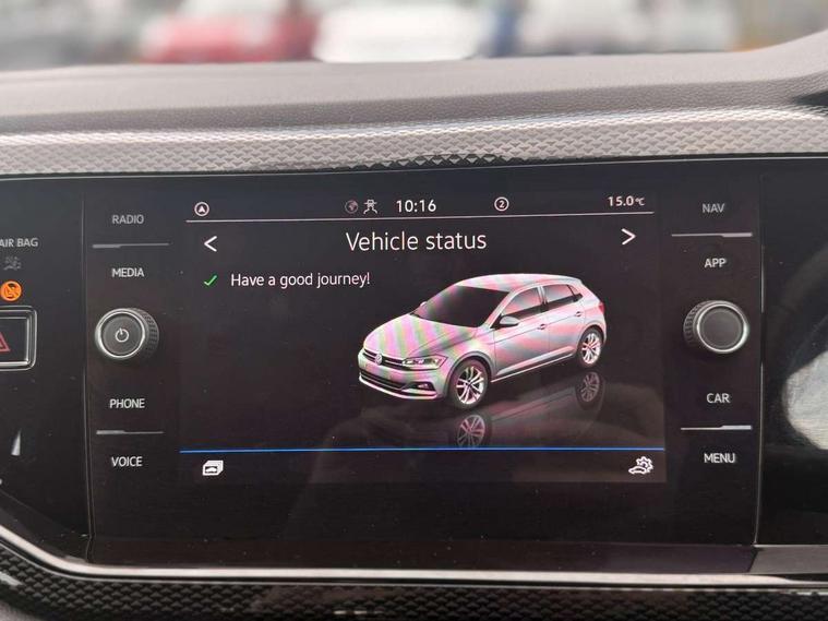 Advanced driver attention and drowsiness monitor, Bluetooth mobile phone interface, Cruise control + speed limiter, Dynamic road sign display, Emergency call service, Lane keeping system Lane Assist, Power assisted speed sensitive steering, Preparation for navigation system with media and internet package, Preparation for We connect and We connect plus, Speedo and rev counter, electronic odometer, trip, service interval display and exterior temperature gauge, Standard rear axle, Trip computer, Warning signal and warning light for front and rear seatbelts not fastened, Washer fluid level indicator, Wireless app connect, Front wheel drive, Rear shock absorpion, Start-stop system with battery regeneration (recuperation - energy recovery during braking), DAB Digital radio, Diversity antenna for FM reception, Front and rear 6 speakers, Automatic dimming interior rear view mirror, Automatic headlight control with LED separate daytime running lights with coming/leaving home function, Body colour bumpers with chrome inserts, Body colour door handles, Body colour door mirrors, Electric front windows, Engine badge deletion, Headlight range adjustment, Heat insulating and laminated safety glass windshield, Heat insulating darkened glass in side and rear windows, Heat insulating glass windscreen, LED Headlights, LED rear combination lamps, Power folding adjustable/heated exterior mirrors and front passenger exterior mirror lowering function, Rain sensor, Rear electric windows, Rear fog light, Rear side wing doors, Rear windscreen washer and wiper with interval delay, Third brake light, 12V power socket in centre console, 2 front and 2 rear reading lights with switch off delay and dimmer, 2 USB-C ports in the front, 2 USB-C charging sockets on the center console in the rear, 3 rear head restraints, 60/40 split folding rear seat and rear seat bench not split, Ceramique roof lining, Chrome plated radiator grille inserts, air vent surrounds and light switch surrounds, Door and side trim panel, Driver and front passenger seat height adjustment, Driver/passenger sunvisors with illuminated vanity mirrors, Front centre armrest, Front seat backrest storage pockets, Front standard seats, Handbrake lever handle in leather, Hartley/Thomas cloth upholstery, Headliner in recycled material, Isofix child seat preparation easy-fit (for two outer rear seats, and front passenger seat) compatible with I-size, Leather trimmed gear knob, Luggage compartment cover, Luggage compartment lighting, Removable luggage compartment floor, Single front passenger seat, Standard climatic zones, Standard pedal cluster, Three spoke leather wrapped multifunction steering wheel, Light and vision pack - Polo, 3 point height adj front seatbelts + pretensioners, 3x3 point rear seatbelts, ABS, Driver and front passenger airbag with front passenger airbag deactivation, Drivers and front passengers safety optimised head restraints, ESC (Electronic stability control) + EDL (Electronic Differntial lock) and ASR (Traction control), Extended and predictive pedestrian/ cyclist protection, Front assist with autonomous emergency braking (for Adaptive Cruise Control ACC up to 130 mph), Front curtain and side airbags with center airbag, Front disc brakes, Hill hold control, Manual child lock in rear doors, Rear drum brakes, Single tone horn, Tyre pressure loss indicator, Alarm with interior protection, Anti-theft alarm system with interior monitoring, backup horn, and towing protection, Anti-theft wheel bolts, Electronic engine immobiliser, Lava stone black gloss/matt decorative inserts in dash and front door panels, Low rolling resistance tyres,
