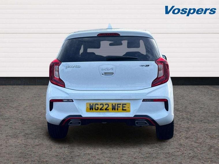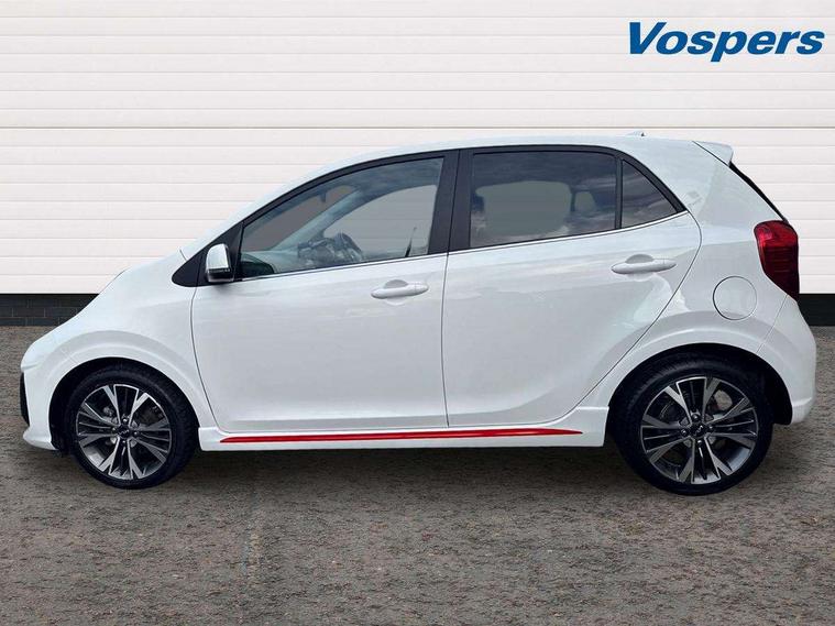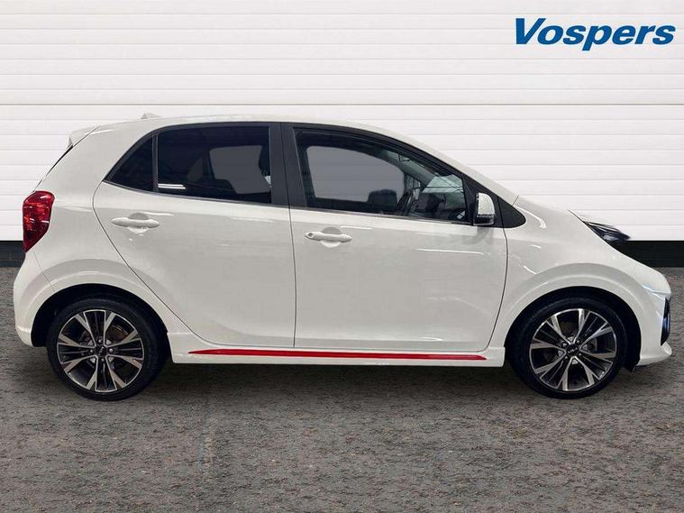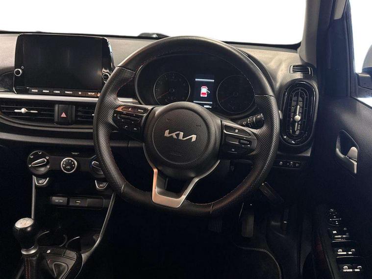8" touchscreen display with RDS and DAB, Apple car play/Android Auto with voice control, Emergency call service, Emergency stop signalling system, External temperature gauge, Motor driven power steering, Reversing camera system with dynamic guidelines (Integrated into centre fascia screen), Tachometer, Trip computer, 6 speaker audio system, Bluetooth with music streaming, Steering wheel mounted controls, USB ports for connection of a media device, Automatic headlight control system, Bi-function projection headlights, Black beltline mouldings, Black grille with silver surround, Body colour B pillars, Body colour bumpers, Body colour mirrors and door handles, Body colour side sill mouldings, Day/night rear view mirror, Electric adjustable/heated/folding door mirrors with LED indicators lights, Front and rear electric windows with drivers's auto up/down function, Front fog lights, Headlamp levelling, Heated rear window, High mount brake light, LED daytime running lights, LED rear fog lights, Privacy glass - Rear windows and tailgate, Rain sensor, Rear side wing doors, Rear wash/wipe, Speed variable front wipers, Sports front and rear bumpers with gloss black skid plates twin exhaust, Tinted glass, Visible VIN plate, Welcome and follow-me home light functionality, 1 x rear coat hook, 12V power point front, 2 seat bench in 2nd row, 3 x passenger assist grips, 60/40 split/folding 2nd row of seats, All round height adjustable headrests, Black and red accents front door armrest, Centre Console with Storage Box and Sliding Armrest, Cupholders in centre console, D-cut steering wheel with red stitching, Driver and front passenger sunvisor with vanity mirror, Driver seat height adjust, Faux leather upholstery, Front cabin lights, Glovebox, High gloss lower centre fascia trim, door armrest and air vents, ISOFIX Child seat top tethers and anchor fixings, Leather trimmed steering wheel and gearshift, Luggage area light, Luggage area parcel shelf, Manual air conditioning, Passenger front seatback pockets, Satin chrome interior door handles, Single front passenger seat, Slide/reclining front seats, Tilt adjustable steering wheel, Advanced Driver Assistance Pack - Picanto, 2 x 3-point rear seatbelts, ABS/EBD, Automatic unlocking of doors in case of impact, Dual front airbags, ESC + BAS + VSM + HAC, Front passenger airbag cut-off switch, Front seatbelt height adjusters, Front seatbelt pretensioners + load limiters, Hill hold control, Knee airbags, Rear child proof door locks, Seatbelt warning, Side impact protection, Torque vectoring brake based and straight line stability (SLS), Traction control, Twin curtain airbags, Twin front side airbags, Tyre pressure monitoring system, Anti theft alarm, Engine immobiliser, Folding key, Locking wheel nuts, Remote central door locking, 16" alloy GT-Line wheels, Tyre mobility kit,