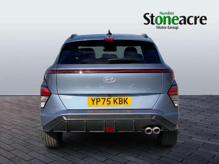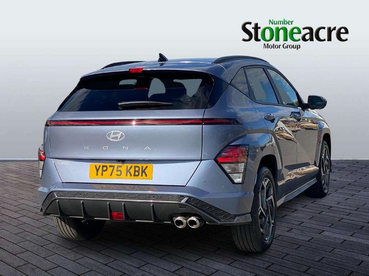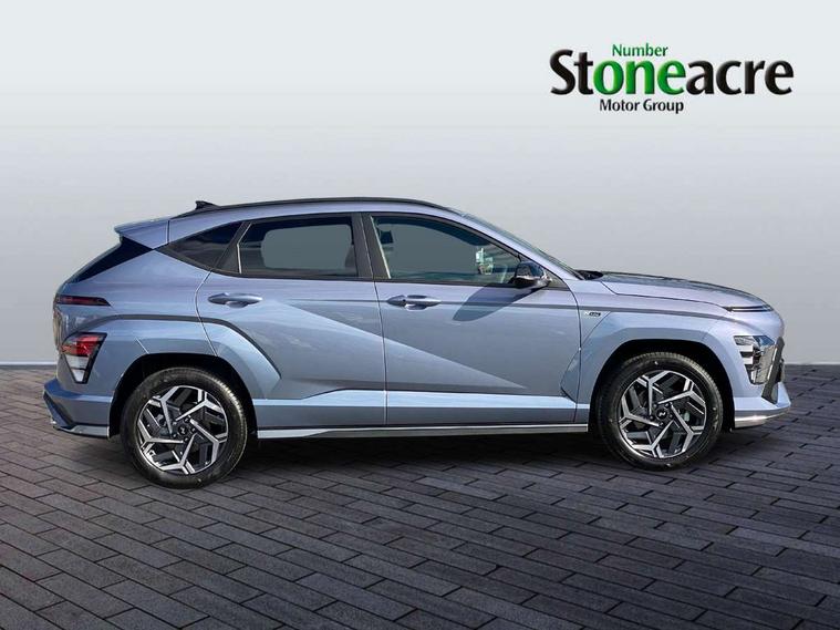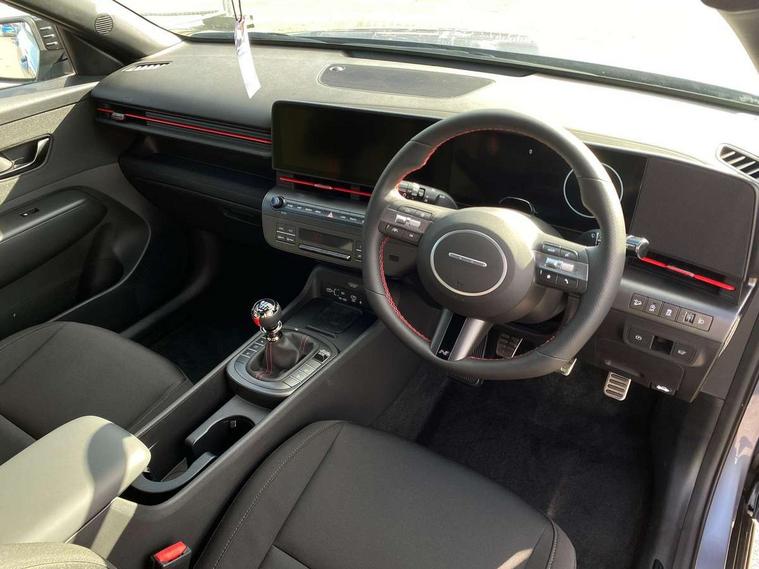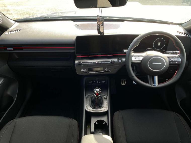 12.3" touchscreen centre console display satellite navigation with bluelink, live services and mapcare, Bluetooth connectivity with voice recognition, Cruise control, Driver status monitor (DSM), Driver supervision instrument cluster with 12.3" LCD display, eCall emergency call system, Feature on demand - Enabled, Forward collision avoidance assist (FCA 1.5) - Car, pededstrian, cycle and junction turning, Front parking sensor, Height adjustable power tailgate, Intelligent speed limit assist, Lane follow assist, Lane keep assist, Leading vehicle departure alert (LVDA), Parking system with rear camera and guidance system, PAS, Rear parking sensor, Roadside assistance, Wireless phone charging pad, Wireless Smartphone Integration includes Apple CarPlay and Android auto, 2 front USB C and 2 rear USB C charging points, DAB Digital radio, Speakers - Front, rear and tweeters, Steering wheel audio, phone and cruise controls, Auto dimming rear view mirror, Automatic headlights with dusk sensor, Automatic windscreen wipers with rain sensor, Body colour exterior door handles, Body coloured wheel arch inserts, Door mirror LED indicator lights, Electric front windows with anti-trap mechanism and one touch control, Electric rear windows, Electrically adjustable and heated door mirrors, Full LED MFR headlights, Gloss black door mirrors, LED daytime running lights, LED upper and lower rear lights, Power folding door mirrors, Privacy glass - Rear windows and tailgate, Rear roof spoiler with integrated LED brake light, Rear side wing doors, Rear wiper, Roof rails, Solar glass with front door glass and windscreen, Tinted glass in front and rear doors, Windscreen auto defog function, 12V power outlet in front console, 2 zone climate control, 3 seat bench in 2nd row, 40/20/40 split folding rear seat, Adjustable head restraints, Aluminium pedals, Ambient lighting, Driver and passenger front seat pockets, Driver's seat lumbar support, Driver/passenger manual seat height adjustment, Driver/passenger sunvisors and illuminated vanity mirrors, Floor mats, Heated front seats, Heated rear seats, Heated steering wheel, Height/reach adjustable steering column, Leather wrapped steering wheel and gear knob, LED centre interior light, LED front interior light, Luggage compartment LED lighting, Luggage shelf, Metal paint effect interior door handles, N Line cloth upholstery, Rear centre armrest with cupholders, Single front passenger seat, Vertical adjustment rear head restraints, N Line exterior design pack - Kona, Trailer wiring package - Kona, Airbag - front, front side, curtain and centre front airbag, Anti-lock brake system (ABS), Childproof rear door locks, Downhill brake control, Electric parking brake, Electronic stability control, Fixed 3 point for second row centre passenger seatbelt, Hill start assist control (HAC), Rear seat alert, Tyre pressure monitoring system, Alarm/immobiliser, Rear occupant alert, Remote central locking, Smart key with keyless entry and start/stop button, Five year annual vehicle health checks, Temporary mobility kit (TMK),