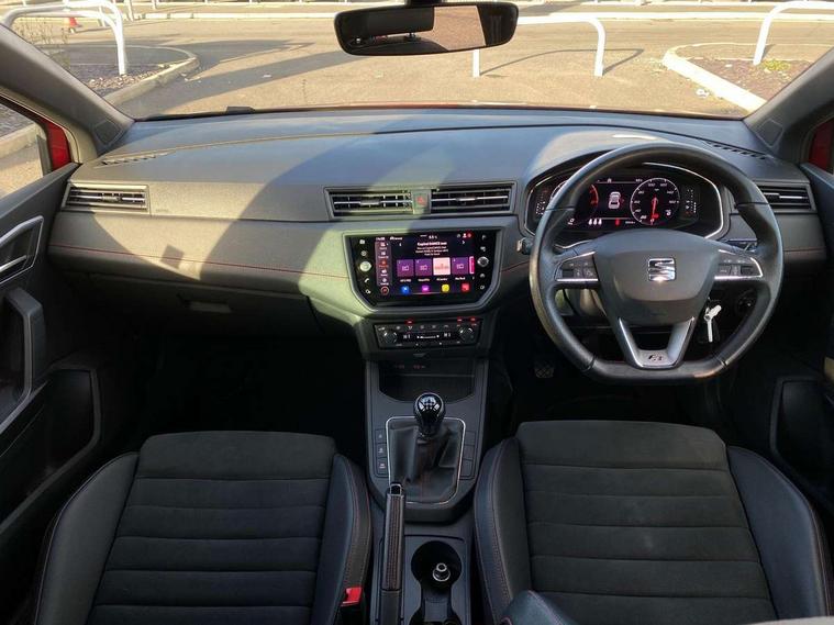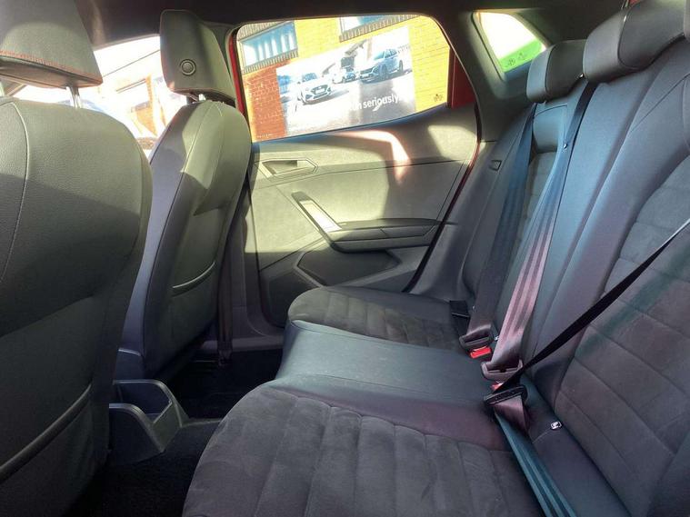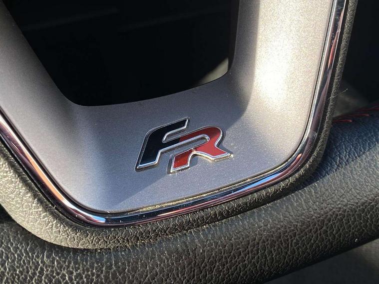 'Lights On' Reminder warning buzzer, Bluetooth audio streaming with handsfree system, Cruise control, Digital clock, Digital cockpit, Full Link Smartphone Integration with Mirror Link, Apple Car Play, Google Android Auto, Low fuel warning light, Navigation system with 8" touch screen + proximity sensor, voice control and USB type C sockets, Outside temperature gauge, Power Steering, Seat connect with safety, service, remote and online, SEAT Drive profile, SEAT logo boot release, Speed limiter, Trip computer, Sports suspension, 6 speakers, Auxiliary input socket, CD player, Digital Audio Broadcast (DAB) Tuner, Radio/MP3 player, SD card slot, Steering wheel mounted controls, USB (type C) cable for Apple and Android compatibility, Anti theft roof antenna, Auto dimming rear view mirror, Automatic headlights, Automatic rain sensing wipers, Body colour bumpers, Body colour door handles, Brilliant black door mirrors, Brilliant black window surrounds, Chrome front grille frame, Coming/leaving home lighting function, Dark tinted rear windows, Electric folding door mirrors, Electric front windows, Electric headlight adjustment, Electric rear windows, Electrically adjustable and heated door mirrors, Exclusive FR rear bumper, Front/rear fog lights, LED daytime running lights, LED headlights with dynamic headlight range control, LED tail lights, Rear spoiler with twin exhausts, 60/40 split folding rear seat, Ambient interior lighting, Chrome detailing, pearl grey headlining and leather effect door trim panels, Driver's sunvisor with ticket holder/vanity mirror, Dual zone climate control with combination filter, Front courtesy lights, Front cupholders x 2, Front reading lights, Gear shift indicator, Glovebox, Height adjustable driver's seat, Height adjustable passenger seat, Height/reach adjust steering wheel, Illuminated boot, Instrument lighting with brightness control, Leather dashboard, Leather multifunction flat bottomed steering wheel with FR logo, leather gear knob and handbrake, Microsuede cloth upholstery, Passenger sunvisor, Rear top tether child seat ISOFIX attachment, Storage pockets on back of front seats, Two height adjustable front and rear headrests (three in rear), 3 point seatbelts on all 3 rear seats, ABS, Active front headrests, Child locks on rear doors, Curtain airbags, Driver/Front Passenger airbags, ESP+EBA, Front assist (AEB), Front passenger airbag deactivation, Front side airbags, Hill hold control, Multi-Collision braking, Seat belt reminder for front and rear seats, Tiredness recognition system, Tyre pressure monitoring system, Anti theft wheel bolts, Electronic engine immobiliser, Perimeter alarm and interior monitoring with backup horn and tow away protection, Remote central locking + deadlocks, 18" Performance machined bi-colour alloy wheels,