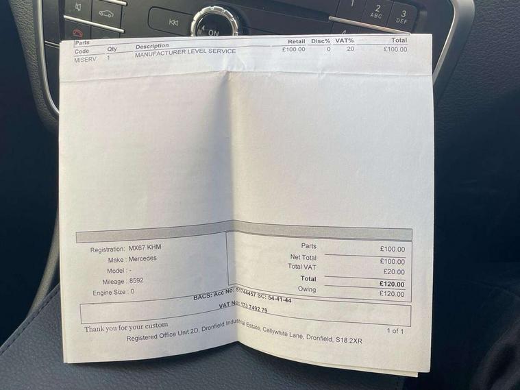 7" colour screen, Attention assist, Easy-pack tailgate - Powered opening/closing automatically, Low fuel level warning light, Multi function trip computer, Outside temperature gauge, Reversing camera, Service indicator (ASSYST), Smartphone integration with Apple CarPlay, Speed sensitive power steering, Comfort suspension, 6 speakers, Bluetooth connectivity including audio streaming, Media interface, Mercedes Audio 20 radio/single CD, SD card slot, USB port, Adaptive brake lights, Aluminium roof rails in high gloss black, Aspherically curved door mirror glass, Automatic headlamp activation, Body colour bumpers, Body colour door handles, Body colour door mirrors, Body colour side skirt, Chrome beltline trim, Electric front windows, Electric heated + adjustable door mirrors, Electric rear windows, Front fog lights, Heated rear window with timer, Heated windscreen wash system, High gloss black roof rails, LED indicators in door mirrors, LED tail lights, Radiator grille with 2 louvres in Silver with chrome trim, Rear privacy glass, Rear windscreen wiper with auto activation when reversing, Roof spoiler, 1/3 to 2/3 split folding rear seats, 12V power socket in centre console, 12V socket in luggage compartment, 3 spoke multifunction nappa leather steering wheel, Air conditioning, Artico man-made leather upholstery, Auto Mercedes-Benz child seat recognition sensor, Centre console storage, Centre console with cupholders, Front and rear headrests, Front centre armrest with storage compartment, Grey headlining, Height adjustable front seats, Height/reach adjustable steering column, Illuminated glovebox, Isofix rear child seat preparation, Load securing rings in luggage compartment, Luggage compartment cover, Luggage compartment lighting, Storage compartment in luggage compartment, 3 rear 3 point seatbelts, ABS with Brake Assist, Active bonnet, Adaptive brake system, Black seat belts, Child proof door locks, Crash responsive emergency lighting, Drivers knee airbag, Dual stage driver/passenger airbags, Electronic parking brake, ESP with ASR, Front and rear seatbelt reminder, Front passenger seat occupancy sensor, Front side airbags, Hill start assist, Tyre pressure monitoring system, Warning triangle and first aid kit, Window airbags, Alarm system/interior protection/immobiliser, Chrome surround in electric key, Keyless start, Remote central locking, Chrome air vent surrounds, Matrix effect trim, 17" 5 twin spoke alloy wheels in vanadium silver, Tirefit sealant with electric air pump,