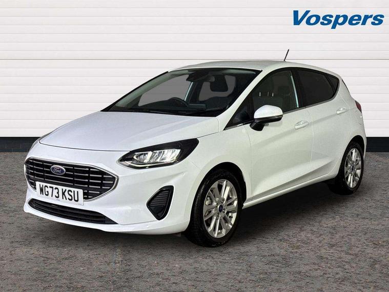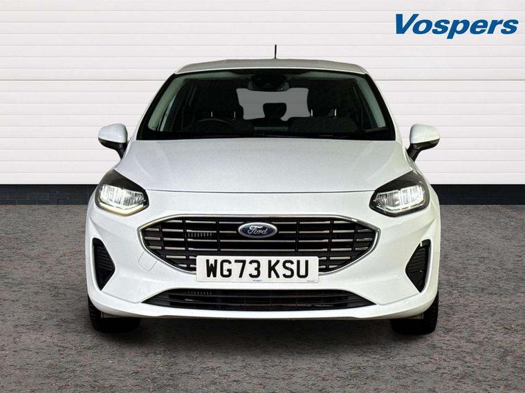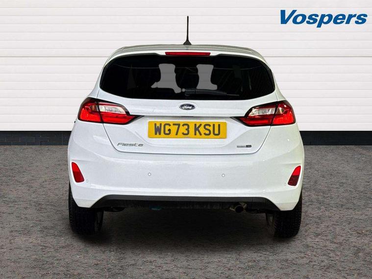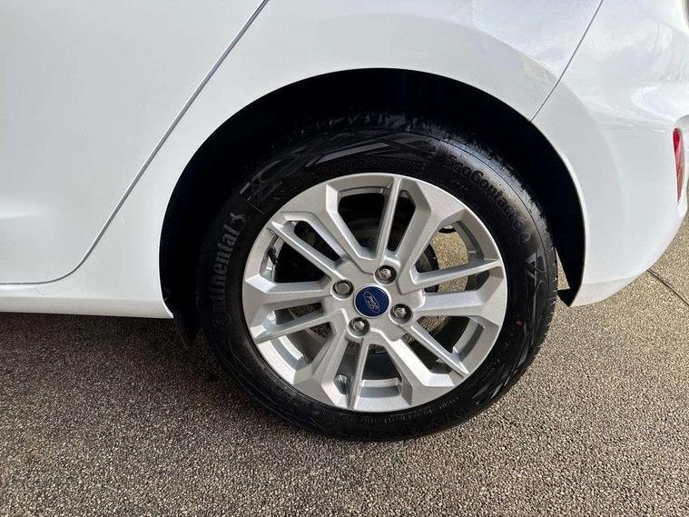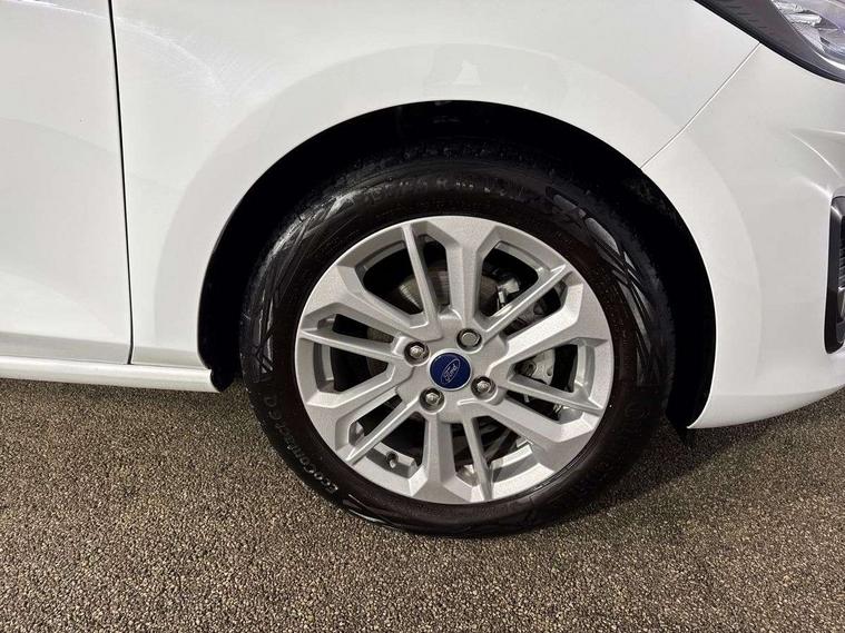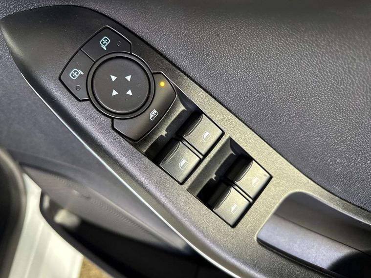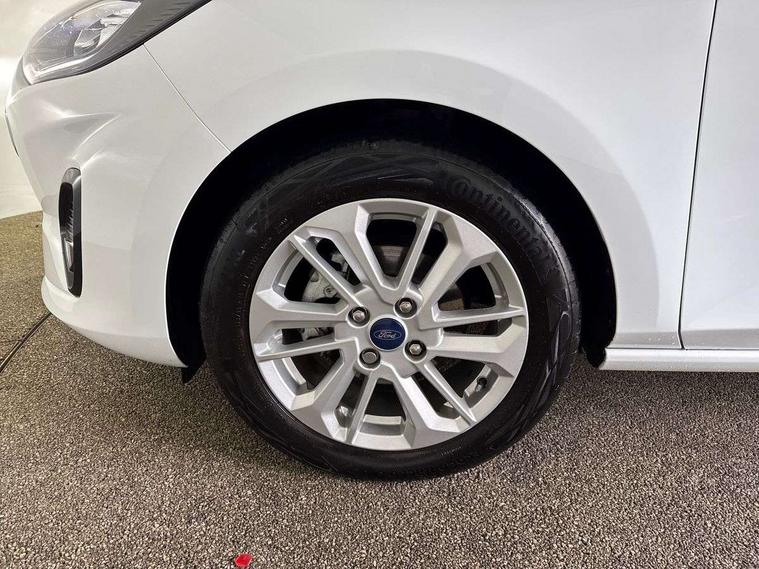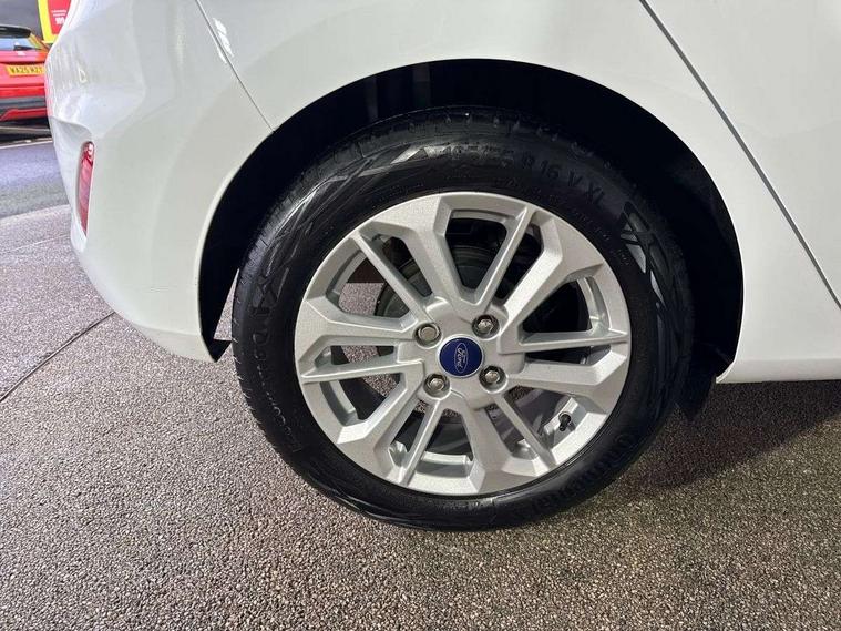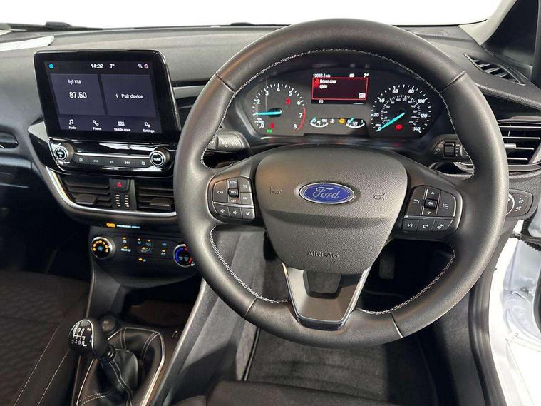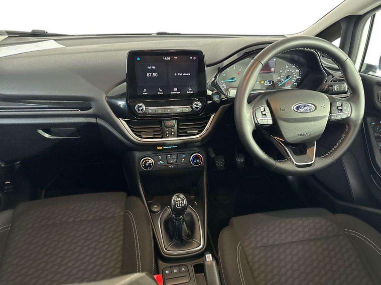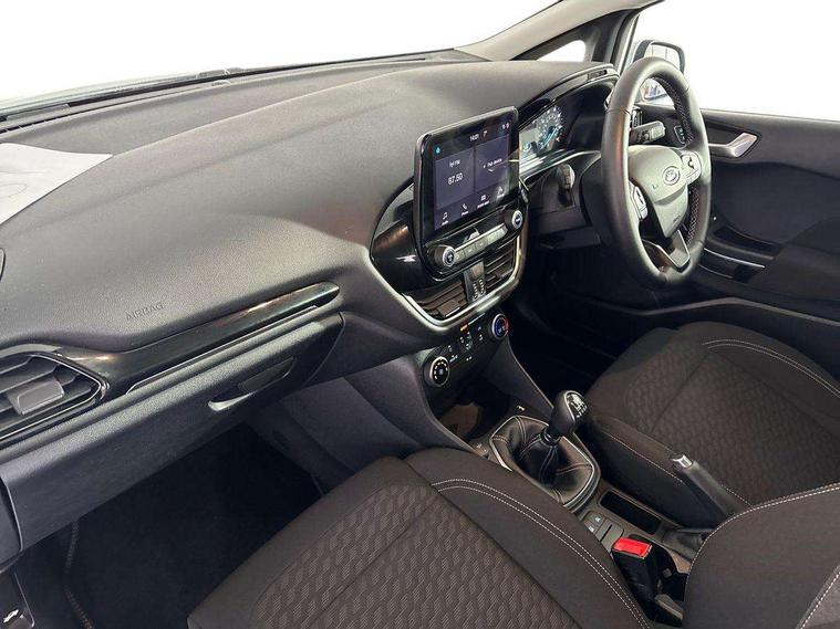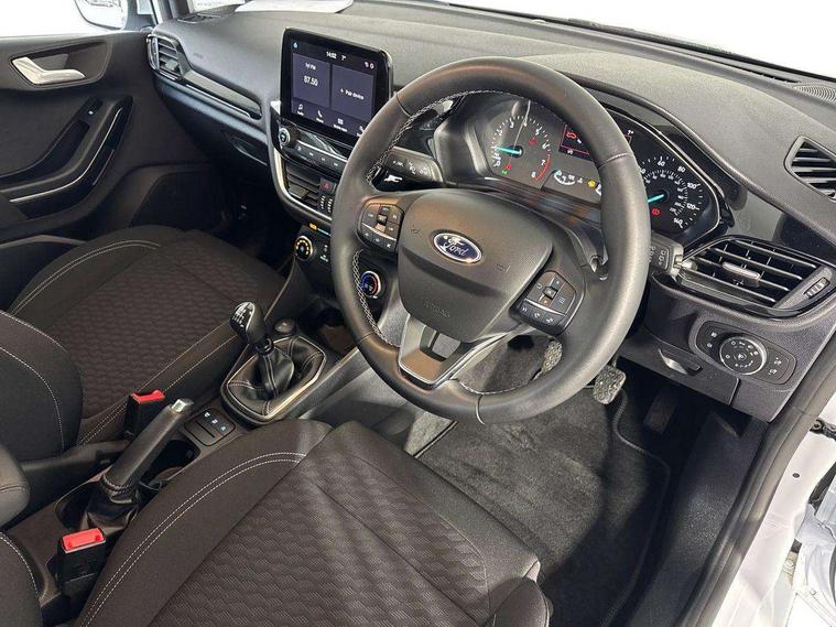Bluetooth system, Electric power steering, Ford easy fuel, Ford SYNC 3 Navigation system incl 8" touchscreen, 7 speakers, FordPass connect, Apple carplay, android auto, voice control and emergency assistance, Rear parking distance sensors, Selectable drive modes (Normal, Sport, Track), Trip computer, 2 USB ports, Auxiliary input socket, DAB Digital radio, Steering wheel mounted controls, Body colour bumpers, Body colour door handles, Body colour rear spoiler, Body coloured electrically operated and heated door mirrors with side indicators, Chrome beltline trim, Chrome front grille, Chrome lower window surround, Cornering front fog lights, Electric front windows/one touch facility, Electric rear windows, Quickclear heated windscreen, Rain sensing wipers and auto dimming rear view mirror, Rear privacy glass, Rear wiper, 3 spoke leather trimmed steering wheel with audio control, 60/40 split folding rear seat, Adjustable head restraints, Boot carpet, Centre console with opening armrest, 2x cupholders, 12v and USB, Chrome inner door handles, Cloth upholstery, Footwell illumination, Front floor mats in velour, Front map reading lights, Front seat and rear pockets, Illuminated glovebox, Leather gaiter, Load area light, Luxury woven headliner, Manual 2 way passenger seat adjust, Manual 4-way driver seat adjust, Manual air conditioning, Overhead console with sunglasses holder, Pollen filter, Rake/reach adjustable steering wheel, Sensico wrapped steering wheel, NCAP Pack - Fiesta, 3 point seatbelts on all rear seats, ABS+EBA, Curtain airbags, Driver and passenger airbags, Drivers knee airbag, Electronic stability control with hill start assist, Front passenger airbag deactivation, Front side airbags, Seatbelt warning, Two tone horn, Tyre pressure monitoring system, Keyless start with 'Ford Power' starter button, MyKey system, Remote central locking & engine immobiliser, Thatcham Cat.1 alarm, 16" 10 spoke alloy wheels,