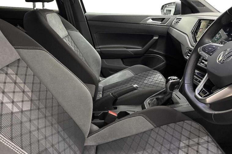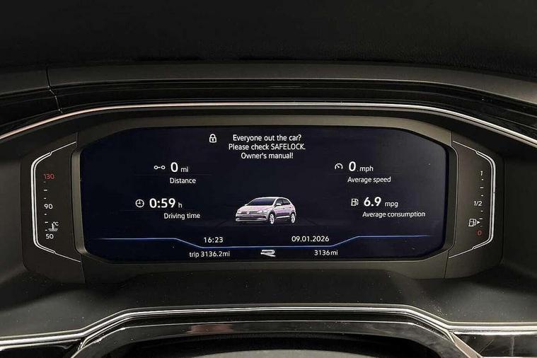 Adaptive cruise control with follow-to-stop and speed limiter, Advanced driver attention and drowsiness monitor, Bluetooth mobile phone interface, Digital Cockpit Pro with 10.25" Display, Dynamic road sign display, Emergency call service, Multifunction camera, Power assisted speed sensitive steering, Preparation for We connect and We connect plus, Speedo and rev counter, electronic odometer, trip, service interval display and fuel gauge, Standard rear axle, Travel Assist - Lane keeping system and traffic jam assist, Travel assist including emergency assist, Trip computer, Warning signal and warning light for front and rear seatbelts not fastened, Washer fluid level indicator, Wireless app connect, Front wheel drive, Rear shock absorpion, Start-stop system with battery regeneration (recuperation - energy recovery during braking), DAB Digital radio, Diversity antenna for FM reception, Front and rear 6 speakers, Body colour bumpers, Body colour door handles, Electric front windows, Front scuff plates with R-Line logo, Heat insulating glass windscreen, Power folding adjustable/heated exterior mirrors and front passenger exterior mirror lowering function, Rear electric windows, Rear fog light, Rear side wing doors, Rear windscreen washer and wiper with interval delay, Third brake light, 12V power socket in centre console, 2 USB-C ports in the front, 2 USB-C charging sockets on the center console in the rear, 3 rear head restraints, 60/40 split folding rear seat and rear seat bench not split, Air care climatronic air conditoning system with active combination filter and 2-zone temperature control, Black roof lining, Carpet mats, front and rear, Chrome plated radiator grille inserts, air vent surrounds and light switch surrounds, Door and side trim panel, Driver and front passenger seat height adjustment, Driver/passenger sunvisors with illuminated vanity mirrors, Front centre armrest, Front footwell illumination, Front seat backrest storage pockets, Front sports comfort seats, Handbrake lever handle in leather, Headliner in recycled material, Isofix child seat preparation easy-fit (for two outer rear seats, and front passenger seat) compatible with I-size, Karoso artvelours cloth upholstery, Leather trimmed gear knob, LED interior light with switch off delay and dimmer, 2 reading lights front and rear, Luggage compartment cover, Luggage compartment floor, Luggage compartment lighting, Lumbar adjustment for front seats, Single front passenger seat, Stainless steel pedals, Standard pedal cluster, Three spoke leather wrapped multifunction steering wheel with shifting paddles, Light and sight pack - Polo R-Line/Black Edition, 3 point height adj front seatbelts + pretensioners, 3x3 point rear seatbelts, ABS, Driver and front passenger airbag with front passenger airbag deactivation, Drivers and front passengers safety optimised head restraints, ESC (Electronic stability control) + EDL (Electronic Differntial lock) and ASR (Traction control), Extended and predictive pedestrian/ cyclist protection, Front curtain and side airbags with center airbag, Front/rear disc brakes, Hill hold control, Manual child lock in rear doors, Single tone horn, Tyre pressure loss indicator, Alarm with interior protection, Anti-theft alarm system with interior monitoring, backup horn, and towing protection, Anti-theft wheel bolts, Electronic engine immobiliser, Chrome applications on rotary light, mirror adjustment, window regulator switches, outlet with frame in black, Dark grey anodised matt decorative inserts in dash and front door panels, 16" Coventry alloy wheels, Low rolling resistance tyres,