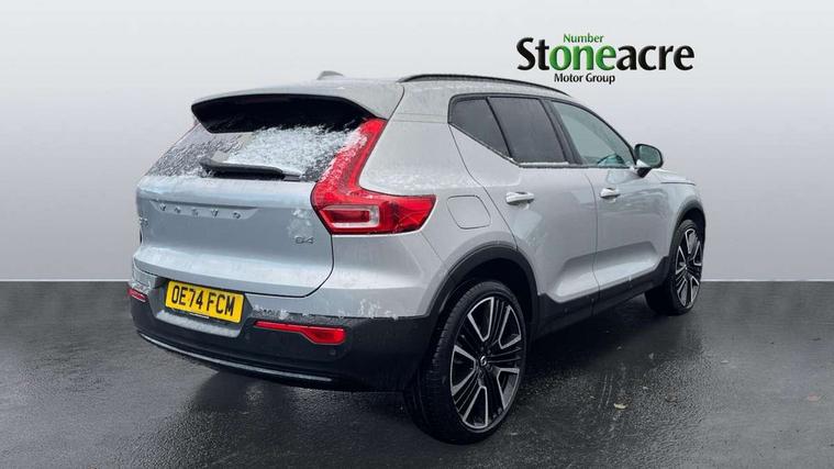 12.3" Progressive Driver Display, 360 degree surround view parking camera with side proximity sensors, 9" centre console portrait touch screen, Adjustable steering wheel force, Apple carplay (wired), Bluetooth handsfree system, Driver alert control, Driver assistance (pilot assist and adaptive cruise control), Driver awareness - Blind spot information system with steer assist, cross traffic alert with autobrake and rear collision warning and mitigation, E-call, Google automotive services - Enabled entertainment apps, navigation with google maps, voice recognition with google assistant, Hands free power tailgate, Intelligent speed assistance, Lane keeping aid, Oncoming Lane Mitigation, Speed sensitive steering, Volvo cars services with app - Driving journal, emergency and breakdown call, engine remote start, remote door locking/unlocking and vehicle dashboard, Wireless/Inductive Mobile Phone Charging, Automatic transmission with start/stop and manual change functions, Dynamic chassis, DAB Digital radio, Premium Sound by Harman Kardon, Dolby Pro Logic II Surround Sound, Dirac Unison, 12 speakers/600W and subwoofer, Steering wheel mounted remote controls, Active bending pixel LED headlights with adaptive shadow technology, Active high beam incorporating daytime running lights, Adaptive brake lights with high level LED brake lights, Auto dimming feature for exterior door mirrors, Auto dimming interior mirror, Automatic headlamp levelling, Dark tinted windows - rear side windows and rear screen, Front aluminium tread plates, Front and rear electric windows, Headlight cleaning system, High gloss black front and rear skid plate, High gloss black front bumper deco, High gloss black mesh front grille with high gloss black surround, High gloss black window trim, Home safe and approach lighting, Integrated roof rails in high gloss black, LED front fog lights with cornering function, Power glass tilt and slide panoramic sunroof with sun curtain, Puddle lights, Rain sensor with automatic windscreen wiper activation, Rear side wing doors, Rear wiper, Roof antenna, Roof spoiler, Visible VIN plate, 12V socket in front tunnel console and luggage compartment, 2-Zone electronic climate control with CleanZone air quality system and pollen filter, 3 seat bench in 2nd row, 3 Spoke tailored steering wheel with chrome trim, 60/40 versatile split folding rear seat, Centre console cupholders and storage, Flexible load floor and grocery bag holder, Floor mats, Front cabin courtesy lights, Front door pocket, front cupholder, ambient front door, rear reading, rear courtesy, instrument panel and tailgate lighting, Front footwell illumination, Front headrests, Front reading lights, Front seat cushion extensions, Front side step illumination (under door), Glovebox bag hook, Heated front seats, Height/reach adjustable steering column, High gloss centre tunnel deco, Illuminated glovebox, Illuminated luggage compartment, Illuminated vanity mirrors + ticket holder, Integrated waste bin, Isofix attachments on outer rear seats, Load cover, Load protection net, Multi directional lumbar support for driver and passenger seat, Power driver seat with memory + exterior mirrors memory, Power folding rear headrests, Power passenger seat, Rear armrest with cupholders, Single front passenger seat, Underfloor cargo storage, Climate pack without heated front seats - XC40, 3x3 point rear seatbelts, City safety with steering support with Pedestrian + cyclist + front collision warning with full auto brake and rear auto brake, Driver and passenger airbags, Drivers knee airbag, Electronic parking brake with auto hold, First aid kit, Front and outer rear seatbelt reminder and pretensioners, Front seats SIPS airbags, Hill descent control, Hill start assist, Inflatable curtain, Passenger airbag cut-off device, Power child locks on rear doors, Road sign information display, Run off Road Protection, SIPS (Side Impact Protection System), Slippery road and hazard light alert, Stability and Traction Control with Spin control, Engine Drag Control and Corner Traction Control, Tyre pressure monitoring system, Vehicle deceleration control with Anti-lock Brake System, Electronic Brake Distribution and Emergency Brake Assist, Warning triangle, WHIPS whiplash protection system - front, 2 x Key integrated remote control central locking including with deadlocking system and auto open/close windows and sunroof, Anti-theft alarm including immobiliser/volume sensor + level sensor, Keyless drive includes keyless entry and keyless start, Locking wheel nuts,