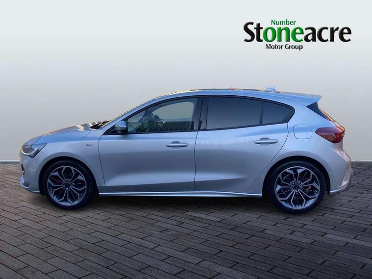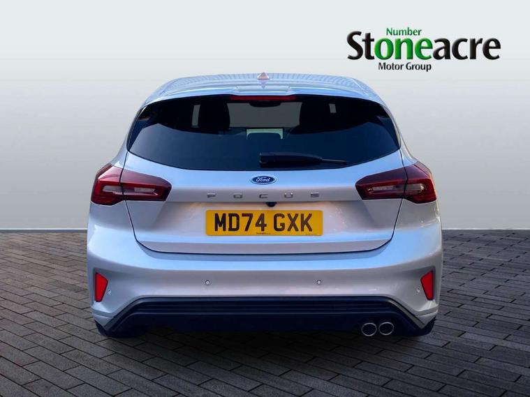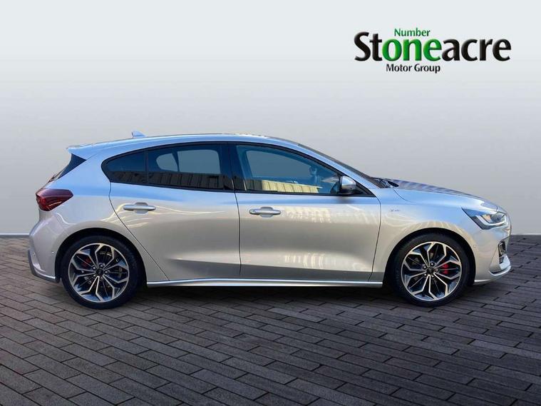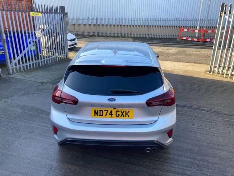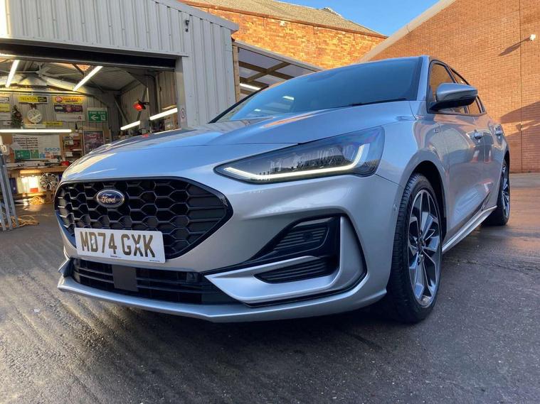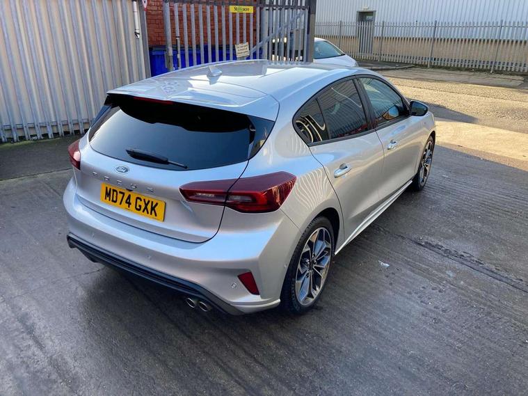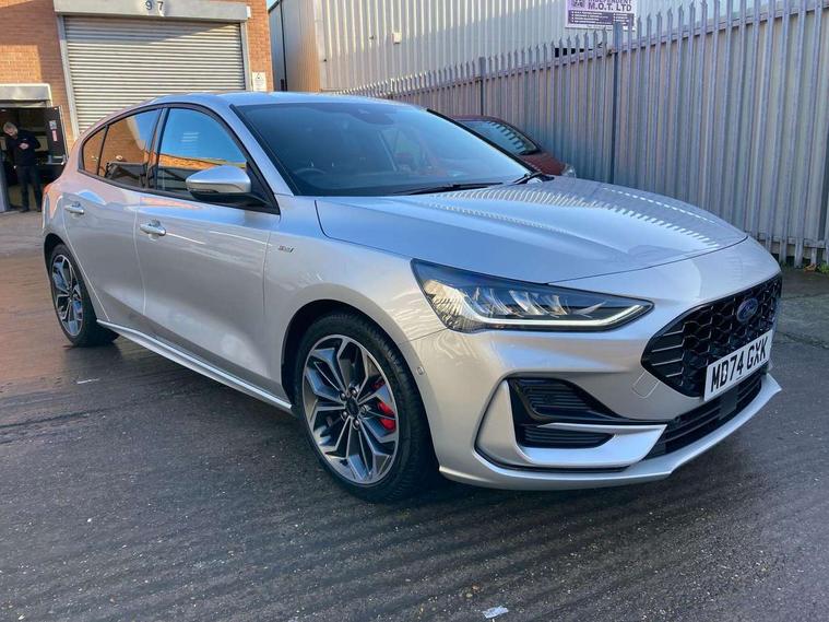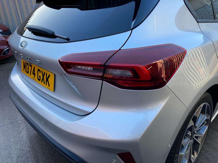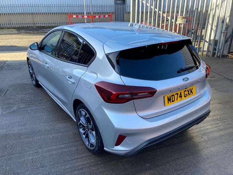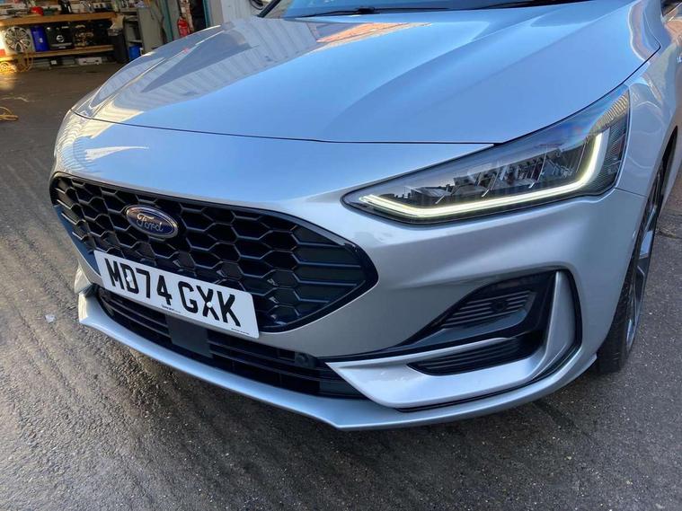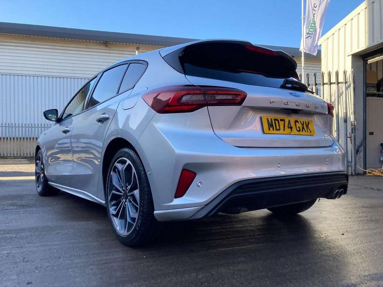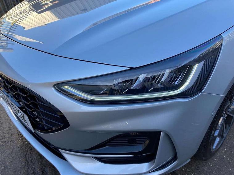 12.3" Digital instrument cluster, Bluetooth system, Digital clock, Easy fuel capless refuelling system, Eco mode, Ford SYNC4 Nav with 13.2'' touchscreen, DAB, Emergency Assistance, Apple Carplay & Android Auto, B&O Premium Audio with 10 speakers, FordPass Connect, Lane keeping system - lane keeping alert and lane keeping aid, PAS, Rev counter, Selectable drive mode, Service interval indicator, Trip computer, Wireless charging pad, Sports tuned suspension, 2 USB ports, Auto headlamps (on/off), Body coloured door handles, Electrically operated front and rear windows with one touch opening and closing, Electrically operated heated power fold door mirrors with puddle lamp with side indicators, Front variable intermittent wipers with electric wash, Heated rear window, LED daytime running lamp, LED rear lamps, LED third brake light, Polished twin tailpipe, Privacy glass, Quickclear heated windscreen, Rain sensor, Rear side wing doors, Tailgate wash/wipe, Unique ST-Line grille, full bodystyling kit, and large body coloured rear roof spoiler, 3 rear headrests, 3 seat bench in 2nd row, Dual zone electronic air temperature control, Full sensico premium upholstery, Height adjustable front headrests, Isofix child seat preparation, Load through ski hatch, Manual 2-way passenger seat adjust, Power 4-way driver seat adjust, with power lumbar adjust, Reach + rake adjustable steering column, Single front passenger seat, ST-Line Design pack - Focus, Winter pack - Focus, 3x3 point rear seatbelts, ABS+Electronic Brake force Distribution, Auto hold function, Driver airbag, EDL traction control, Electronic parking brake, Electronic stability control, Front and rear seatbelt reminder, Front inertia reel height adjustable seatbelts with pre-tensioners, Front passenger airbag, Front side airbags, Passenger airbag deactivate switch, Post collision braking, Pre collision assist with autonomous emergency braking and pedestrian/cyclist detection, Remote/power child rear door locks, Side curtain airbags, Three rear inertia reel lap/diagonal seatbelts, Tyre pressure monitoring system, Keyless entry and keyless start, MyKey system, Remote central locking & engine immobiliser, Thatcham alarm with power door dead locks, 18" 5x3 spoke pearl grey high gloss machined finish alloy wheels with mini spare wheel,