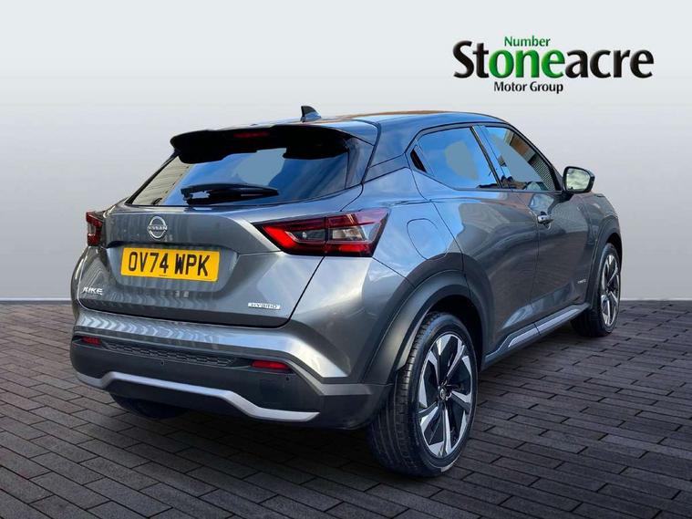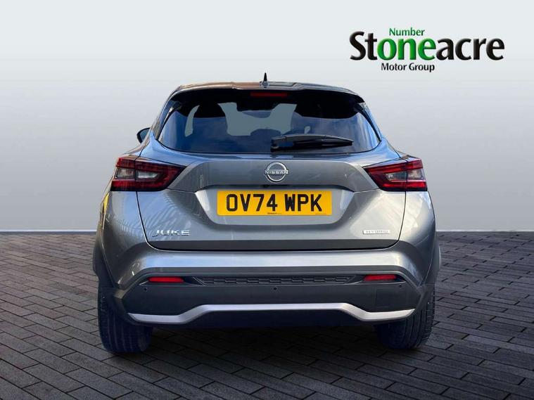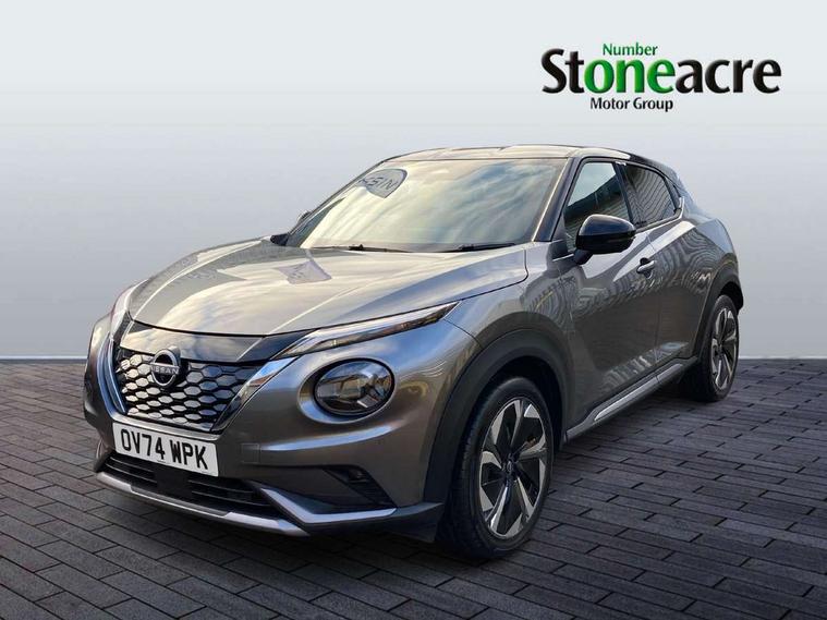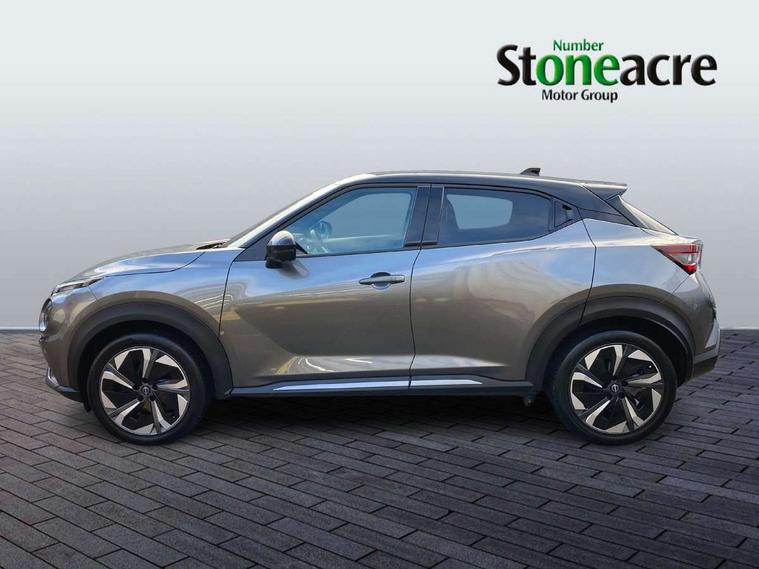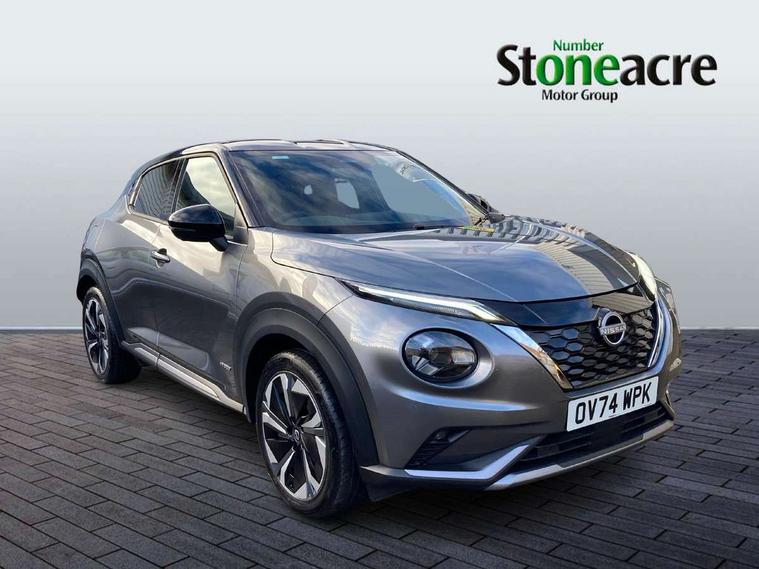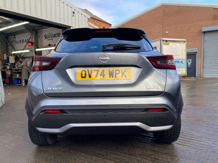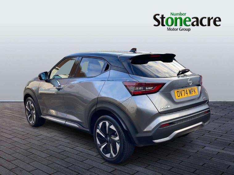 12.3" full colour TFT screen combimeter, Drive modes select (Eco, normal and sport), e-Pedal step, Emergency and breakdown call, EV mode switch, Front parking sensor, Intelligent driver alert system, Intelligent lane intervention, Lane departure warning system, Nissan connect 12.3" touch screen entertainment system, Nissan connect nav with TomTom traffic, Nissan connect services, Outside temperature sensor, Power Steering, Rear parking sensor, Stop/start button, Traffic sign recognition, Trip computer, Voice recognition, WiFi connectivity, Wireless Apple CarPlay and Google Android auto, Wireless Smartphone charger, 10 Bose speakers 6 speakers and 2 headrest speakers for driver/passenger seats, 2 X Rear console USB port, Bluetooth system, USB, Aux-in and 12V socket, Bose personal sound stage control, DAB Digital radio, Auto dimming frameless rear view mirror, Automatic hazard signal with emergency stop signal, Body colour door handles, Electrically adjustable door mirrors with integrated indicators, Follow me home headlights, Front and rear electric window with one touch driver window, Heated and auto folding door mirrors, High beam assist, LED 3rd brake light, LED daytime running lights, LED front fog lights, LED headlamps, LED rear fog lamp, LED rear lamps, One touch passenger window, Rain sensor windscreen wipers, Rear privacy glass, Rear side wing doors, Rear wiper, Roof spoiler, Shark fin roof antenna in solid Black, Three blink turn signal, 3 height adjustable rear headrests, 3 seat bench in 2nd row, 60/40 split folding rear seat, Automatic climate control, Card holder on driver sunvisor, Door ambient lighting, Driver seat back pocket, Driver side rear coat hanger, Driver/passenger sunvisors and vanity mirrors, Front and rear cabin lights, Front armrest, Front door pockets with bottle holders, Front head restraints, Front/rear passenger grab handles, Gear console ambient circle lighting, Height adjustable driver's seat, Internal chrome door handles, Leather gearshift knob, Luggage board, Luggage space lighting, Monoform sporty seats, Multifunction steering wheel, Passenger seat back pocket, Rear door bottle holders, Single front passenger seat, Smooth synthetic leather steering wheel, Synthetic leather kneepad, Telescopic steering wheel adjustment, Two cupholders in front centre console, Two rear isofix child seat anchorage points with top tether, Welcome light and console tray ambient lighting, Heat pack with height adjustable passenger seats - Juke, Interior personalisation pack - Juke, ProPilot pack - Juke Auto, Satin grey exterior personalisation pack - Juke, ABS with EBD and brake assist, Active ride control, Active Trace Control, Driver and passenger airbags, Driver and passenger side airbags, Electric handbrake with auto hold function, Electronic Stability Programme (ESP), Front and rear curtain airbags, Height adjustable seatbelts, Hill start assist, Intelligent emergency braking with pedestrian and cyclist recognition, Rear door child safety locks, Seatbelt reminder for driver/front passenger and rear seats, Three 3 point rear seatbelts, Traction control, Tyre pressure monitoring system, VDC Dynamic Vehicle Control, Alarm, Immobiliser, Intelligent key and start push button with walk away lock and approach unlock functions, Remote central locking, 19" Aero alloy wheels, Tyre puncture repair kit,