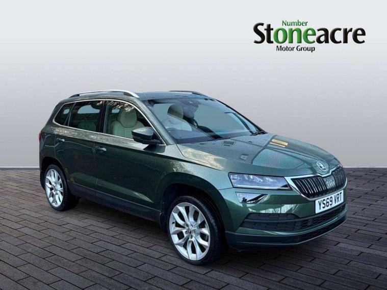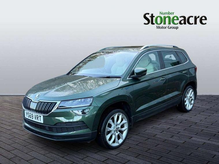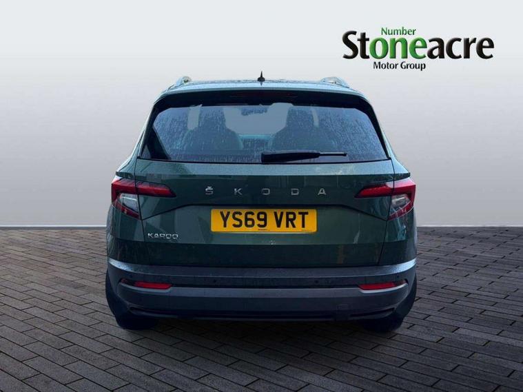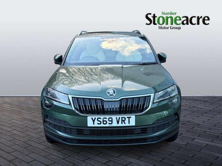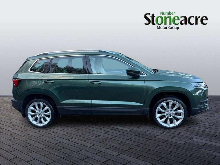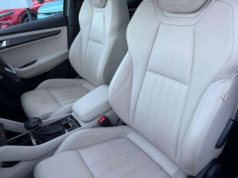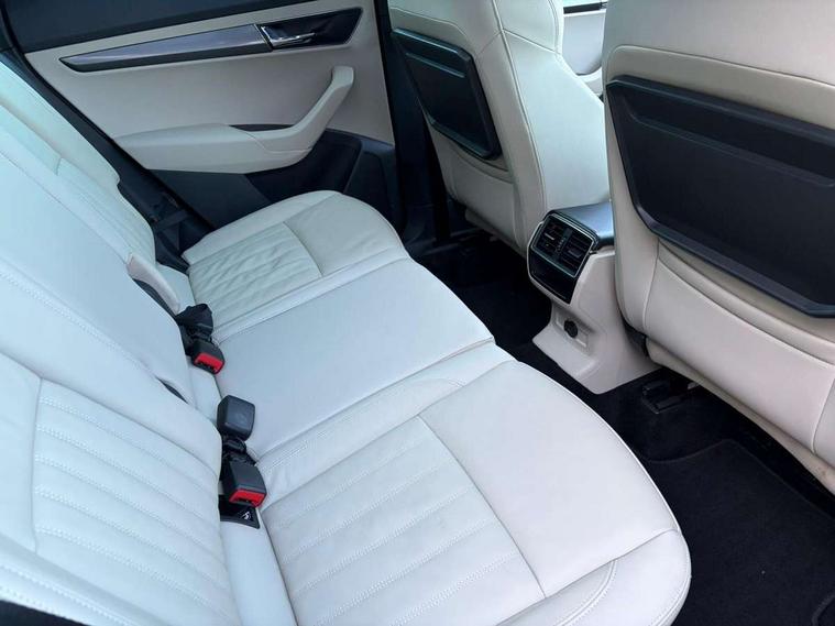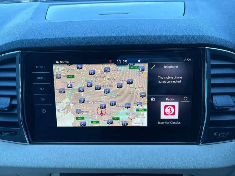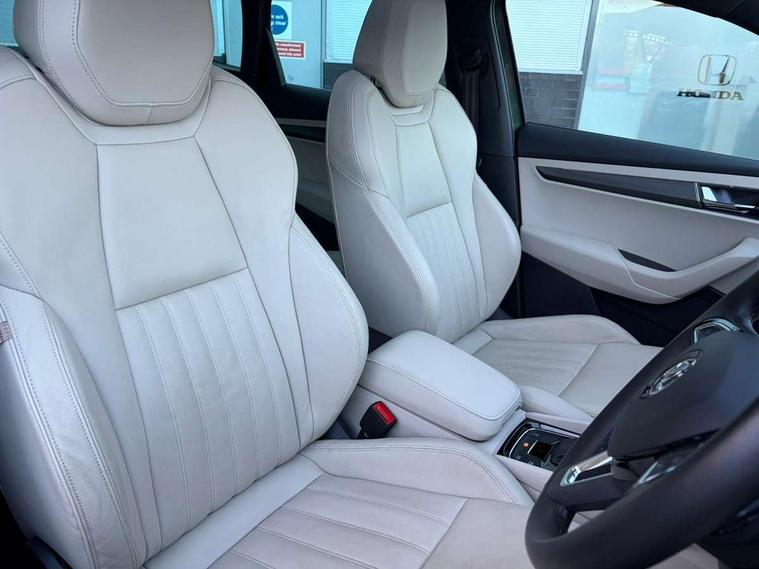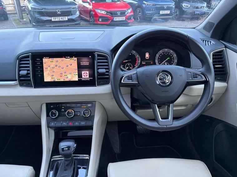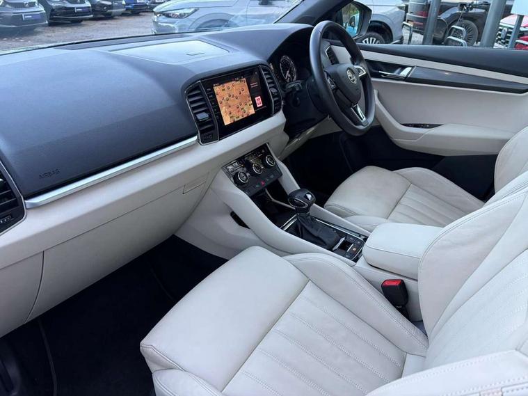 Columbus satellite navigation with 9.2" touchscreen display, integrated Wi-Fi, gesture control and WLAN, Drive mode selector, Driver alert system, Driver fatigue sensor, Driver profile selection, Multifunction colour trip computer, Outside temperature gauge, Rear cross traffic alert, Rear view camera, Service interval indicator, Start/stop system with regenerative braking, Traffic sign recognition, DAB radio with Bluetooth, SD card slot, USB connection, Acoustic glass, Aero front windscreen wipers with intermittent function, Automatic headlight control system, Black electric window control buttons, Body colour door mirrors and handles, Body coloured bumpers, Electric front and rear windows with child proof lock, Full LED headlights + adaptive front light system + LED daytime running lights and front cornering fog lights, Headlight washers, Heated rear windscreen, LED rear lights with high functionality, Light assistant (coming/leaving home/tunnel light), Panoramic sliding sunroof, Privacy glass, Safety reflectors on front doors, Third brake light, 1.5 litre bottle holders in driver and front passenger door panels, 12V socket in boot, 12v socket in front centre armrest with storage compartment and rear air vents, 2 Folding hooks and nets in boot, 2 Front readings lights for driver and passenger, 3 rear height adjustable headrests, 4 foldable roof handles with rear coat hooks, 4 lashing points on luggage floor, Backrest release, Cargo elements in boot, Chrome inner door handles, Dual zone climate control, Folding tables on the front seat backrests, Front seat and rear pockets, Height adjustable front three point seats belts with tensioners, Height adjustable passenger seat, Height/reach adjust steering wheel, Ice scraper, Illuminated and cooled glovebox, Illuminated luggage compartment, Isofix child seat preparation outer rear, Leather upholstery, Net programme in boot, Pen holder, Pollen filter, Rear boot cover, Rear reading lights, Rear seats fixed folding and divided 60:40, Removable LED torch in the boot, Retractable parcel shelf attachable to tailgate, Safety vest holder, Storage box in upper central dashboard closed, Storage compartment below the passenger seat, Sunvisors with illuminated vanity mirrors, Textile floor mats, Umbrella under passenger seat, VarioFlex seats with retractable parcel shelf, Chrome roof rails + chrome pack - Kodiaq, Electrically adjustable driver's seat with memory function pack - Karoq, LED Interior lighting pack with Skoda welcome logo - Karoq, Airbags - Front side, head, knee and curtain, Automatic door unlocking in case of crash, Automatic fuel cut off in case of crash, Driver airbag, Electronic parking brake with auto hold function, Emergency rear braking signal, ESC including ABS, MSR, ASR, EDS, HBA, DSR, RBS, MKB and traction control, Front assist radar scanning of the space in front of the car with automatic braking, Hill hold control, Passenger airbag with switch-off function, Pedestrian monitor, Seatbelt reminder signalisation and pretensioner for all seats, Three point seatbelts rear, Two tone horn, Tyre pressure display, Tyre pressure monitor, Alarm with interior monitoring, back up horn and tilt sensor with safe function, Electronic engine immobiliser, Keyless entry and keyless start with safe system, Remote central locking with 2 remote folding keys, Chrome framed air vents, 19" Crater silver alloy wheels with anti theft wheel bolts, Storage on wheel cover,