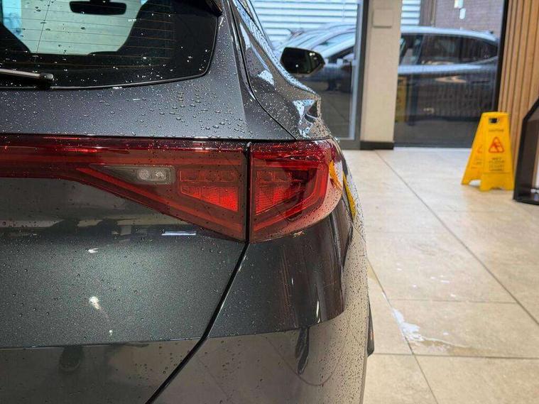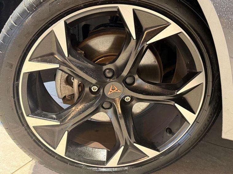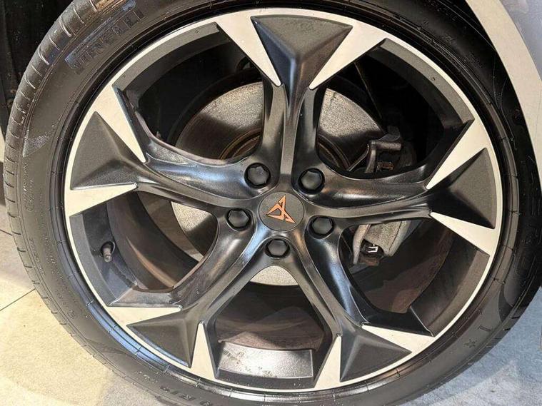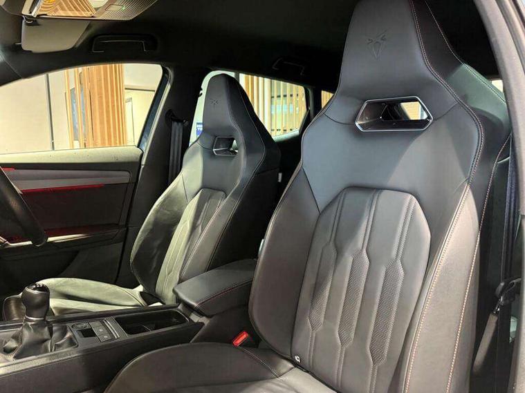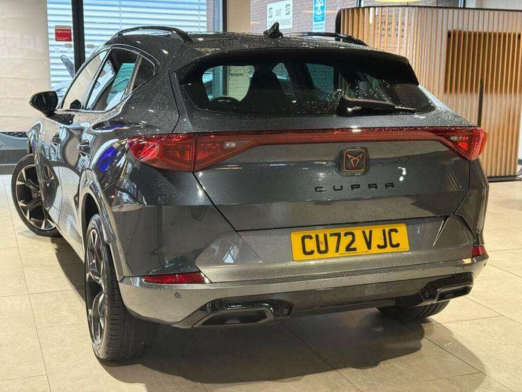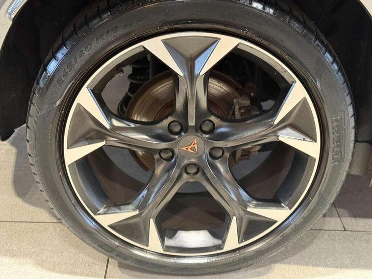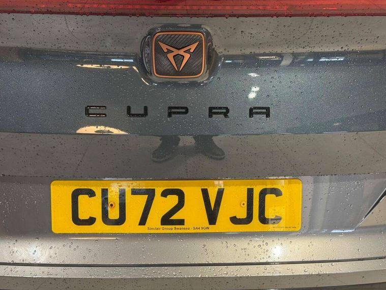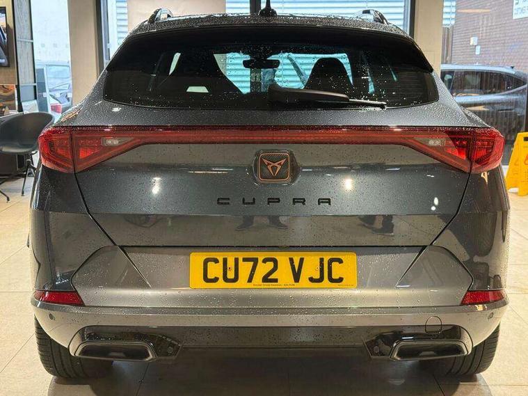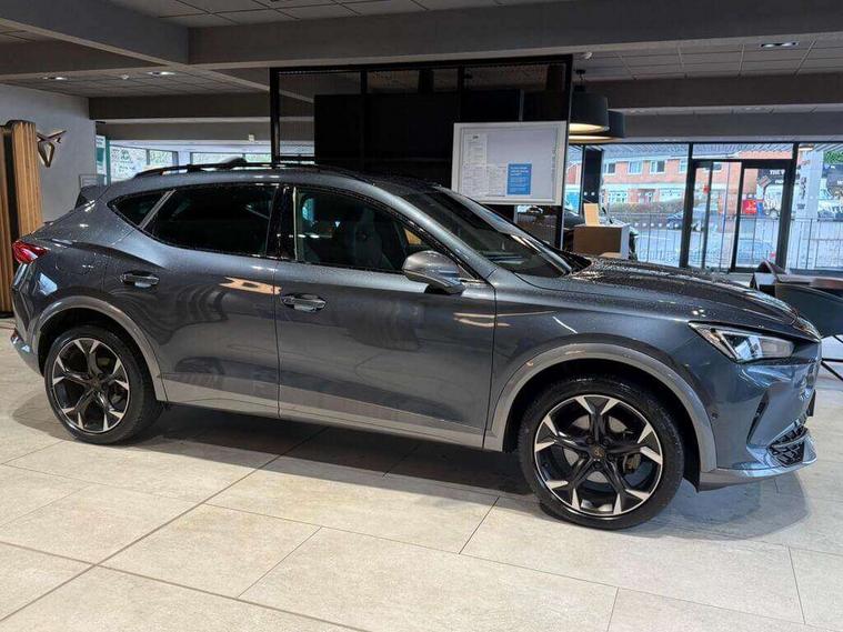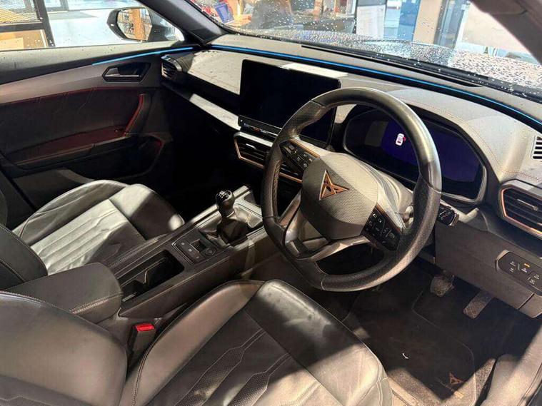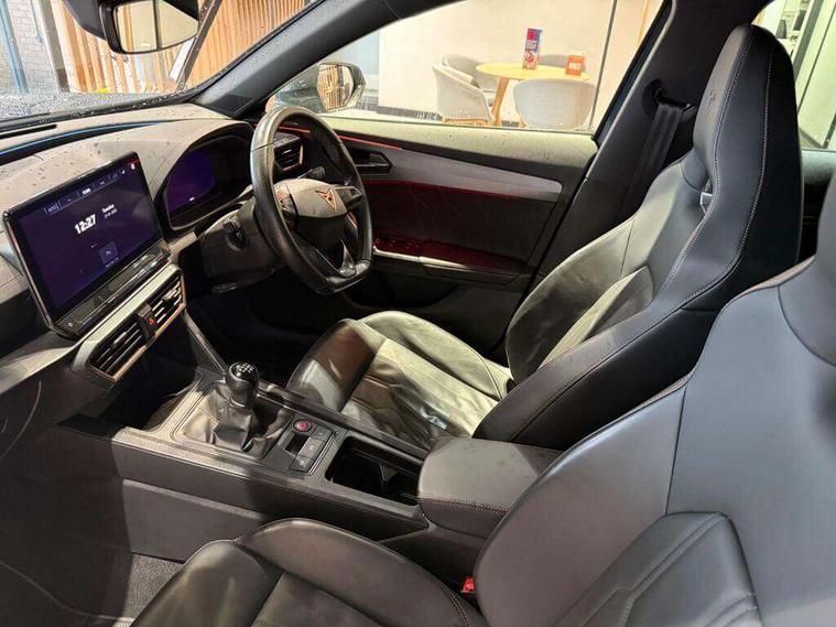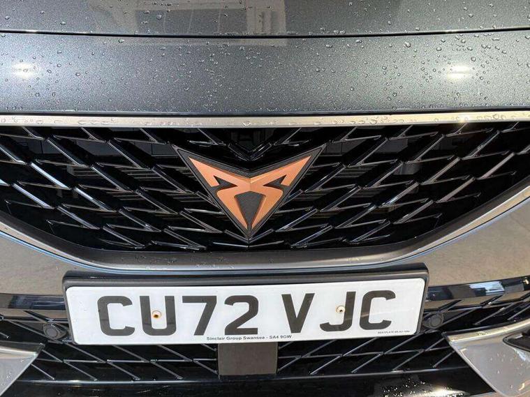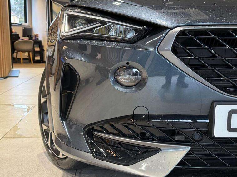 Digital cockpit and configurable dashboard, Driver alert system, Driving profile selection, E-call, Forward collision warning with automatic braking, Lane assist, Navigation system with 12'' Touchscreen Display, Park assist (inc front/rear parking sensors), PAS, Predictive adaptive cruise control with speed limiter, Rear view camera, RPM, trip computer, outside temp gauge, instrument light brightness, low fuel warning light, lights on reminder, gearshift indicator, Service interval indicator, Start/stop system with regenerative braking, Voice control system, Wireless apple carplay, Wireless phone charger, Electronic locking differential and dynamic traction support, Standard suspension, 2 front and 2 rear USB type C sockets, Auxiliary input socket, DAB radio, Auto dimming rear view mirror, Body colour door handles, Body coloured bumpers, Dark grey wing mirror, Daytime running light with automatic headlight control and coming home feature, Dynamic headlight range control, Electric front/rear windows, Electrically adjustable heated and folding door mirrors with memory function, Front fog lamps with cornering function, Gloss black roof rails and window surrounds, LED Headlights, LED Taillights with dynamic indicator, Rain sensing wipers, Rear diffuser with black simulated exhaust pipes, Rear side wing doors, Rear wash/wipe, Third brake light, Tinted rear windows, Welcome lights, 12v power supply in centre console, 12V socket, 12v socket in loadspace, 2 front and 2 rear reading lights, 230V socket, 3 seat bench in 2nd row, 60/40 split rear bench seat with armrest and mechanical seat release, Black headlining, Dust/pollen filter, Front and rear head restraints, Front centre armrest, Height/reach adjust steering wheel, Illuminated interior front door sills, Illuminated sunvisor with mirror, Isofix, Leather multi function steering wheel, Luggage tie-down hooks, Single front passenger seat, Three zone climate control with control panel in rear, Variable luggage/load compartment floor, Wraparound lighting, Genuine Nappa leather Pack - Cupra, Safety and driving pack (M) - Formentor, 3 point seatbelts on all rear seats, ABS, Brake control system - ESC and brake booster, Child proof door locks, Driver and front passenger airbags with front passenger airbag de-activation, Electronic parking brake, Front and rear disc brakes, Front side curtain airbags, Hill hold control, Seat belt reminder for front and rear seats, Tyre pressure monitoring system, Anti theft alarm system, Keyless entry and start system (KESSY), Locking wheel bolts, Copper and aluminium interior detailing, 19" 'Exclusive' machined sport matte black and silver alloy wheels,