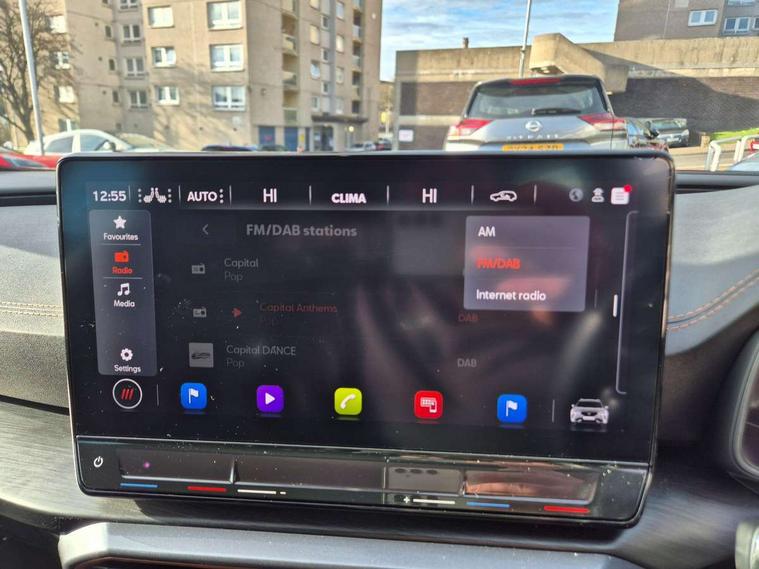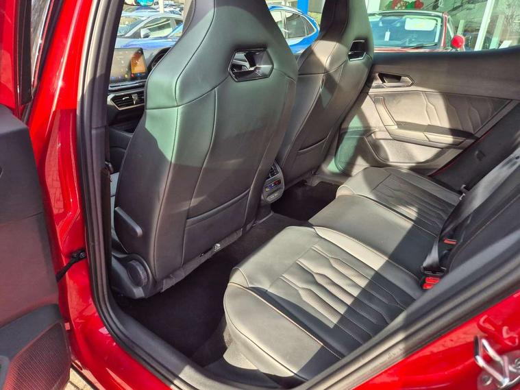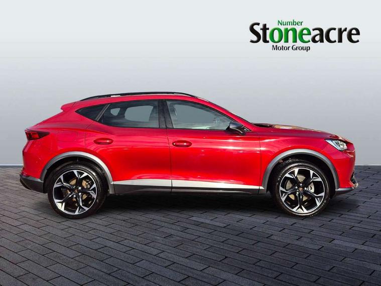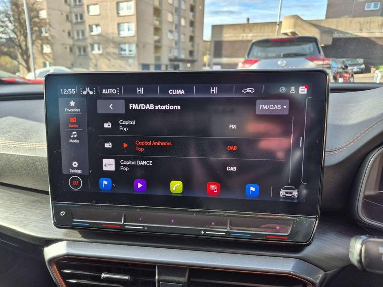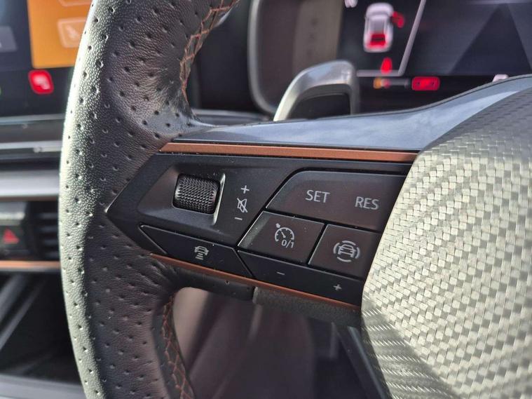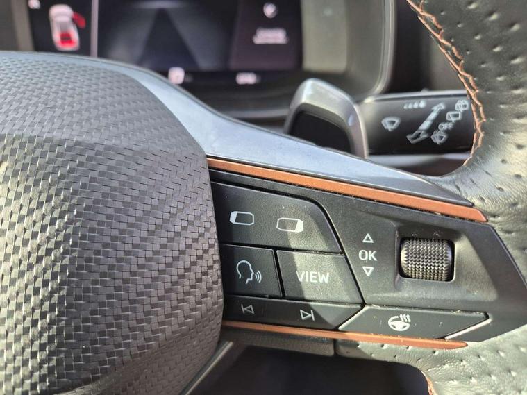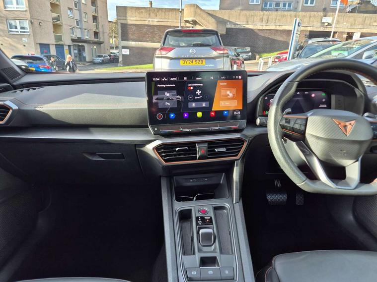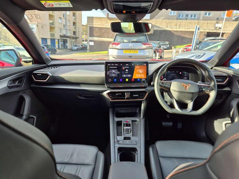 Digital cockpit and configurable dashboard, Driver alert system, Driving profile selection, Forward collision warning with automatic braking, Lane assist, Navigation system with 12'' Touchscreen Display, Park assist (inc front/rear parking sensors), PAS, Predictive adaptive cruise control with speed limiter, Rear view camera, RPM, trip computer, outside temp gauge, instrument light brightness, low fuel warning light, lights on reminder, gearshift indicator, Service interval indicator, Start/stop system with regenerative braking, Voice control system, Wired Android Auto, Wireless apple carplay, Wireless phone charger, Electronic locking differential and dynamic traction support, Standard suspension, 2 front and 2 rear USB type C sockets, Auxiliary input socket, DAB radio, Auto dimming rear view mirror, Body colour door handles, Body coloured bumpers, Dark grey wing mirror, Daytime running light with automatic headlight control and coming home feature, Dynamic headlight range control, Electric front/rear windows, Electrically adjustable heated and folding door mirrors with memory function, Front fog lamps with cornering function, Gloss black roof rails and window surrounds, LED Headlights, LED Taillights with dynamic indicator, Rain sensing wipers, Rear diffuser with black simulated exhaust pipes, Rear side wing doors, Rear wash/wipe, Third brake light, Tinted rear windows, Welcome lights, 12v power supply in centre console, 12V socket, 12v socket in loadspace, 2 front and 2 rear reading lights, 230V socket, 3 seat bench in 2nd row, 60/40 split rear bench seat with armrest and mechanical seat release, Black headlining, Dust/pollen filter, Front and rear head restraints, Front centre armrest, Height/reach adjust steering wheel, Illuminated interior front door sills, Illuminated sunvisor with mirror, Isofix, Leather multi function heated steering wheel with gear shift paddles, Luggage tie-down hooks, Single front passenger seat, Three zone climate control with control panel in rear, Variable luggage/load compartment floor, Wraparound lighting, Genuine Nappa leather Pack - Cupra, 3 point seatbelts on all rear seats, ABS, Brake control system - ESC and brake booster, Child proof door locks, Driver and front passenger airbags with front passenger airbag de-activation, Electronic parking brake, Front and rear disc brakes, Front side curtain airbags, Hill hold control, Public e-call, Seat belt reminder for front and rear seats, Tyre pressure monitoring system, Anti theft alarm system, Keyless entry and start system (KESSY), Locking wheel bolts, Copper and aluminium interior detailing, 19" 'Exclusive' machined sport matte black and silver alloy wheels,