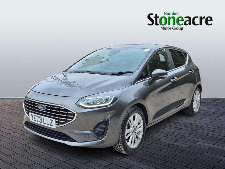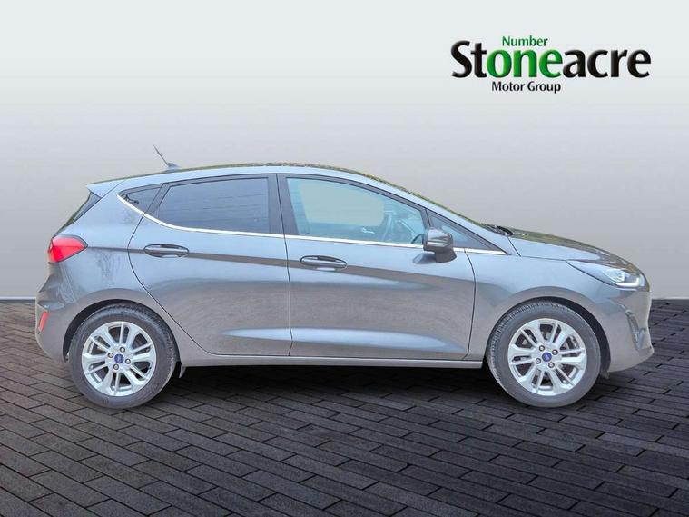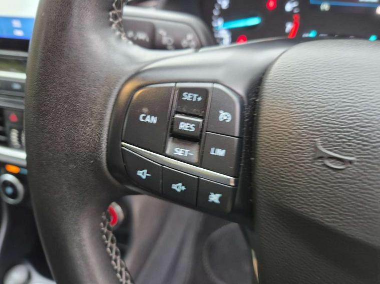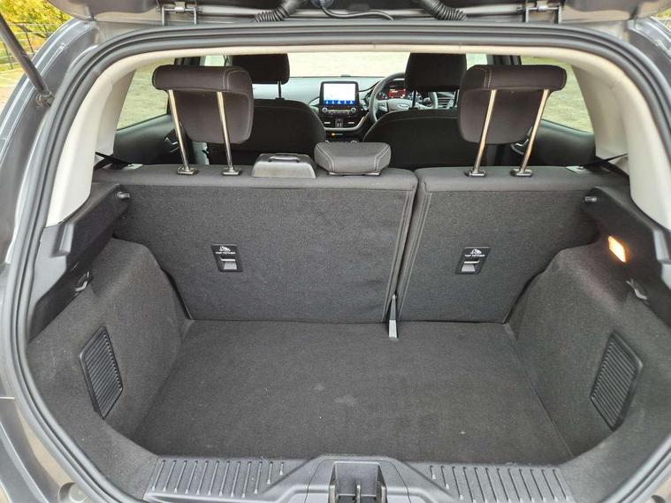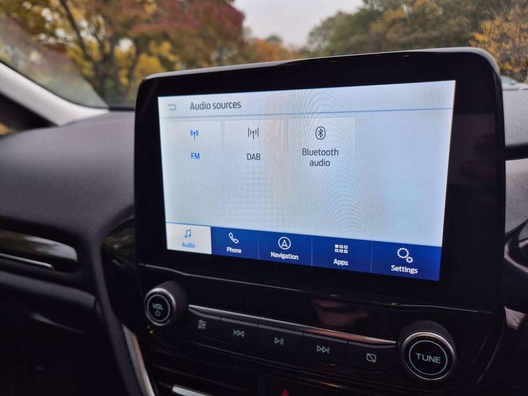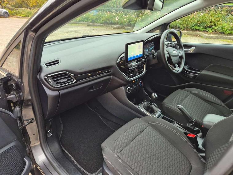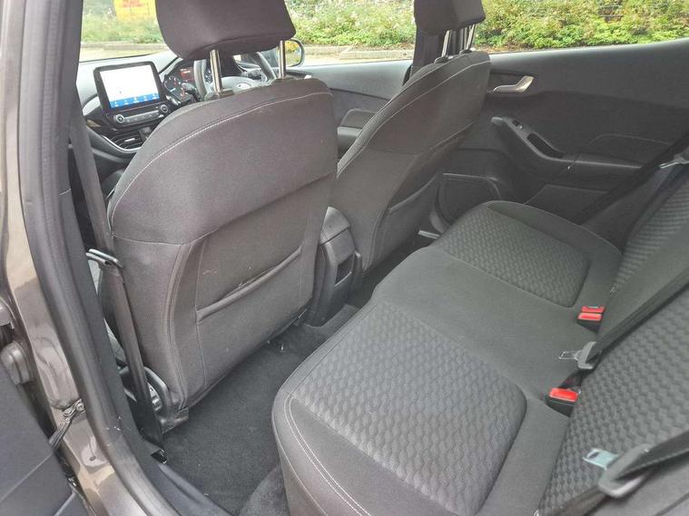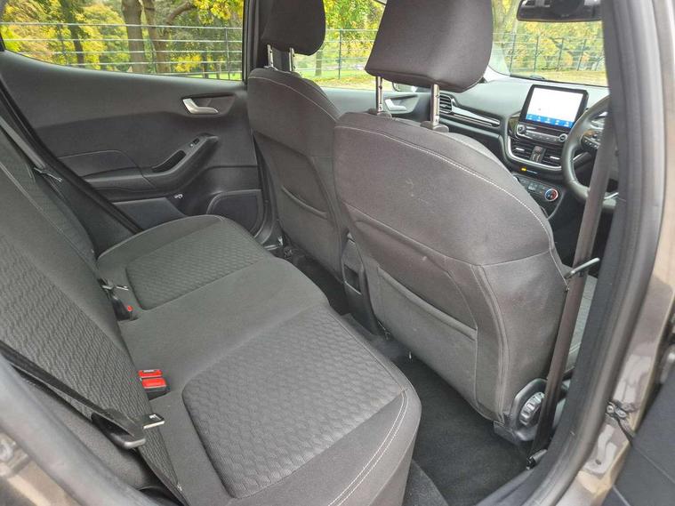 Bluetooth system, Electric power steering, Ford easy fuel, Ford SYNC 3 Navigation system incl 8" touchscreen, 7 speakers, FordPass connect, Apple carplay, android auto, voice control and emergency assistance, Rear parking distance sensors, Selectable drive modes (Normal, Sport, Track), Trip computer, 2 USB ports, Auxiliary input socket, DAB Digital radio, Steering wheel mounted controls, Body colour bumpers, Body colour door handles, Body colour rear spoiler, Body coloured electrically operated and heated door mirrors with side indicators, Chrome beltline trim, Chrome front grille, Chrome lower window surround, Cornering front fog lights, Electric front windows/one touch facility, Electric rear windows, Quickclear heated windscreen, Rain sensing wipers and auto dimming rear view mirror, Rear privacy glass, Rear wiper, 3 spoke leather trimmed steering wheel with audio control, 60/40 split folding rear seat, Adjustable head restraints, Boot carpet, Centre console with opening armrest, 2x cupholders, 12v and USB, Chrome inner door handles, Cloth upholstery, Footwell illumination, Front floor mats in velour, Front map reading lights, Front seat and rear pockets, Illuminated glovebox, Leather gaiter, Load area light, Luxury woven headliner, Manual 2 way passenger seat adjust, Manual 4-way driver seat adjust, Manual air conditioning, Overhead console with sunglasses holder, Pollen filter, Rake/reach adjustable steering wheel, Sensico wrapped steering wheel, NCAP Pack - Fiesta, 3 point seatbelts on all rear seats, ABS+EBA, Curtain airbags, Driver and passenger airbags, Drivers knee airbag, Electronic stability control with hill start assist, Front passenger airbag deactivation, Front side airbags, Seatbelt warning, Two tone horn, Tyre pressure monitoring system, Keyless start with 'Ford Power' starter button, MyKey system, Remote central locking & engine immobiliser, Thatcham Cat.1 alarm, 16" 10 spoke alloy wheels,