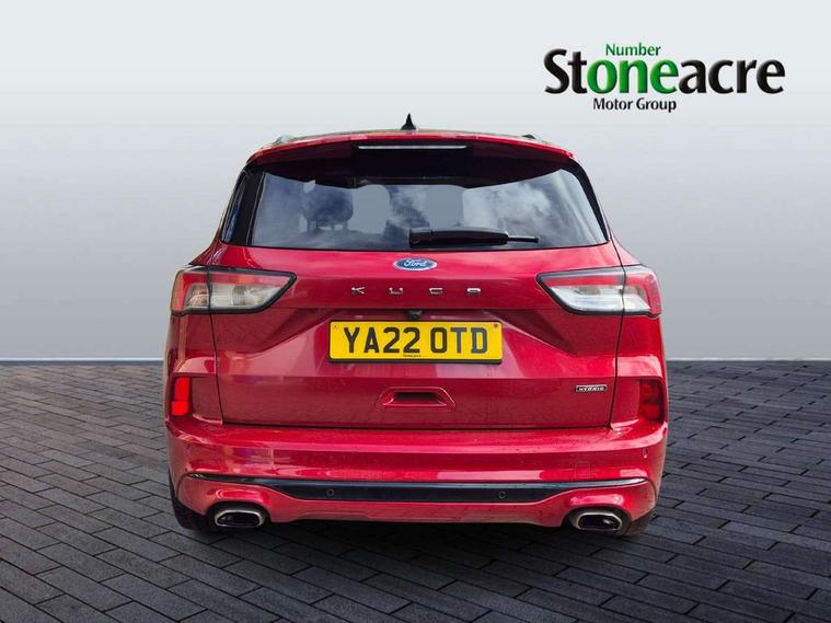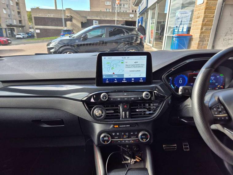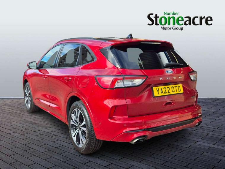 Driver impairment monitor, Ford easy fuel, Ford SYNC 3 with 8" colour touchscreen, App Link, andriod auto/apple carPlay and navigation with Ford pass connect, Front and rear parking sensors, Hands free power tailgate, Intelligent speed assist, Lane keeping aid with lane departure warning, Mobile phone wireless charging pad, Power assist steering, Selectable drive modes, 3-Pin Home charge cable (230V/16A Domestic socket), Sports suspension, Ford DAB audio system with 6 speakers, Auto dimming rear view mirror, Auto headlamps with high and low beam, Auto wipers, Black roof rails, Front LED fog lights with cornering function, Full LED headlamps, Large rear spoiler, LED daytime running lights, LED rear lights, Power folding heated door mirrors with puddle lights, Power front/rear windows with global close, Power opening panoramic roof, Privacy glass, Quickclear heated windscreen, ST Line body styling kit with unique front and rear fascia and bumper, rear painted diffuser, front painted skid plates, dark mesh upper grille, ST Line front scuff plates, Twin exhausts, 10 way power adjustable drivers seat, 2nd row sliding seats, 8 way manual passenger seat including lumbar support and height adjust, Alloy pedals, Ambient lighting, Centre console with electronic parking brake, Dark headlining and pillars, Dual electronic automatic temperature control, Flat bottomed leather steering wheel in sensico with red stitching, Front and rear head restraints, Heated passenger and driver seats, Rear charging point, Sensico partial premium leather upholstery, Sports seats, ST Line front and rear floor mats, B&O with large instrument cluster pack - Kuga, 3x3 point rear seatbelts, Airbags - front driver/passenger, front and rear curtain, Drivers knee airbag, Electronic stability control (ESC) and ABS, Ford MyKey Gen 2 safety system, Post collision braking, Powered child proof rear door locks, Pre collision assist with autonomous emergency braking, Red brake calipers, Tyre pressure monitoring system, Engine immobiliser, Keyless entry, Keyless start with 'Ford Power' starter button, Locking wheel nuts, Remote powered central double locking doors, Thatcham category 1 alarm,