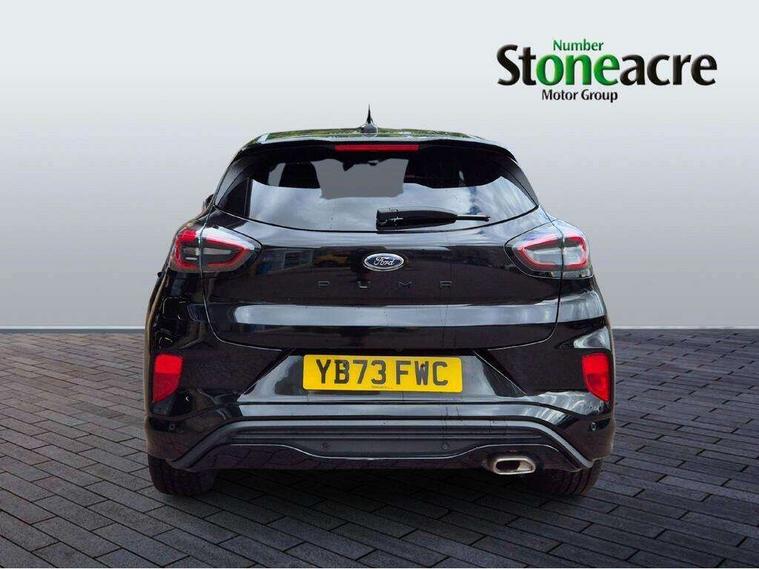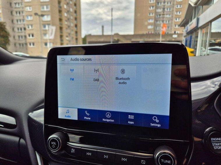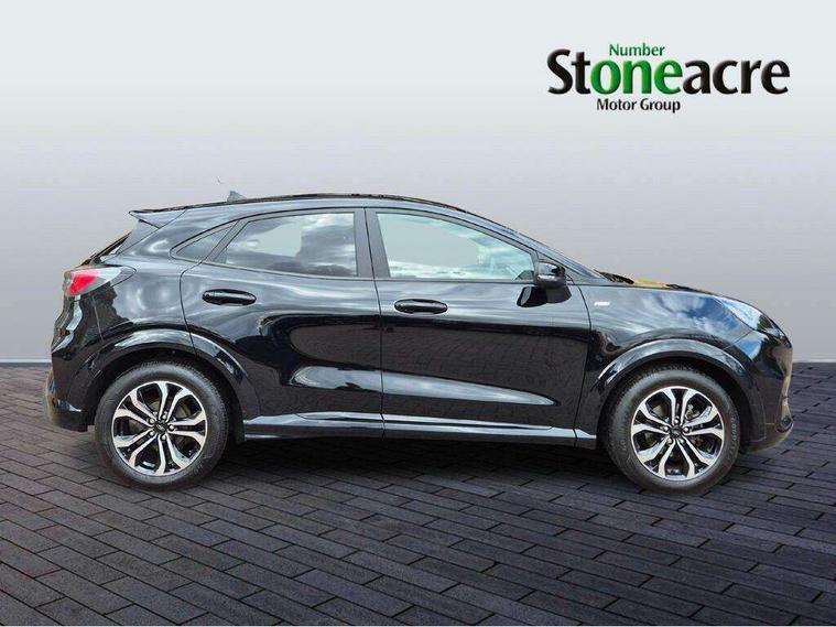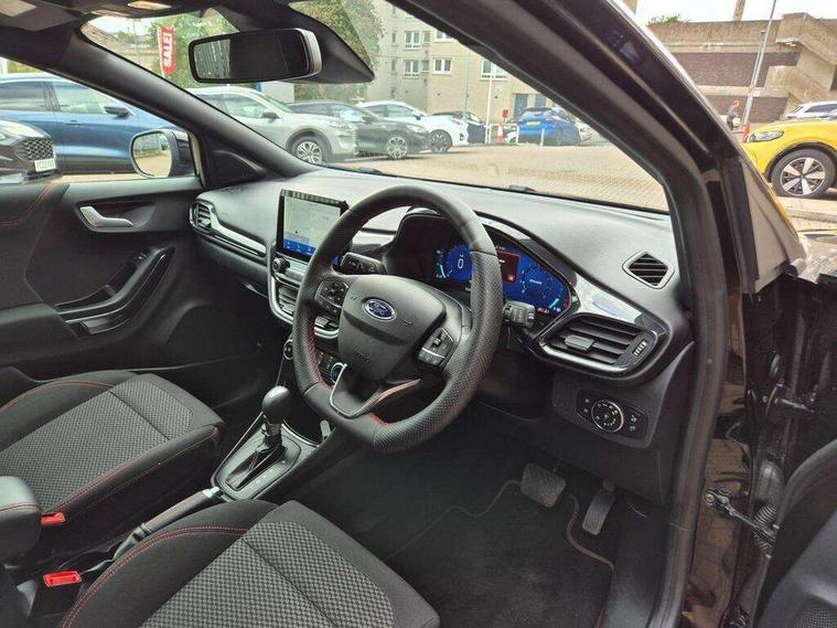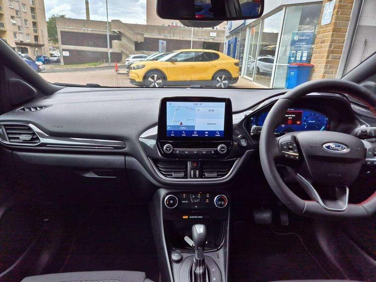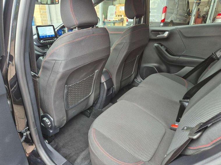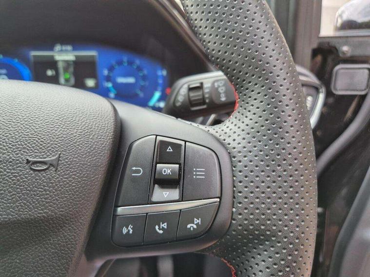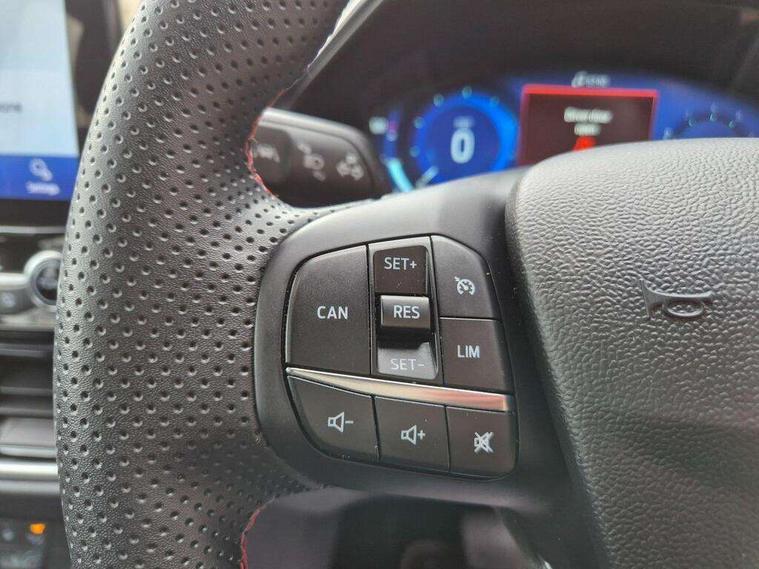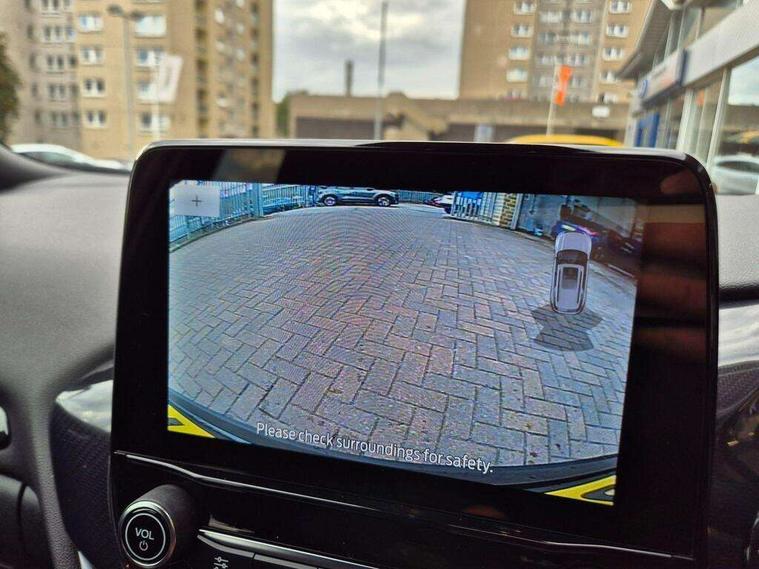 Driver impairment monitor, Emergency call service, Ford easy fuel, Full digital 12.3" instrument cluster, Lane keeping aid with lane departure warning, Power assist steering, Power start button, Rear parking sensor, Selectable drive modes(Normal, sport, Eco, trail, slippery), Speed sign recognition, Sport suspension, Automatic headlights with auto high beam, Automatic rain sensing wipers, LED rear lamps, Power foldable heated door mirrors with puddle lamps, Projector headlamps with LED day time running lights and front fog lamps, Quickclear heated windscreen, Rear side wing doors, Rear wiper, ST-Line body styling kit with unique grille, Third brake light, 3 seat bench in 2nd row, Centre console with armrest and stowage, Ford megabox extended bootspace, Front and rear head restraints, Front floor mats, Manual 2 way passenger seat adjustment, Manual 4 way driver seat adjust with lumbar adjustment, Single front passenger seat, ST- Line cloth trim with red stitching, ST-Line flat bottomed sensico leather steering wheel with leather handbrake and aluminium gear knob, Ford SYNC 3 navigation pack - Puma, 3 rear seatbelts, Child safety lock, Electronic stability control (ESC) and hill start assist, Pedestrian/cyclist detection & post-collision braking, Pre collision assist system, Tyre pressure monitoring system (TPMS), Thatcham alarm,