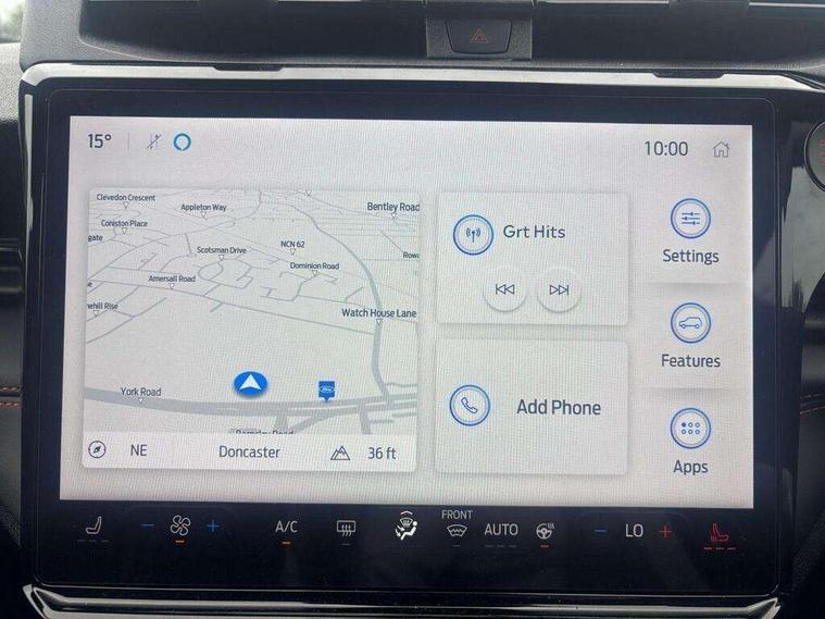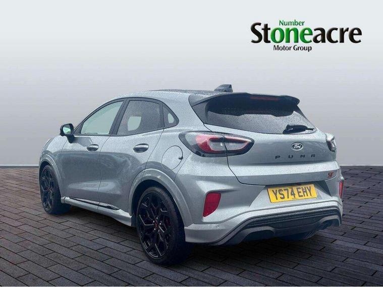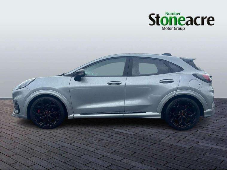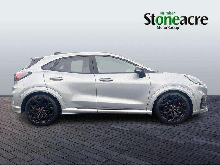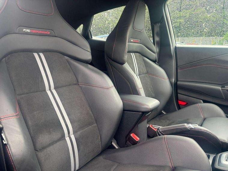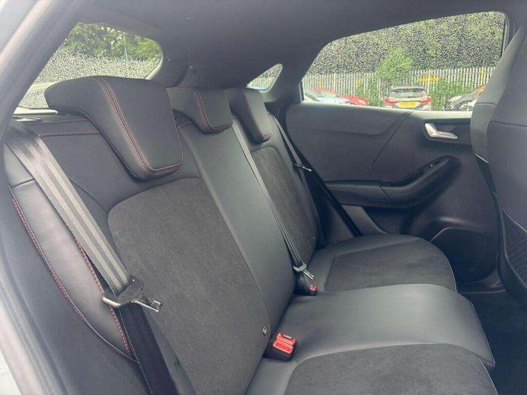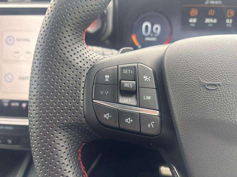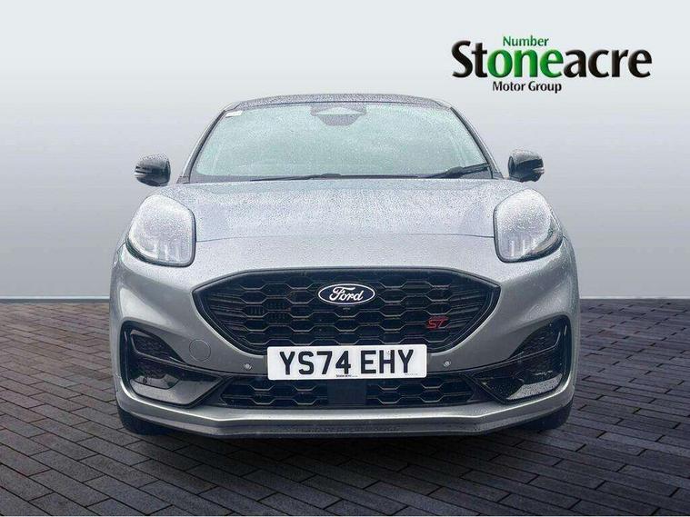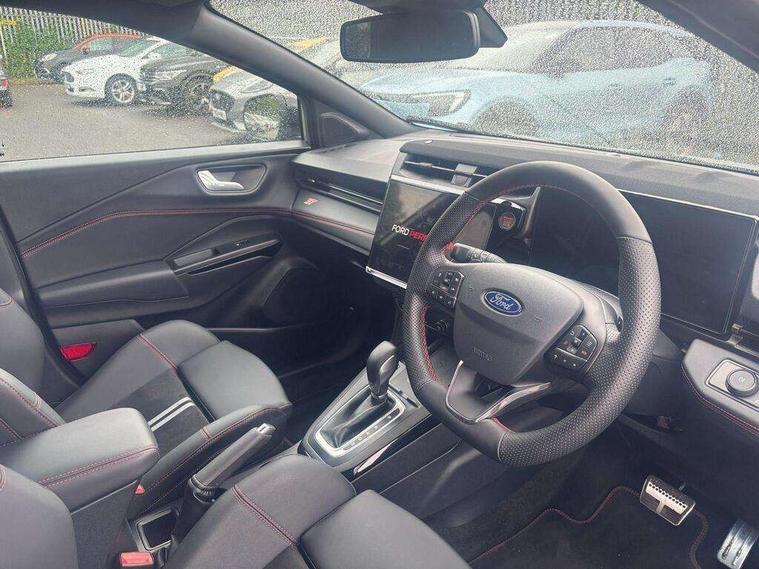 Driver impairment monitor, Emergency call service, Ford easy fuel, Full digital 12.8" instrument cluster, Lane keeping aid with lane departure warning, Power assist steering, Power lift tailgate, Selectable drive modes (normal, sport, eco, track), Speed sign recognition, ST suspension, 12" landscape touchscreen display with wireless apple car play and android auto premium B&O audio system with 10 speakers, Ford pass connect and emergency assistance, Ford SYNC4 with connected navigation, Automatic headlights with rain sensing wipers and auto high beam, Front fog lamps, Glare-free matrix LED headlamps, LED daytime running lights, LED rear lamps, LED third brake light, Power foldable heated door mirrors with puddle lamps and puma logo protection, Quickclear heated windscreen, Rear privacy glass, Rear side wing doors, Rear wiper, Unique ST body styling kit including wing mirrors and Ford Performance embossed splitter, 3 seat bench in 2nd row, Centre console with armrest and stowage, Electronic automatic temperature control (EATC), Ford megabox extended bootspace, Ford Performance seats premium synthetic leather upholstery, Front and rear head restraints, Front floor mats, Manual 6 way driver seat adjust with lumbar adjustment, Manual 6 way passenger seat with lumbar seat adjustment, Single front passenger seat, ST flat bottomed steering wheel with metal grey stitching, Driver assistance pack with blind spot information system - Puma for automatic transmission, Winter pack - Puma, 3 rear seatbelts, Child safety lock, Electronic stability control (ESC) and hill start assist, Pre-collision assist with autonomous emergency braking, pedestrian/cyclist detection & post-collision braking, Red brake calipers, Tyre pressure monitoring system (TPMS), Keyless entry and power start button, Keyless start and wireless charger, Thatcham alarm, 19" alloy wheels with magnetite dark finish, Tyre inflation kit,