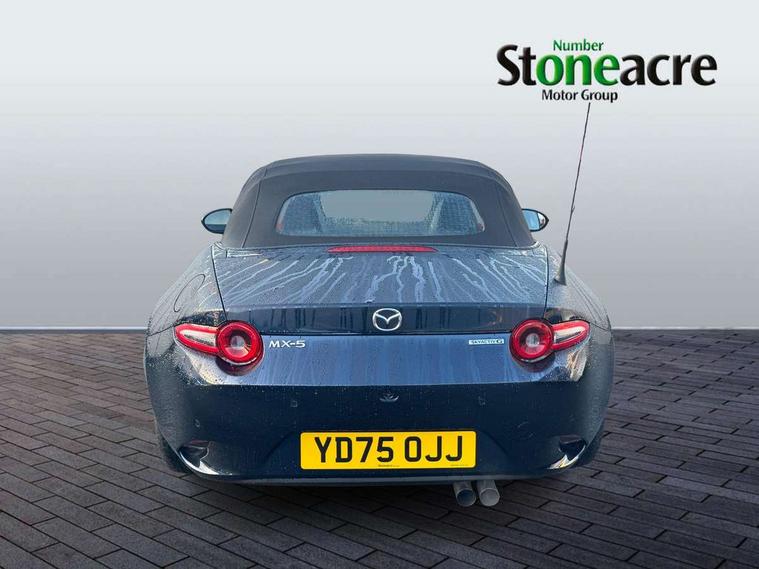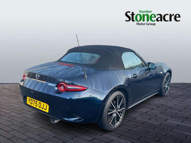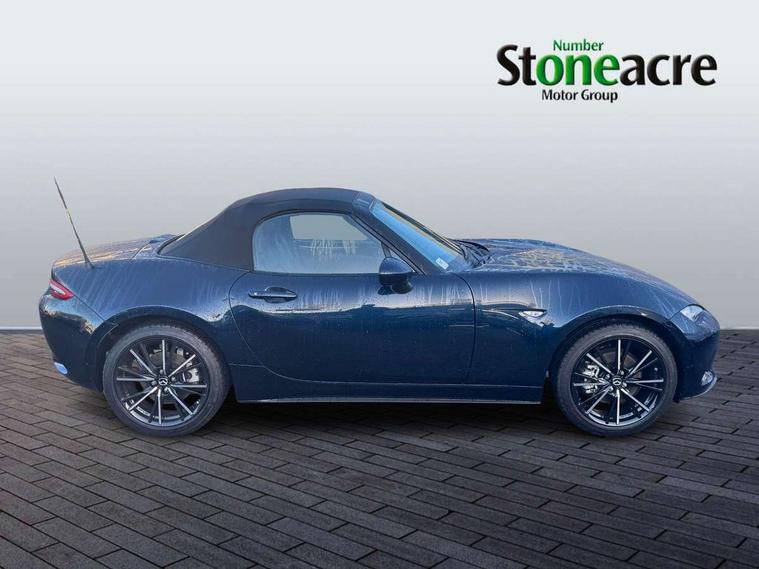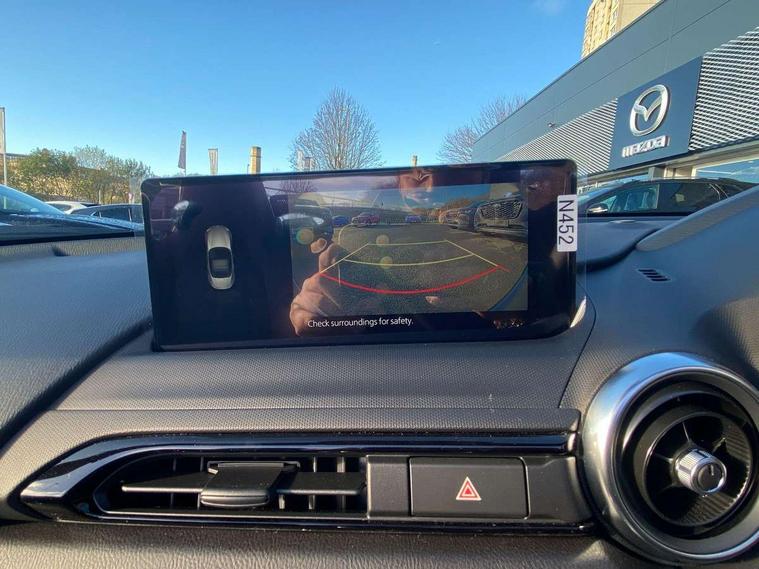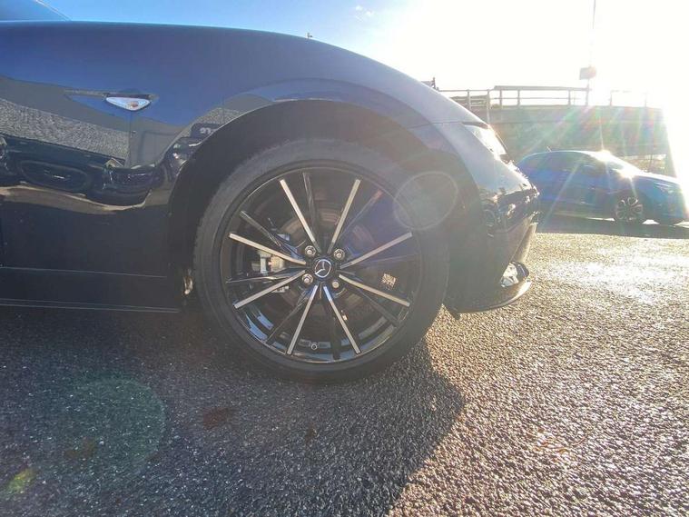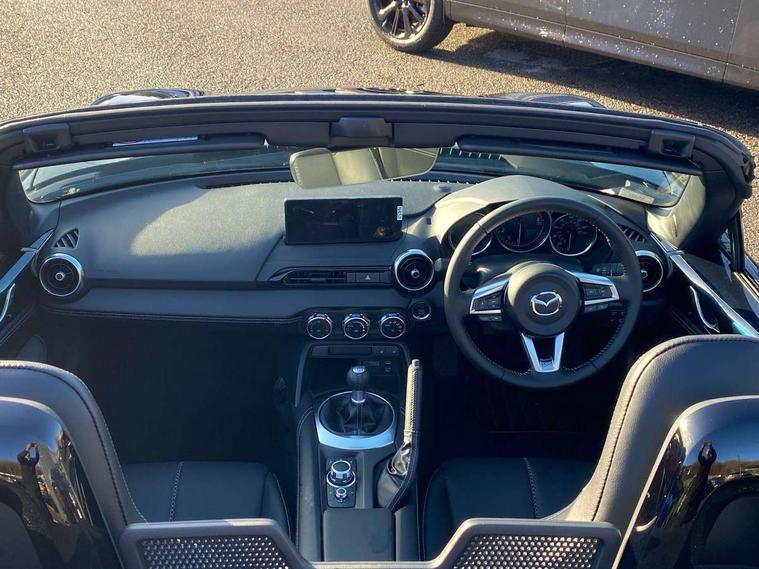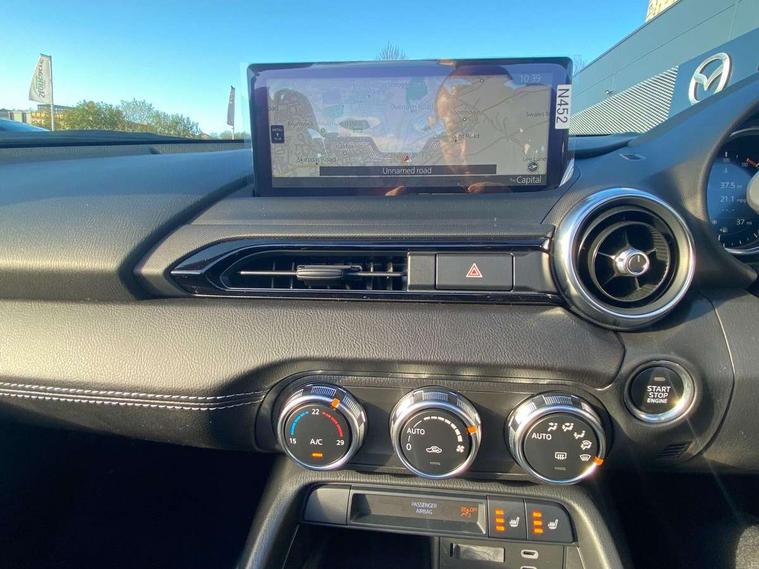 8.8" Colour centre touch screen display with Mazda Connect infotainment, Aha and stitcher app, Analogue speedometer, Apple car play/Android Auto, Blind spot monitoring with rear cross traffic alert, Cruise control with Intelligent speed assist, Driver alert system, eCall emergency call system, Emergency stop signalling system, Engine start/stop button, Hands free phone preparation, Integrated bluetooth with hands-free calling, bluetooth audio and easy access to phone contacts, Integrated navigation system, Kinematic posture control, Lane departure warning system, Lane keep assist, Multi dot display tachometer and electric odometer, PAS, Rear parking sensor, Reversing camera, Service indicator, Traffic sign recognition, Trip computer, Water temperature gauge, Asymmetric limited slip differential, I-ELOOP, i-stop, Sports suspension featuring Bilstein dampers, 2 x USB Type-C inputs, Multimedia Commander including separate volume dial, Premium Bose sound system with 9 speakers with 2 in each front headrest, AM/FM/DAB radio and MP3, Steering wheel mounted audio/bluetooth controls, Adaptive LED Headlights, Automatic headlamp levelling, Black scuff plates with stainless steel insert, Body colour bumpers, Body colour co ordinated interior upper door trim, Body coloured electric/heated door mirrors, Coming/leaving home lighting function, Dual exhaust pipes, Dusk sensitive headlamps, Electric front windows/one touch facility, Exterior body colour co ordinated upper door panel trim with black vinyl and silver stitching, Frameless auto dimming rear view mirror, Front intermittent wipers, LED 3rd brake light, LED daytime running lights, LED indicator lights, LED rear lights, Manually operated black premium cloth soft top with heated rear glass window, Piano Black fashion bars, Rain sensing front wipers, Rear boot, 12V socket, Centre console storage box, Chrome Air conditioning dials, Climate control air conditioning, Coin Box, Driver and front passenger sunvisors with covered vanity mirror and driver ticket holder, Driver seat manual slide, recline and tilt adjustment, Front centre armrest, Front head restraints, Gear shift indicator, Heated front seats, in 3 heat levels, Interior courtesy light, ISOFIX front passenger seat child seat compliance, Leather gear knob, Leather handbrake lever, Leather steering wheel, Lockable rear centre box with lid, Passenger seat + manual slide/recline adjust, Perforated leather upholstery, Single front passenger seat, Strut brace, Tilt/telescopic steering column, Two cupholders, Windblocker, 3 point ELR front seatbelts with pretensioners, ABS+Electronic Brake force Distribution, Deployable Hood System (DHS), Driver and passenger seatbelt reminder audible warning, Dynamic stability control with track mode, Exit warning, Front dual stage driver and single stage front passenger airbags, Front smart city brake support with autonomous emergency braking (SCBS), Hill hold assist, Passenger airbag deactivate switch, Side airbags, Smart city brake support - Rear (SCBS-R), Traction control, Tyre pressure monitor, Remote central locking with deadlocking and remote boot release, Smart keyless entry, Superlocking, Thatcham category 1 alarm + immobiliser, Centre Console - Vinyl leather, Chrome air vent surrounds, Dashboard panel - Black Vinyl, 17" Black machined alloy wheels, Tyre puncture repair kit,