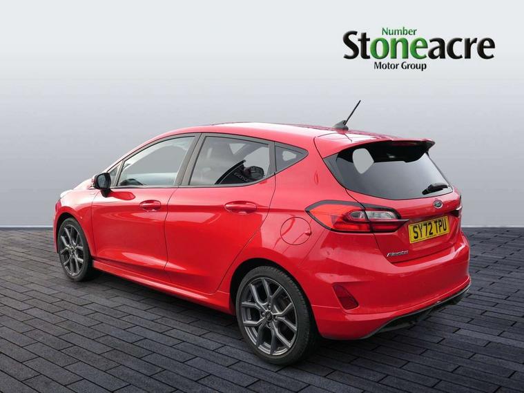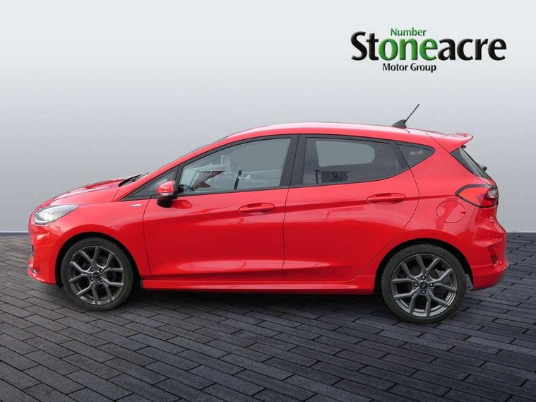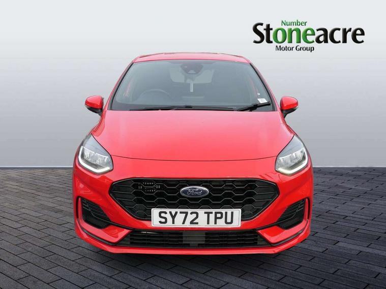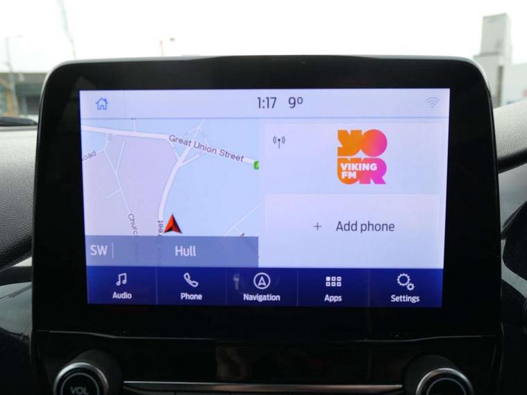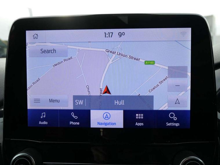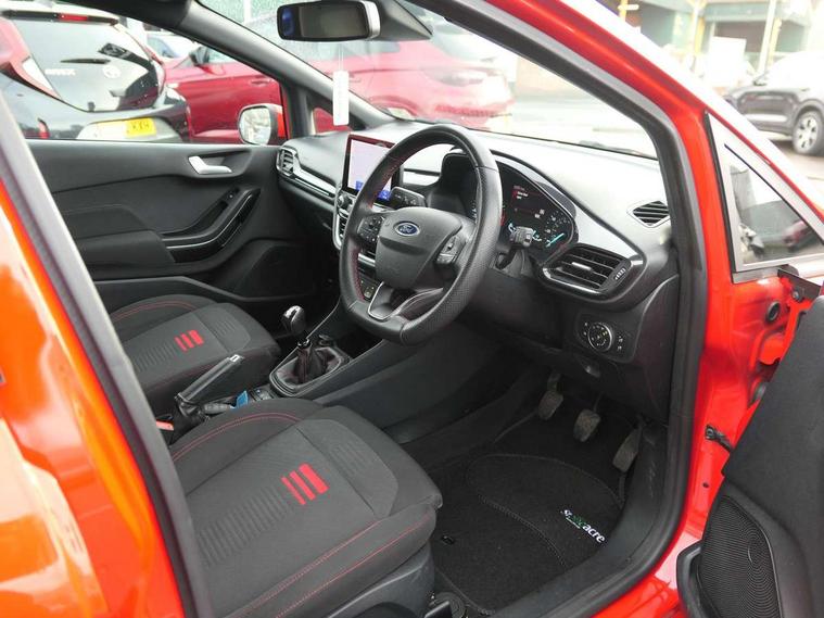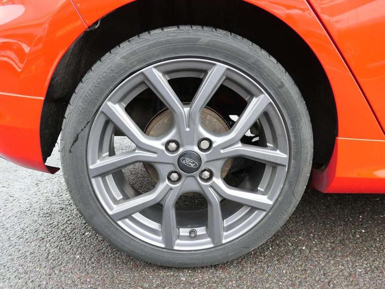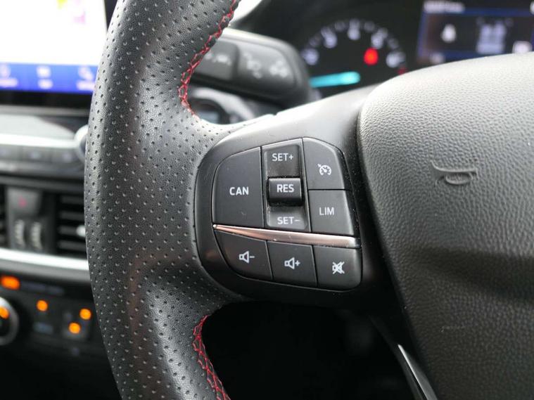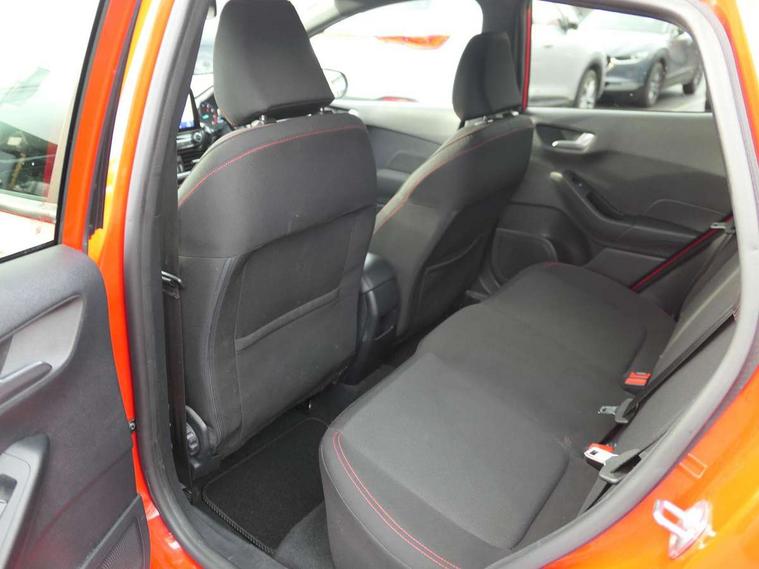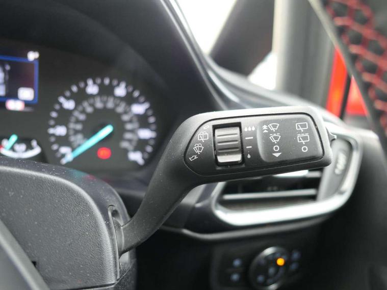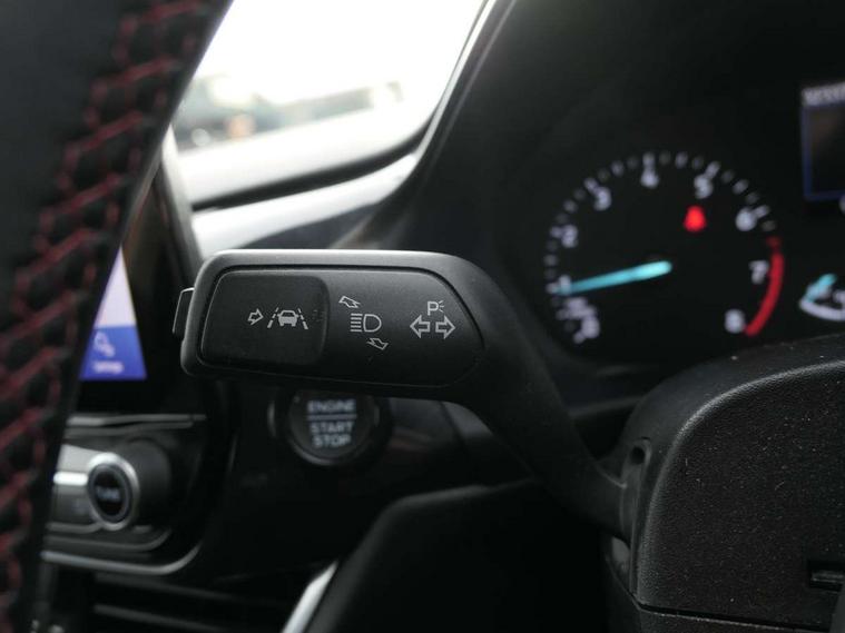 4.2" Colour TFT Ice blue illumination analogue cluster, Driver alert system, Electric power steering, Ford easy fuel, Lane keep assist, Lane keeping aid, Rear parking distance sensors, Selectable drive modes (Normal, Sport, Track), Trip computer, Sports suspension, 3rd brake light, Auto high beam, Automatic headlights, Body colour bumpers, Body colour large rear spoiler, Body coloured electrically operated with side indicators, Electric front windows/one touch facility, Electric rear windows, Quickclear heated windscreen, Rain sensing wipers and auto dimming rear view mirror, Rear privacy glass, Rear side wing doors, Rear wiper, Unique ST-Line grille, full bodystyling kit and large body coloured rear spoiler, 3 rear headrests, 3 seat bench in 2nd row, Adjustable head restraints, Black headlining, Centre console with opening armrest, 2x cupholders, 12v and USB, Cloth upholstery with red stitching, Leather gear knob, Manual 2 way passenger seat adjust, Manual 4-way driver seat adjust, Manual air conditioning, Premium floor mats, Sensico wrapped steering wheel, Single front passenger seat, 3 point seatbelts on all rear seats, Electronic stability control with hill start assist, Front and rear seat belt warning, Manual child lock in rear doors, Tyre pressure monitoring system, Keyless start with 'Ford Power' starter button, MyKey system, Remote central locking, Thatcham alarm with power door dead locks, 17" 5x2 spoke alloy wheels with rock metallic finish,