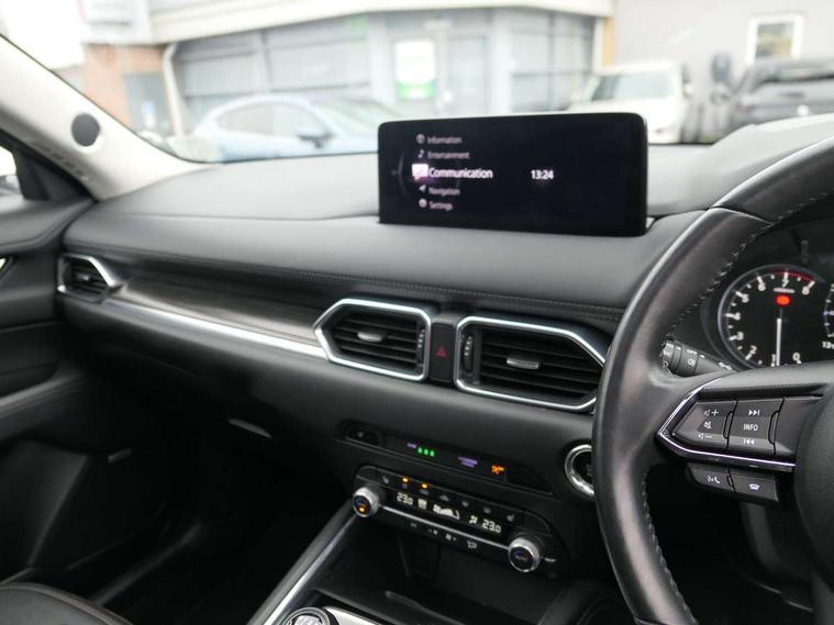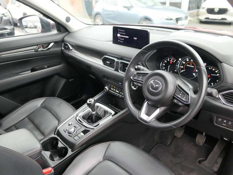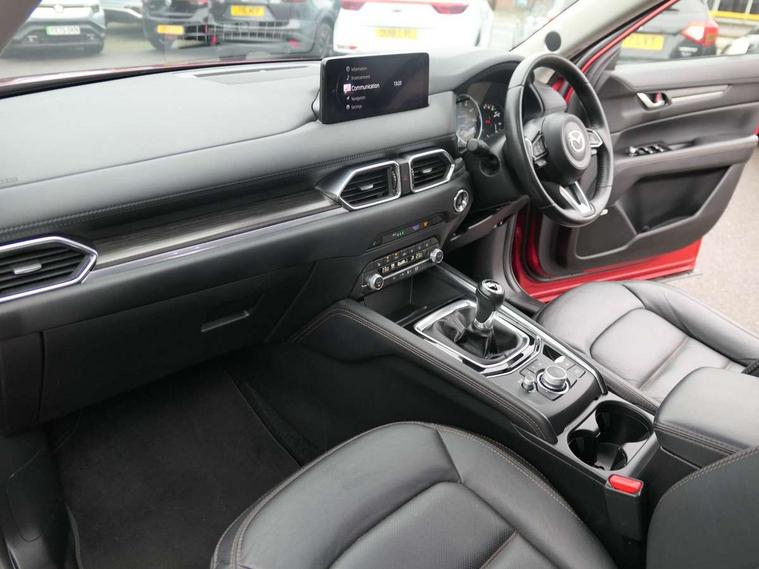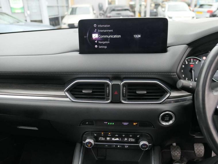10.25" display with Mazda Connect infotainment, 7" colour TFT display, Apple car play/Android Auto, Blind spot monitoring with rear cross traffic alert, Bluetooth connectivity with voice control, Collision prevention assist, Connected services, Cruising Traffic Support, Electric power steering, Emergency stop signalling system, Engine start/stop button, Forward collision warning, Front and rear parking sensors, Integrated navigation system, Intelligent speed assist, Lane departure warning system, Lane keep assist, Qi wireless phone charging, Radar cruise control, Reversing camera, Service indicator, Traffic sign recognition (TSR), Trip computer, Windscreen projected colour active driving display (HUD) with memory, Cylinder Deactivation, i-stop, 2 USB sockets in rear, 2x USB sockets in front, AM/FM radio, Bluetooth audio streaming, Bose premium sound system with 10 speakers, DAB Digital radio, Multimedia Commander including separate volume dial, Steering wheel mounted audio controls, Adaptive front lighting system, Auto dimming rear view mirror, Automatic headlights, Black inlay dashboard panel, Body colour door mirrors, Body colour roof spoiler, Body coloured front and rear black lower bumper mouldings, Bright finish signature wing, Coming/leaving home lighting function, Door mirror integrated indicators, Dual chrome tailpipes, Dusk sensitive headlamps, Electric front/rear windows with one touch auto up/down, Front grille in gloss black finish, Gloss black B and C pillars garnish, High beam assist, Intermittent rear wash/wipe, LED auto levelling, LED daytime running lights, LED front fog lights, LED Headlights, LED third brake light, Power folding and heated door mirrors, Power tilt/slide sunroof, Privacy glass (rear side windows only), Rain sensing front wipers, Rear side wing doors, Satin black side mouldings, Scuff plates, Shark fin antenna, Signature LED rear combination lights, Vinyl with wood grain metal inlay door trim panel, Windscreen wiper de-icer, 12v electrical power outlet, 3 seat bench in 2nd row, 3 stage heated front seats, 40:20:40 Karakuri fold-flat seat system, 6 way electric adjustable passenger seat, 8 way electric driver seat with lumbar support + memory, Cargo room flat floor board with waterproof undertray, Driver seat power slide, recline and height adjustment, Driver, Front passenger and two rear grab handles with coat hooks, Driver/passenger front seatback pockets, Driver/passenger sunvisors + illuminated vanity mirrors (drivers with ticket holder), Dual zone climate control, Folding centre armrest with 2 cup holders, Front and rear door pockets, Front centre storage with two cupholders, Front passenger seat power slide, recline and height adjustment, Gear shift indicator, Heated steering wheel, Humidity sensor, Illuminated glovebox, Interior dome light with integral spotlight, ISOFIX child seat anchorage points attached on outer rear seats, Karakuri tonneau cover, Leather upholstery, Leather wrapped steering wheel and gear knob, Light roof lining, Luggage compartment LED lighting, Luggage compartment power outlet, Rear air vents, Rear headrests, Rear seat recline, Roof mounted sunglasses holder, Single front passenger seat, Three height adjustable head restraints, Tilt/height adjustable steering wheel, White interior LED illumination lighting, 3 point front seatbelts with pre-tensioners, 3 rear 3 point seatbelts, ABS, Advanced Smart City Brake Support - SCBS, Child locks on rear doors, Driver and front passenger side airbags, DSTC-Dynamic Stability and Traction Control, Dual front airbags, Electronic brake force distribution, Electronic parking brake with auto hold, ESP, Front and rear curtain airbags, Front passenger airbag deactivation, G-Vectoring control, Hill hold assist, Seatbelt reminder front and rear, Single stage passenger airbags, Smart brake support with forward obstruction warning, Tyre pressure monitoring system, Automatic door locking when moving off, Deadlock, Immobiliser, Power door locks, Remote central locking, Smart keyless entry, Thatcham Cat.1 alarm, 19" diamond cut black alloy wheels, Tyre repair kit,