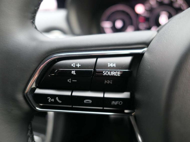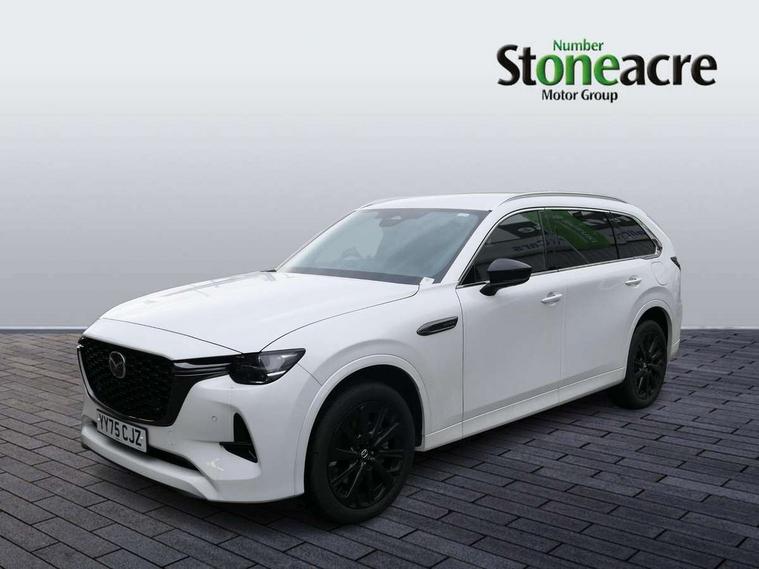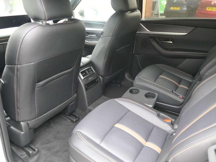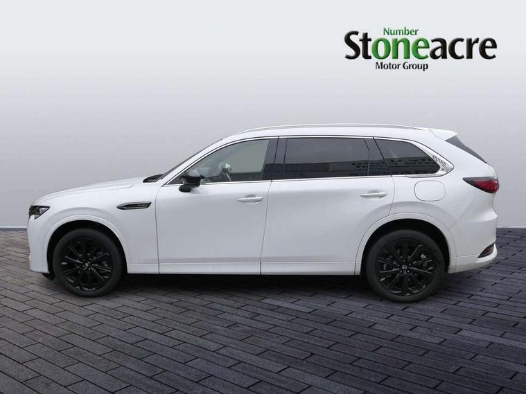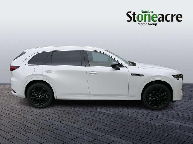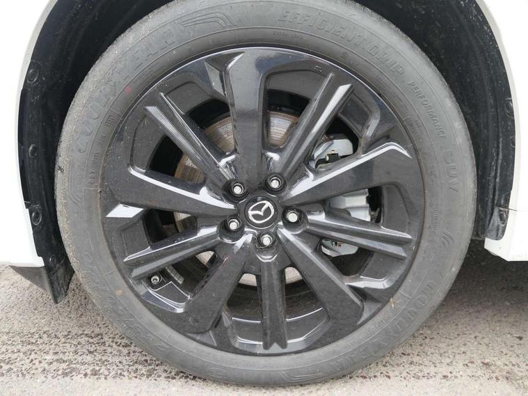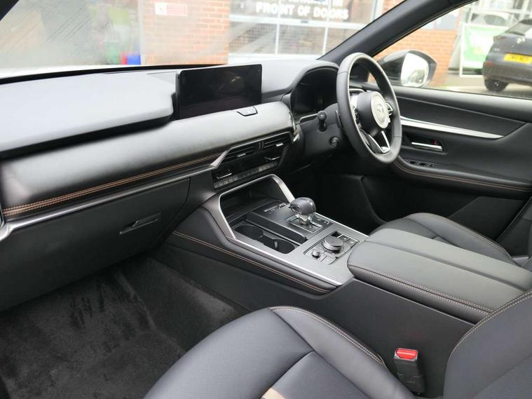 Emergency lane keeping with blind spot assist, Low washer fluid warning light, 12.3" Colour entertainment centre display with mazda connect infotainment, 12.3" TFT Colour display, Adjustable speed limiter, Blind spot assist, Blind spot monitoring with rear cross traffic alert, Cruise control, Distance alert system, Driver attention alert system, Driver Monitoring with personal identification, E-call with GPS, Emergency stop signalling system, Exit warning function, Front and rear parking sensors, Ingress / Egress support and automatic driver position guide, Integrated bluetooth, Intelligent speed assist, Kinematic posture control, Lane keep assist system (LAS) with Lane departure warning system (LDWS), Mazda Driver Personalisation System, Mazda Navigation System with european mapping, Multimedia Commander, PAS, Power lift gate with handsfree function, Power start/stop button, Reversing camera with static guide lines, Speed alert, Traffic sign recognition enhanced with mandated excessive speed warning, Trip computer, Windscreen projected colour active driving display, Wireless apple car play/android Auto, Type 2 Mode 2 cable for AC charging via UK 3-pin plug, 7.2 kw On board Charger, Internal Combustion Engine Sound Emulator, Mi-Drive (Normal, Sport, Off-road, Towing and EV mode), Paddle shift, Type 2 Mode 3 cable for AC charging via home or public charge points, AM/FM and DAB radio, Bose surround sound system with 12 Speaker, Bose center point, Bass match and audio pilot technology, Steering wheel mounted audio/bluetooth controls, USB-C inputs (x2 front and x2 rear), Auto dimming driver's door mirror, Automatic headlight levelling, B-pillar and C-pillar garnishes in piano black finish, Body colour roof spoiler, Body coloured bumpers, Body coloured wheel arch and side mouldings, Coming/leaving home lighting function, Dark plated headlight lense, Dark plating finish signature wing in front grille, Dark plating front side garnish, Differentiated front bumper design to accentuate the intake, Dusk sensing headlights, Electric front/rear windows with one touch auto up/down, Electrically adjustable, heated auto power folding door mirrors with memory, Frameless auto dimming interior rear view mirror, Front kodo turn signal, Front wiper de-icer, Gloss black door mirrors, Headlight washers, High beam control, LED 3rd brake light, LED headlamps, LED rear signature combination lamps, Piano black honeycomb style front grille, Rain sensing front wipers with adjustable sensitivity and speed, Rear side wing doors, Rear wiper, Signature LED daytime running lights, Silver decoration panel, 12v power outlet - front, 12V socket in boot, 2 Heated captains chairs in 2nd row, 2 seat bench in 3rd row, 3 height adjustable rear headrests, 3 seat bench featuring folding centre armrest equipped with two cup holders 2nd row, 50/50 split folding 3rd row rear seats, 60/40 split folding 2nd row rear seats, Ambient lighting, Black roof lining, Cargo net, Door panel trim - Cordovan-like Vinyl leather with matt black hairline film inlay, Driver and front passenger two rear grab handles with rear coat hooks, Driver and front passenger visors with covered vanity mirror and driver ticket holder, Driver seat electric tilt, slide, recline, height and lumbar adjustment, Driver, front passenger and two rear door pockets, Driver/passenger front seatback pockets, Electric telescopic and tilt adjustment steering wheel, Front centre storage with illumination and two cupholders, Front down lamp with front and rear foot lamps, Front headrests, Front passengers seat electric slide, recline, height and lumbar adjustment, Front seat ventilation with 3-stage setting, Glovebox illumination, Heated front seats with 3 stage setting, Heated leather wrapped steering wheel, Heated outer rear seats with 3-stage setting, ISOFIX child seat anchorage points attached on outer rear seats, Leather wrapped gear shift knob, LED illumination luggage compartment, Nappa leather upholstery, Practical and spacious front centre armrest storage, Rear seat recline function for rear passenger comfort, Remote fold down rear seats, Remote pre-heating/cooling, Roof mounted sunglasses holder, Single front passenger seat, Three zone climate control air conditioning with rear air vents for 2nd and 3rd row, 3 point ELR front seat belts x2 with pretensioners, 3 point ELR rear seat belts, Active bonnet, Anti-lock braking system (ABS), Drivers knee airbag, DSC - Dynamic Stability Control, Electronic parking brake with auto disengage function and auto hold function, Front and rear curtain airbags, Front dual stage driver and single stage front passenger airbags, Front passenger airbag cut-off switch, Front side airbags, Front smart city brake support, Hill decent control, Hill launch assist, Manual rear child locks, Seatbelt reminder for driver/front passenger and rear seats, Traction control, Tyre pressure monitoring system (TPMS), Remote central locking with deadlocking and automatic door lock when driving, Smart keyless entry, Thatcham accredited alarm and immobiliser, Dashboard panel - Cordovan-like vinyl leather, Mesh metal film centre console panel, 20" Black metallic alloy wheels, Emergency tyre repair kit,