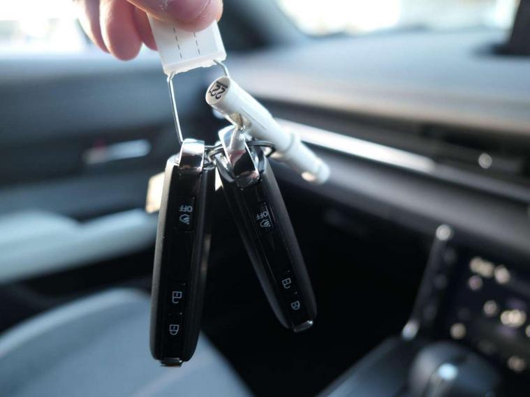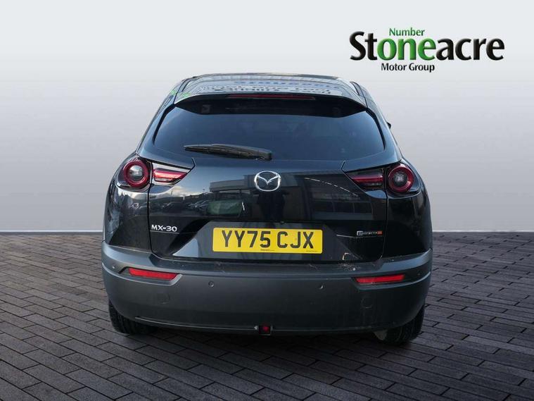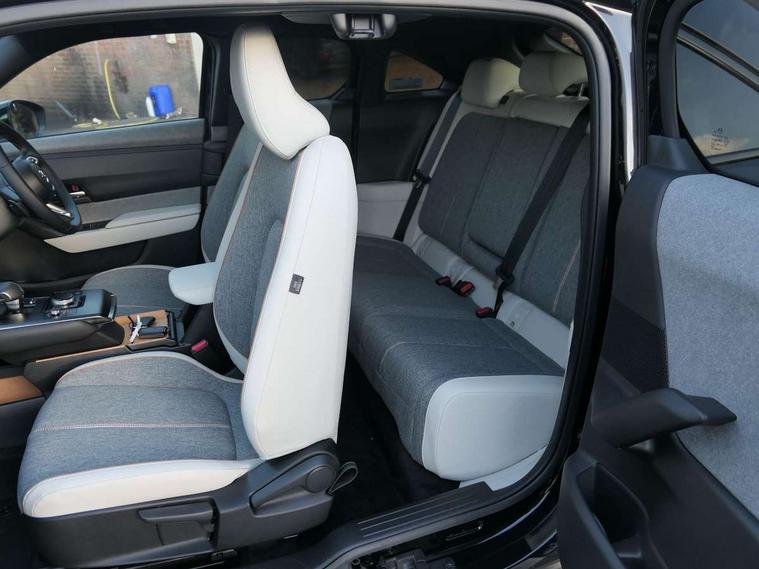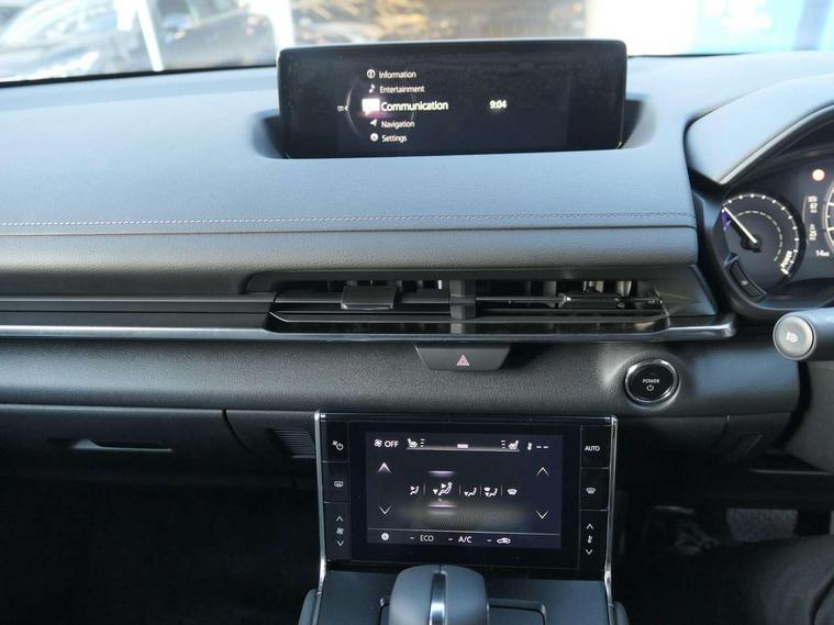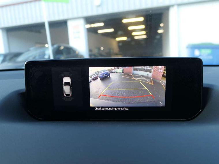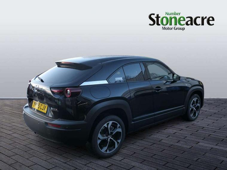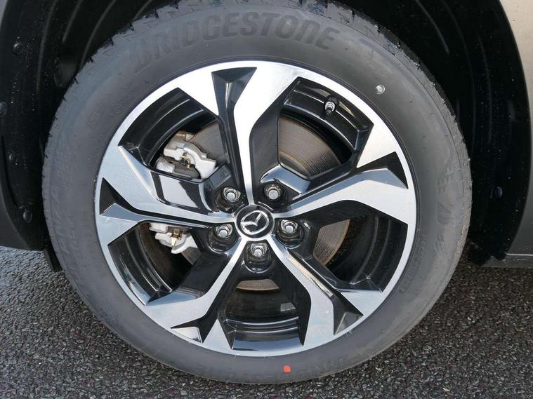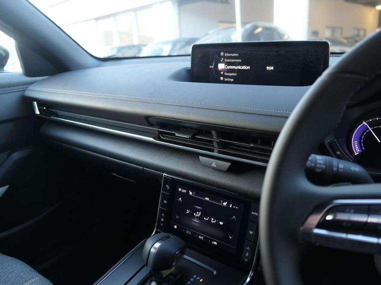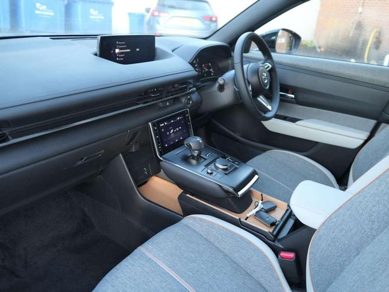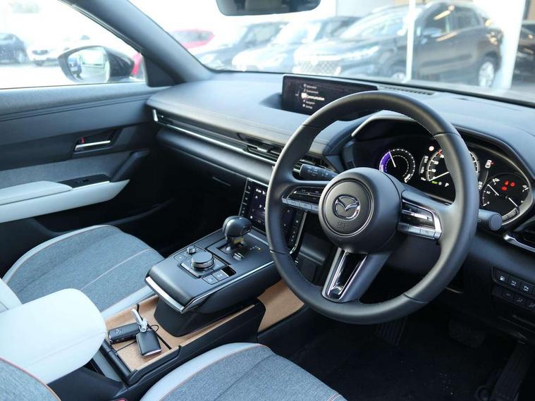 10.25" TFT colour centre display with Mazda Connect infotainment, 7" TFT Colour driver instrument panel display, Adaptive cruise control (Mazda radar cruise control) features stop and go, Apple car play/Android Auto, Blind spot monitoring with rear cross traffic alert, Drive mode switch, Driver attention alert system, E-call with GPS, Emergency lane keeping with blind spot assist and road keep assist, Emergency stop signalling system, Front and rear parking sensors, Integrated bluetooth, Integrated Mazda navigation system, Intelligent speed assist, Lane keep assist system (LAS) with Lane departure warning system (LDWS), PAS, Power start/stop button, Reversing camera, Service indicator, Trip computer, Windscreen projected colour active driving display (head up display) with traffic sign recognition, 11 kW triphase onboard charger, DC socket for rapid charging up to 40KW, Internal Combustion Engine Sound Emulator, Type 2 for mode 2 AC charging via 3-point plug, Type 2 for mode 3 AC charging via home or public charge points, 8 Speakers, DAB Digital radio, FM, Multimedia Commander including separate volume dial, Steering wheel mounted audio/bluetooth controls, Satin black - Lower bumper and wheel arch and side mouldings, Auto dimming driver's door mirror, Auto headlight levelling, B-pillar and C-pillar garnishes in gloss black finish, Black front grille, Body coloured bumpers, Coming/leaving home lights, Door mirrors with adjustable memory and tilt down function when in reverse, Dusk sensing headlights, Electric front windows with one touch auto up/down, Electrically adjustable door mirrors, Frameless auto dimming interior rear view mirror, Front, rain-sensing wipers with adjustable sensitivity and speed, Gloss black rear roof spoiler, Heated and auto power-folding door mirrors in black with integrated indicator lights, High beam control, Kodo turn signal, LED 3rd brake light, LED daytime running lights, LED Headlights, LED rear combination lights, Privacy glass (rear side windows and rear screen), Rear side wing doors, Rear wiper, Unique R-EV exterior badging, 12v electrical power outlet, 2x USB C and 12V Outlet, 3 seat bench in 2nd row, 60/40 split fold down rear seats, 8-way power adjustable driver seat with memory linked to door mirror and Active Driving Display, Black roof lining, Bright finish power button surround, Bright interior trim accents with steering wheel centre bezel, surround of engine start / stop button and glove box handle, Climate control air conditioning operated by the central 7" touchscreen control panel, Cloth/artificial leather upholstery, Door panel trim - cloth with artificial leather armrest and cork inserts around inner door handle, Driver and front passenger two rear grab handles with rear coat hooks, Driver, front passenger and two rear door pockets, Drivers and front passengers sun visors with vanity mirrors and driver's ticket holder, Front and rear LED lighting, Front centre armrest with storage and two cupholders, Front passenger seat manual slide, recline and height adjust, Heated front seats with 3 stage setting, Illuminated glovebox, ISOFIX child seat anchorage points attached on outer rear seats, Leather wrapped steering wheel and shift lever, Luggage compartment LED lighting, Mazda heritage cork accents on the console tray and cupholder lids, Power driver lumbar support, Rear centre armrest with two cup holders, Remote pre-heating/cooling, Roof mounted sunglasses holder, Seatback pocket at rear of the front passenger seat, Single front passenger seat, Steering wheel telescopic and tilt adjustment, Tonneau cover, Two front and three rear height-adjustable head restraints, 3 point ELR front seat belts x2 with pretensioners, 3x3 point rear seat belts, Anti-lock braking system (ABS), Collision avoidance braking, Driver central airbag, Drivers knee airbag, DSC - Dynamic Stability Control, Electric G-Vectoring control plus, Electronic parking brake with auto disengage function and auto hold function, Front and rear curtain airbags, Front dual stage driver and single stage front passenger airbags, Front passenger airbag cut-off switch, Front side airbags, Hill hold assist, Pre-crash safety system - Smart brake support (SBS) with turn-across traffic, Rear door child safety locks, Regenerative braking system (5 modes. Selected via paddle shift switches), Seatbelt reminder audible warning for driver, passenger and rear seats, Traction control system (TCS), Tyre pressure monitoring system (TPMS), Keyless Go, Remote central locking with deadlocking and automatic door lock when driving, Smart keyless entry, Thatcham accredited alarm and immobiliser, 18" Black diamond cut alloy wheels, Emergency tyre repair kit,