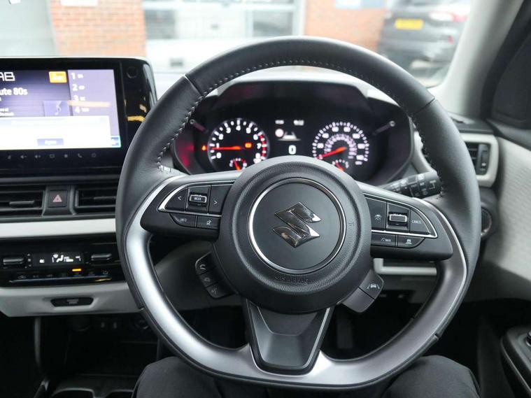 Adaptive cruise control, Automatic start/stop system, Blind spot monitoring, Colour LCD information display, Digital clock, Driver monitoring system, eCall, Fuel consumption display (average/instantaneous) and range display, Intelligent speed control support, Lane departure prevention, Lane departure warning system, Lane keeping assist (LKA), Low fuel level warning light, Navigation system, Outside temperature display, PAS, Rear cross traffic alert, Rear parking camera, Rear parking sensors, Remote fuel cap release, Smartphone integration with Apple CarPlay and Android auto, Suzuki connect, Tailgate, Traffic sign recognition, Weaving alert, 4 speakers + 2 tweeters, 9-inch infotainment display, Auxiliary input socket, Bluetooth audio streaming, DAB Digital radio, Steering wheel audio controls, USB Type A and C, 'Guide me home' headlamps, 1 speed with intermittent rear wiper + washer, 2 speeds front wiper with intermittent + washer, Automatic headlights, Black coloured A & B pillars, Black Upper and lower front grille, Body colour door mirrors and handles, C pillar trim moulding, Electric door mirrors, Electric front windows, Electric rear windows, Green tinted glass, Heated door mirrors, High beam assist, LED daytime running lights, LED High mounted stop light, LED position lamps, LED projector headlamps, LED rear combination lamp, Manual headlamp level control, Rain sensor, Rear fog lights, Rear privacy glass, Rear side wing doors, Rear spoiler, Side spoiler, 1 cup holder in rear, 12V Accessory socket in front console, 2 cup holders in front, 2 Isofix seat anchors, 3 bench rear seats in 2nd row, 3 rear head restraints, 3 spoke leather covered steering wheel, 60/40 split rear seats, Accessory socket, Centre console storage, Centre lower box, Child seat tether anchorages x 2, Chrome handbrake release button, Chrome interior door handles, Cloth upholstery, Door pockets with bottle holder, Driver/passenger sunvisors with ticket holders + vanity mirrors, Front cabin lights, Front headrests, Front map light, Front passenger side assist grip, Glovebox, Heated front seats, Heater, Height adjustable driver's seat, Luggage area lamp, Manual air conditioning with digital control panel, Material door trim ornament, Parcel shelf, Passenger seat back pocket, Pollen filter, Single front passenger seat, Tilt adjustable steering wheel, Tilt/telescopic adjustable steering wheel, 3 point ELR seatbelts for centre seat, 3 point ELR seatbelts front and rear, ABS+EBD+Brake assist, Curtain airbags, Driver airbag, Dual sensor brake support, ESP + traction control, Front and rear seatbelt reminder, Front passenger airbag, Front passenger airbag deactivation, Front seatbelt pretensioners with force limiters, Hill hold control, Rear child proof door locks, Rear seatbelts with pre-tensioners and load limiters, Side airbags with incorporated into front seats, Tyre pressure indicator, Deadlocks, Freewheeling key cylinders, Immobiliser, Keyless entry and start, Light - on and Key in reminder, Locking wheel nuts, Remote central locking, Painted instrument panel ornament, 16" Painted alloy wheels, Emergency flat tyre repair kit,