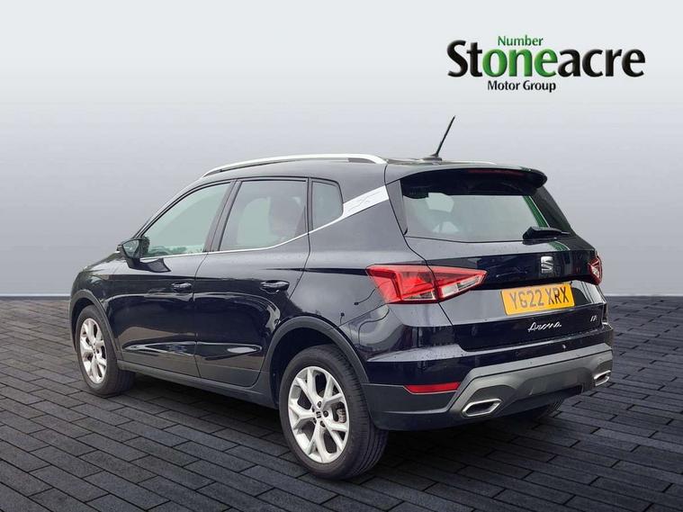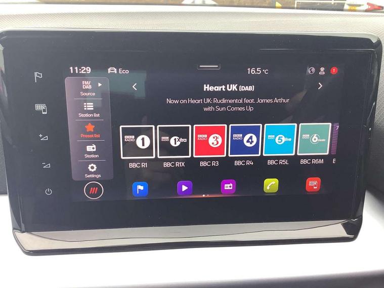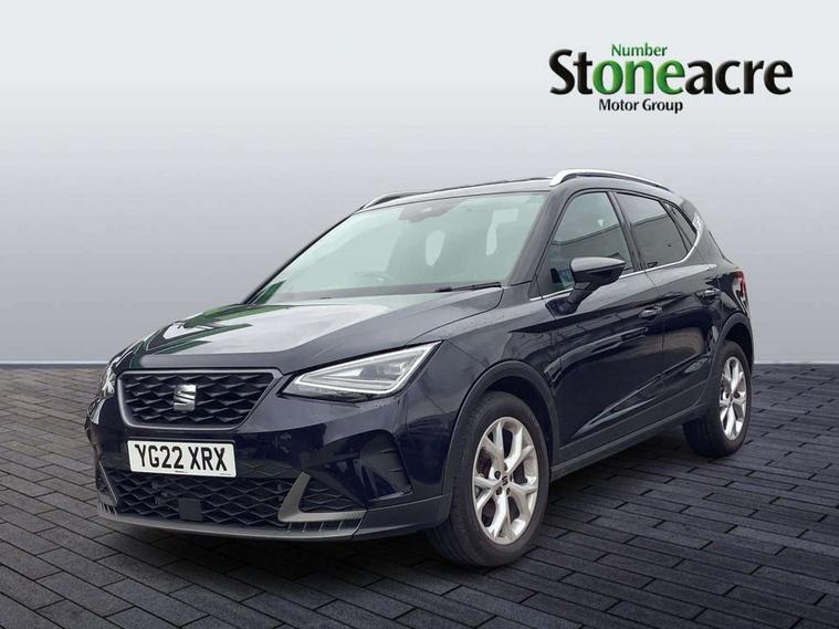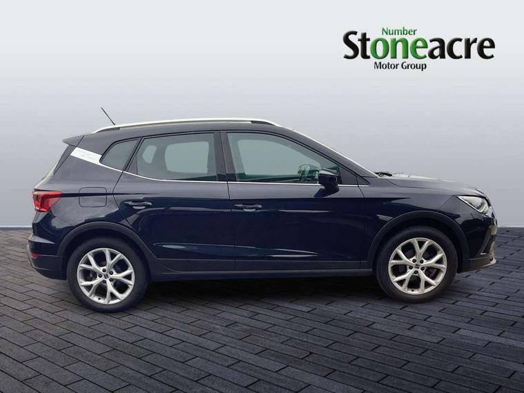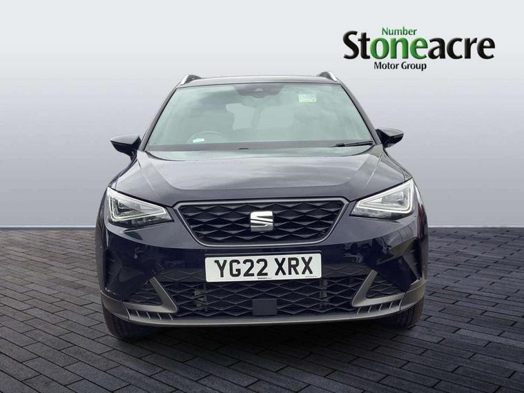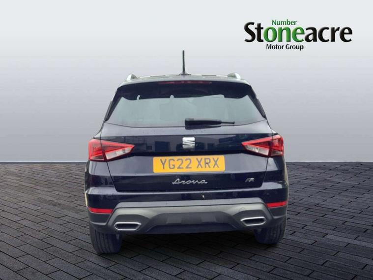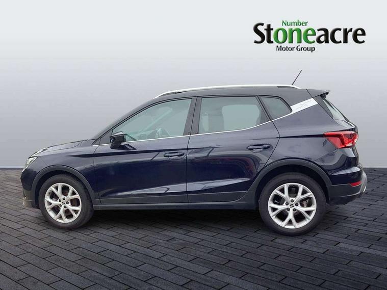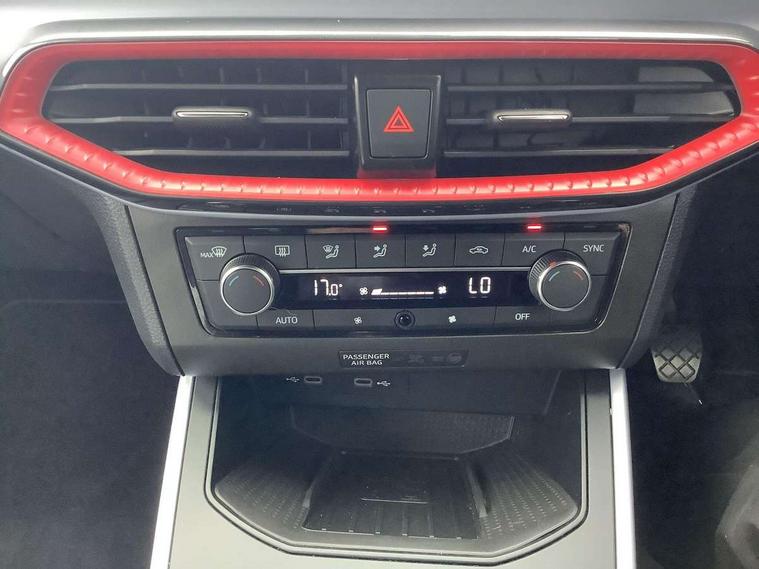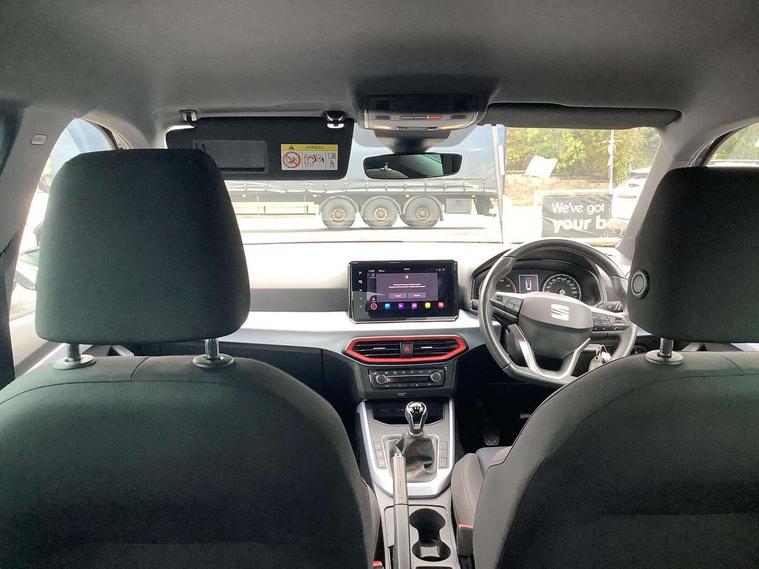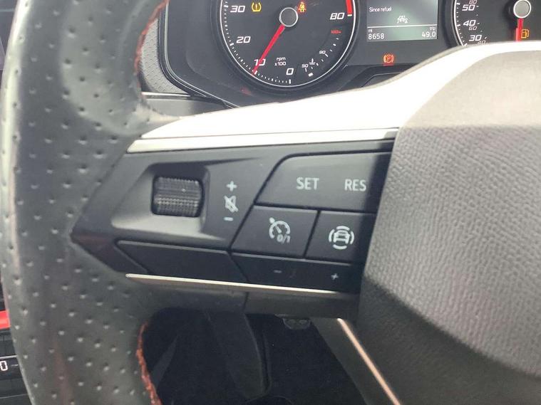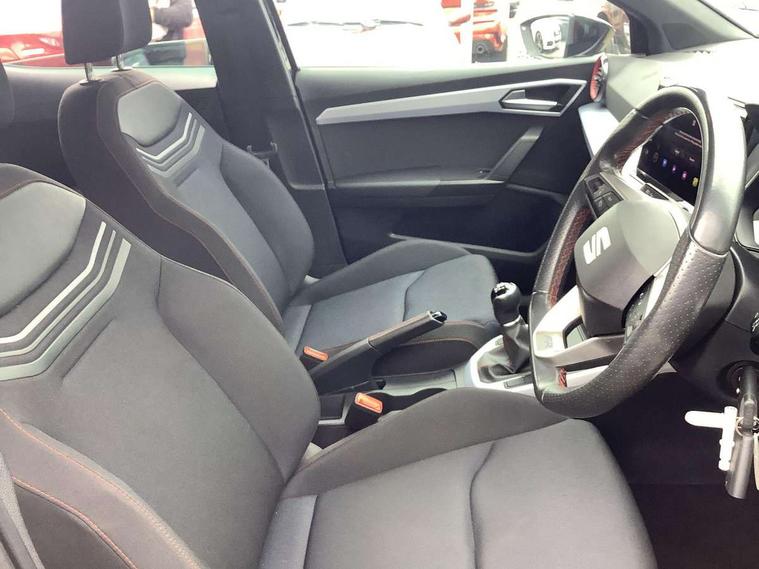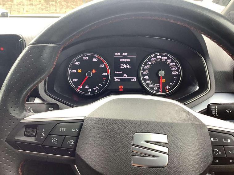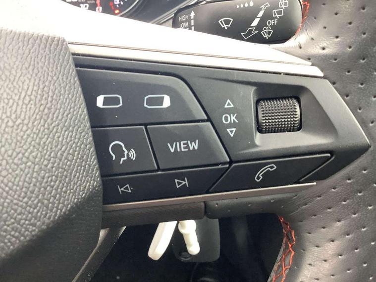 'Lights On' Reminder warning buzzer, Digital clock, E-call, Electric speed sensitive power steering, Full Link Smartphone Integration with Mirror Link, Apple Car Play, Google Android Auto with USB Type C cable for Apple and Android compatibility, Lane keeping system, Low fuel warning light, Outside temperature display, Rear parking sensor, RPM counter, Seat connect with safety, service, remote and online, SEAT Drive profile - Four different models normal-sport-eco-individual, steering response, throttle response, Trip computer, Bluetooth interface for hands free and audio streaming, DAB digital radio and AM/FM radio, Steering wheel mounted audio controls, Anti theft roof antenna, Auto dimming interior rear view mirror, Automatic activation of hazard warning lights, Body coloured bumpers, Body coloured door handle inserts, Chrome roof rails and window surrounds, Chrome window trim, Dark tinted rear windows, Electric front/rear windows, Electrically adjustable, heated and folding door mirrors, FULL LED automatic headlights with dynamic headlight range control, coming and leaving home, LED daytime running lights, LED rear tail lights and licence plate lights, Protective side mouldings, Rain sensing wipers, Rear side wing doors, Rear spoiler, Rear window wash/wipe, Roof colour door mirrors, Third brake light, Twin exhaust pipe styling hidden exhaust pipe, Visible VIN plate, Windshield wiper with intermittent control and potentiometer, 2 cupholders, 3 seat bench in 2nd row, 60/40 split folding rear seat, Aircare filter, Black interior roof, Cloth upholstery, Daring red Illuminated coloured air vent, Double boot floor, Driver sunvisor with covered mirror + card holder, Dual zone climate control, Front courtesy light with front and rear reading lights, Front sport seats, Gear shift indicator, Height adjustable front seats, Height/reach adjustable steering column, Illuminated boot, Instrument lighting with brightness control, Interior ambient lighting, Interior light in footwell, central console and door panel, ISOFIX points in outer rear seats with top tether anchorage points, Passenger sunvisor with vanity mirror, Perforated flat bottomed leather steering wheel/gear knob/handbrake with red stitching and FR logo, Single front passenger seat, Two front and three rear height adjustable headrests, Connectivity pack plus - Arona, Interior chrome pack - Arona, 3 point seatbelts on all rear seats, ABS, Active front headrests, Child locks on rear doors, Driver and front passenger airbags with front passenger airbag de activation, front side and curtain airbags, Electronic stability control, Emergency Brake Assist (EBA) and front assist, Front and rear seatbelt reminder, Hill hold control, Multi-Collision braking, Tiredness recognition system, Traction control, Tyre pressure monitoring system, Alarm with back-up horn, Electronic engine immobiliser, Locking wheel bolts, Remote central locking + deadlocks, Tow away protection, Titan black dashboard, 17" Dynamic alloy wheels,