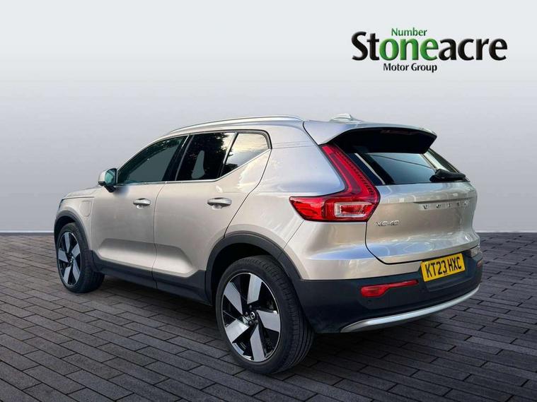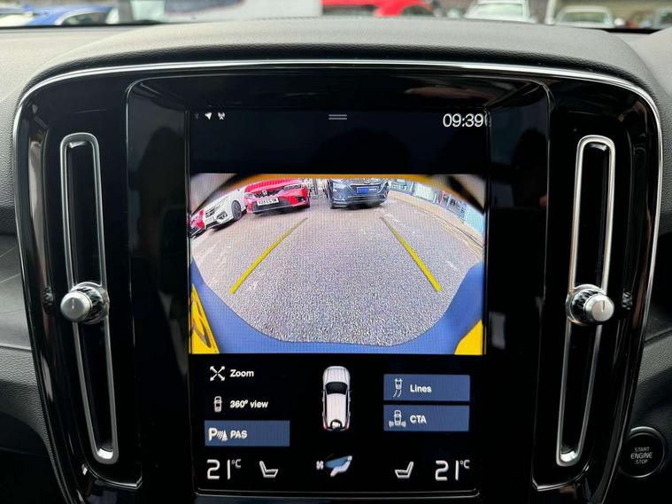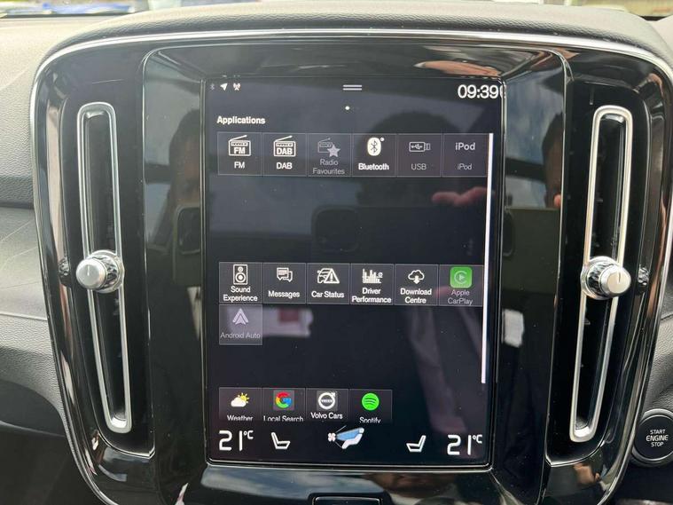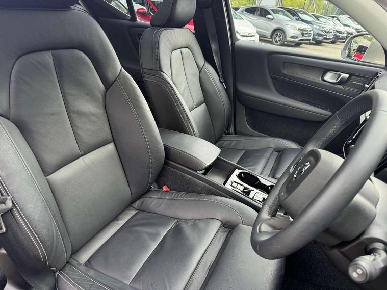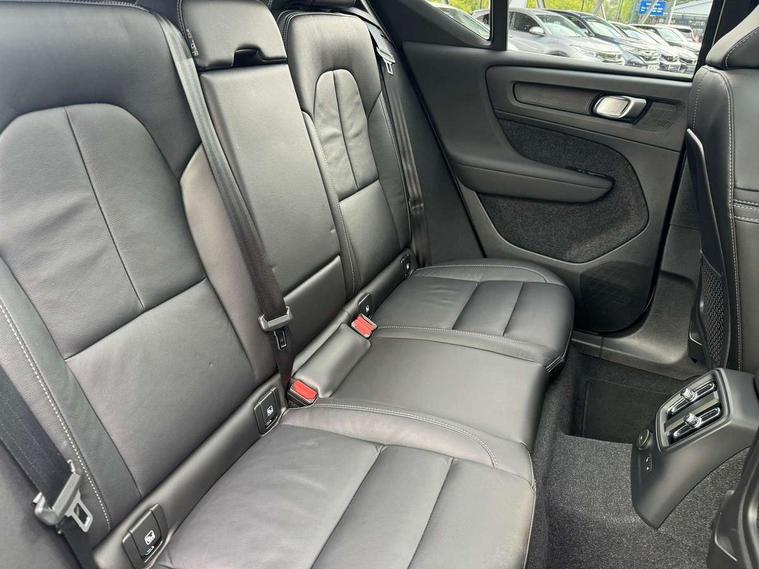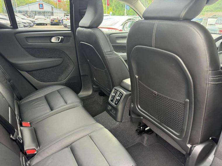 12.3" Active TFT crystal driver's instrument display, 360 degree surround view parking camera, 9" centre console portrait touch screen, Adjustable steering wheel force, Bluetooth hands free telephone kit, Drive mode selector, E-call, Front park assist, Hands free power tailgate, Lane keep assist with driver alert control, Oncoming Lane Mitigation, Rear park assist, Sensus navigation with European mapping and traffic information, Speed limiter, Speed sensitive steering, Voice activated control for key functions, Wireless Smartphone Integration includes Apple CarPlay and Android auto, Wireless/Inductive Mobile Phone Charging, 3.7 kW monophase on board charger, 7m 10amp charge cable with 3 pin plug and 7m 1 phase 16amp type 2/mode 3 charge cable, Dynamic chassis, Electric front axle drive, Recharging port located in nearside front wing, DAB Digital radio, Low speed exterior sound speaker, Premium Sound by Harman Kardon, Dolby Pro Logic II Surround Sound, Dirac Unsion, 12 speakers/600W and subwoofer, Steering wheel mounted remote controls, Active bending pixel LED headlights with adaptive shadow technology, Active high beam incorporating daytime running lights, Adaptive brake lights with high level LED brake lights, Auto dimming interior mirror, Automatic headlamp levelling, Dark tinted windows for rear door side windows and cargo compartment, Front and rear electric windows, Front recharge aluminium tread plates, Headlight cleaning system, High gloss black front and rear skid plate, High gloss black mesh front grille with high gloss black surround, High gloss black window trim, Home safe and approach lighting, Integrated roof rails in high gloss black, LED front fog lights, Power glass tilt and slide panoramic sunroof with sun curtain, Puddle lights, Rain sensor with automatic windscreen wiper activation, Rear side wing doors, Rear wiper, Roof antenna, Roof spoiler, Visible VIN plate, 12V socket in front tunnel console and cargo compartment, 2 zone electronic climate control with clear zone air quality system and pollen filter, 3 seat bench in 2nd row, 3 Spoke tailored steering wheel with chrome trim, 60/40 versatile split folding rear seat, A-pillar parking ticket holder, C-pillar Recharge logo, Centre console cupholders and storage, Floor mats, Front door pocket, front cupholder, ambient front door, rear reading, rear courtesy, instrument panel and tailgate lighting, Front footwell illumination, Front headrests, Front reading light and theatre lighting, Front seat cushion extensions, Front tunnel pocket, Glovebox bag hook, Heated front seats, Height adjustable passenger seat, Height/reach adjustable steering column, High gloss centre tunnel deco, Illuminated glovebox, Illuminated luggage compartment, Illuminated vanity mirrors, Isofix attachments on rear seats, Load protection net, Multi directional lumbar support, Power driver seat with memory + exterior mirrors memory, Power folding rear headrests, Power passenger seat, Rear armrest / integral cup holders / storage tray, Single front passenger seat, Underfloor cargo storage, Climate pack without heated front seats - XC40, Driver assist pack - XC40, 3x3 point rear seatbelts, City safety includes pedestrian, cyclist and large animal detection and front collision warning with full auto brake, Drivers knee airbag, Dual stage driver/passenger airbags, Electronic parking brake with auto hold, First aid kit, Front and outer rear seatbelt reminder and pretensioners, Front seats SIPS airbags, Hill descent control, Hill start assist, Inflatable curtain, Passenger airbag cut-off device, Power child locks on rear doors, Road sign information display, Run off Road Mitigation, Run off Road Protection, SIPS (Side Impact Protection System), Slippery road and hazard light alert, Stability and Traction Control with Spin control, Engine Drag Control and Corner Traction Control, Tyre pressure monitoring system, Vehicle deceleration control with Anti-lock Brake System, Electronic Brake Distribution and Emergency Brake Assist, Warning triangle, WHIPS whiplash protection system - front, Anti-theft alarm including immobiliser/volume sensor + level sensor, Care key with user defined top speed, Key integrated remote control central locking + fuel flap with deadlocking system and auto open/close power windows, Keyless drive includes keyless entry and keyless start, Locking wheel nuts, Private locking for tailgate,