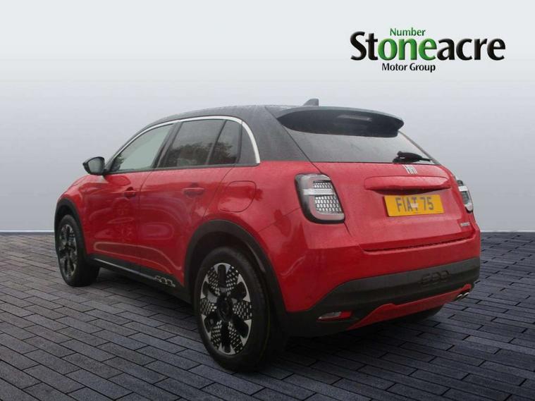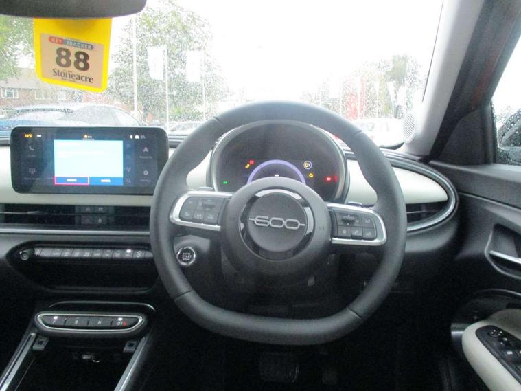 360 degree parking sensors with 180 degree rear view camera, 7" TFT digital cluster, Autonomous driving level 2: Adaptive cruise control with stop & go and lane centering, Blind spot detection, Bluetooth connectivity, BSRF connectivity box, Connected services, Drowsy driver detection, Emergency E-call assist, Engine emission level default, GSR II step 1, Hands free power liftgate, Intelligent speed assist, Lane keeping assistant (LKA), Odometer, Power assist steering, Rain and dusk sensors, Semi-automatic parking with Visiopark 1 system, Traffic sign recognition, Wireless apple car play/android Auto, Wireless charging pad for smartphones, Without drive mode selector, L2-AGM 12V battery, 1st Row USB type-A and USB type-C, 2nd Row USB type-C, 6 speaker audio system, Radio, Uconnect infotainment 10.25" touchscreen with integrated navigation system and DAB, All power windows express Up/Down, Auto dimming frameless rear view mirror, Automatic headlights, Automatic high/low beam, Body coloured door handles, Chrome day light openings, Chromed exhaust tip, Electric adjustable/heated/folding door mirrors, Exterior chrome accents, Front and rear Chromed 600 logo, Gloss black finish B pillar, Gloss black shark fin antenna, Glossy black door mirrors, Heated windscreen wiper blade area, LED 3rd brake light, LED daytime running lights, LED Fog lamps with cornering function, LED front signature lighting, LED front turn indicators and position lights, LED rear lights, LED rear signature lighting, LED reflector headlamps, Matt black side skirts with 600 chromed logo, Privacy glass, Puddle lights, Rear bumper embossed 600 logo, Rear roof spoiler, Rear side wing doors, Rear wiper, 2 Spoke synthetic leather steering wheel with audio control, 3 rear headrests, 3 seat bench in 2nd row, 6 way manually adjustable front passenger seat, 6 way power adjustable driver seat with lumbar support and massage function, Adjustable trunk floor, Automatic climate control, Auxilliary 12V power socket, Cargo flex fit, Chrome interior door handles, Dark metachrome dashboard ring, English handbook, Front centre armrest, Front headrests, Front passenger grab handle, Front seatback pockets, Heated front seats, ISOFIX attachment on front passenger and rear passenger seats, Matt Ivory painted dashboard fascia, Metachrome central compartment bezel, Monogram Synthetic leather upholstery, Paddle shifts, Partial body cover for shipment, Predisposal for accessory upgrade to default tunnel pad cover (dedicated prnd bezel), Rear seat 40/60 split, Single front passenger seat, Smart 15L storage central tunnel with La prima tunnel pad cover, Sunvisor label ciao Fiat, Sunvisors with vanity mirrors, Velour floor mats, 3x3 point rear seatbelts, 6 airbags, ABS, Autonomous Emergency Brake (AEB) & Vulnerable Road User (VRU) Protection, Child locks on rear doors, Electronic parking brake with auto hold, ESC (Electronic Stability Control), Front passenger airbag deactivation, Seatbelt reminder and pretensioners for all seats, Anti-theft volumetric alarm, Anti-theft wheel bolts, Passive entry and keyless go, 18" Diamond cut alloy wheels, Fix and go puncture repair kit,
