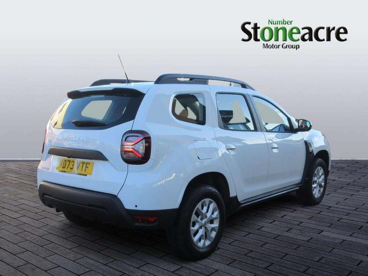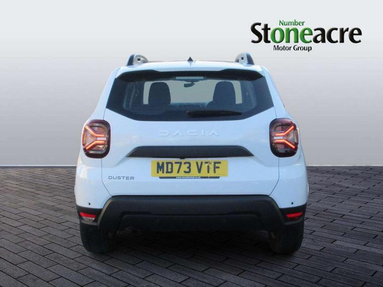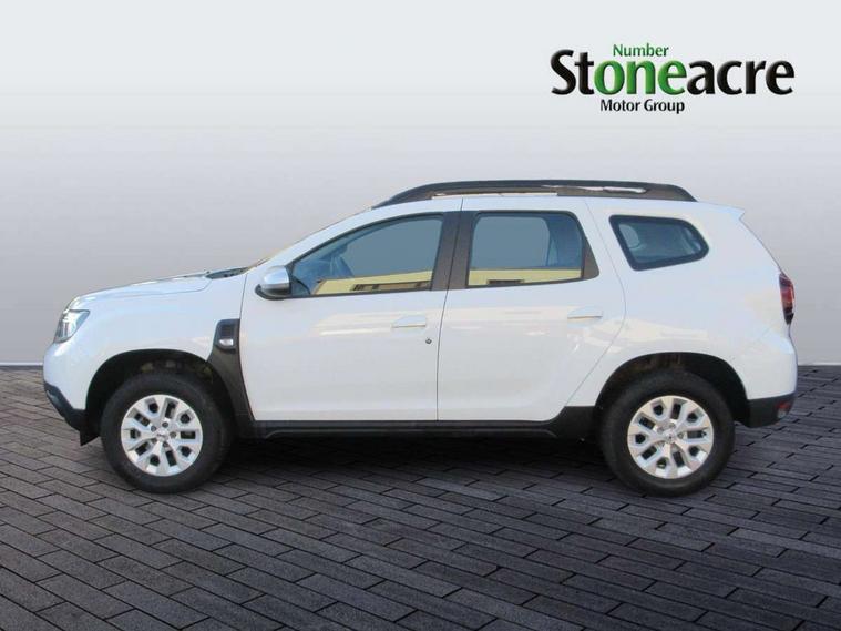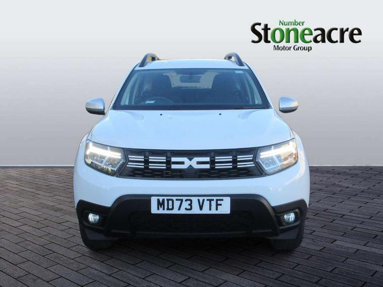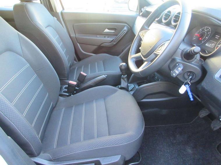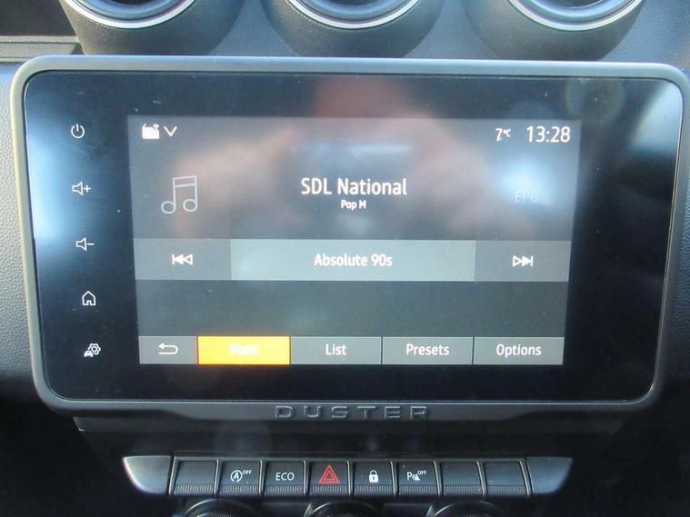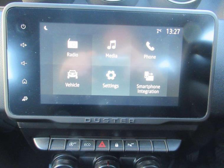 Cruise control and speed limiter, eCall emergency system, Eco mode, Electric power assisted steering, On board computer, odometer, trip computer, average fuel consumption, average speed, service indicator, outside temperature gauge, Rear parking sensors, Rev counter, Reversing camera, Stop/start system, 8" Media display with smartphone replication, 2 usb sockets and 6 speakers, Dacia plug and radio/MP3/USB/bluetooth/DAB/steering wheel control, 3 speed windscreen wipers, Black longitudinal roof bars with Duster inscription, Black side sills, Black/satin chrome tailgate trim with Duster inscription in black background and lettering, Body coloured door handles, Chrome front grille with hot stamping, Chrome logo surround on steering wheel, Daytime running lights, Drivers window one touch up/down, Dusk sensor, Electric adjustable/heated door mirrors, Electric front windows, Electric rear windows, Front and rear body coloured bumpers, Front door sill protection strip, Front fog lights, Heated rear window, High level third rear brake light, Rain sensor, Rear side wing doors, Rear spoiler, Rear wash/wipe, Satin chrome door mirrors, Tinted windows, Underbody protection skid plates, Y shaped LED headlights with rear LED lights, 3 rear height adjustable headrests, 3 seat bench in 2nd row, 60/40 split folding rear seat, Backlighted steering wheel buttons, Boot light, Driver seat lumbar adjustment, Fabric decorative insert on door panels, Fabric upholstery, Front head restraints, Front passenger reading light, Gear shift indicator, Height adjustable driver seat, Height adjustable front and rear headrests, Height and depth adjustable steering wheel, High centre console with driver armrest, Isofix points for child seats in both outer rear seats, Manual air conditioning, Map pocket on front seat backs, Passenger sunvisor with vanity mirror, Rear passenger reading light, Satin chrome interior door handles, Satin chrome lower steering wheel insert, Single front passenger seat, Soft feel leather steering wheel, 3x3 point rear seatbelts, ABS and Emergency brake assist, ASR traction control with Electronic stability control, Child locks on rear doors, Door open visual and audible warning, Driver airbag, Driver and passenger seatbelt not fastened - visual and audible warning, EBD - Electronic brakeforce distribution, Front passenger airbag, Front passenger airbag deactivation, Front seatbelt pretensioners, Front side airbags, Height adjustable front seatbelts, Hill start assist, Tyre pressure monitor, Remote central locking, Thatcham approved engine immobiliser, Charcoal grey central console surround, Matt black central console fascia, Piano black decorative insert on front door panels, Satin chrome air vent surround, Satin chrome instrument dial surrounds, 16" alloy wheels,