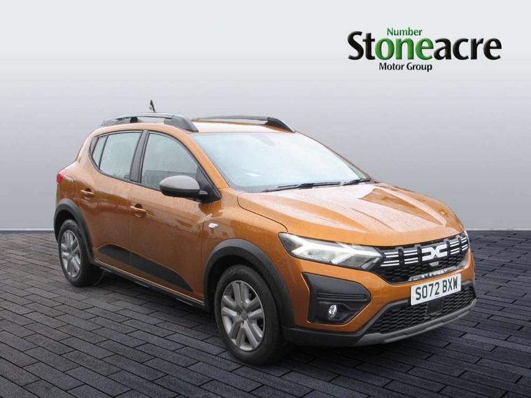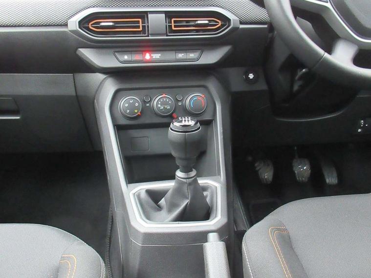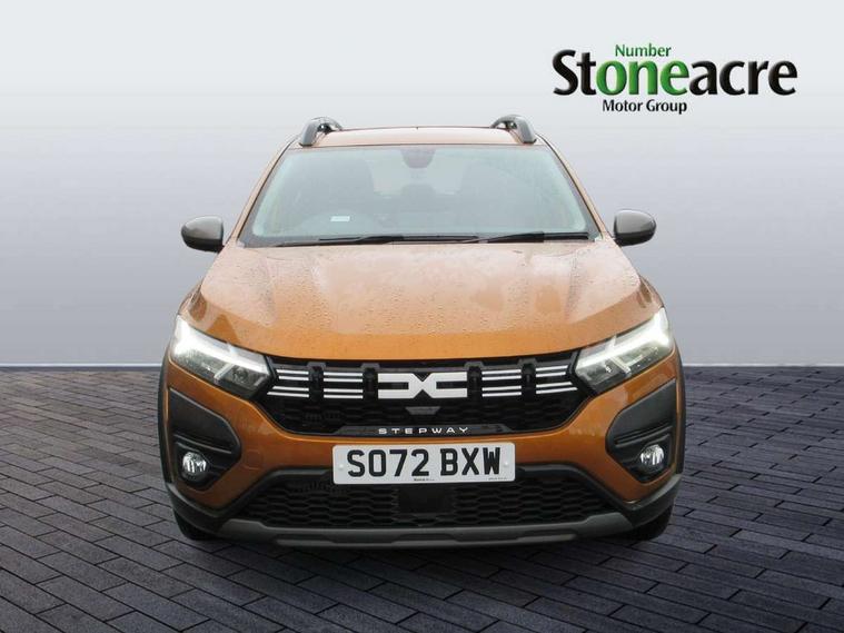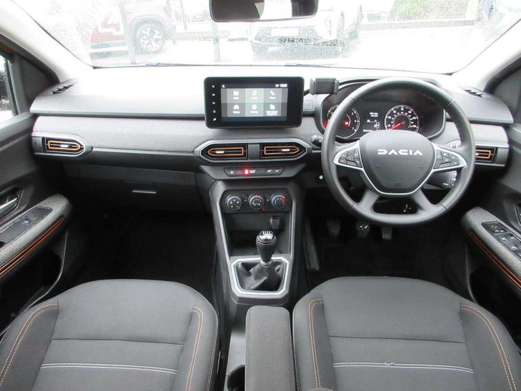 3.5" TFT instrument panel with on-board computer, Cruise control with speed limiter, eCall emergency call system, Eco mode, Electric power assisted steering, Rear parking sensors, Rev counter, Reversing camera, Stop/start system, 8" Media display - DAB radio, smartphone replication, bluetooth, 4 speakers, Apple CarPlay and Android Auto, USB connection for data transfer and charging, USB socket, 3 speed windscreen wipers, Auto lighting, Automatic wipers, Body colour door handles, Body colour door mirrors, Body coloured bumpers, Chrome longitudinal roof bars, Chrome modular roof bars, Chrome radiator grille, Chrome stepway inscription on radiator grille and roof bars, Drivers one touch electric windows, Electrically adjustable and heated door mirrors, Front electric windows, Front fog lights, Heated rear window, High level third brake light, LED automatic daytime running lights, LED Y-shape Dacia signature lighting, Rear electric windows, Rear side wing doors, Rear wash/wipe, Tinted windows, 1/3 to 2/3 split folding rear seats, 12 volt front socket, 12 volt rear socket, 3 height adjustable rear headrests, 3 seat rear bench, Driver and passenger vanity mirror with cover, Fabric upholstery, Fixed smartphone holder on dashboard, Gear shift indicator, Height adjustable drivers seat with armrest, Height adjustable front headrests, Height/depth adjustable steering wheel, Isofix points for child seats in both outer rear seats, Manual air conditioning, Satin chrome interior door handles, Satin Chrome/Copper orange air vents, Single front passenger seat, Soft feel steering wheel, Steering wheel controls, 3x3 point rear seatbelts, ABS and Emergency brake assist, Automatic emergency braking system, Child locks on rear doors, Door open visual and audible warning, Driver airbag, ESC (Electronic Stability Control), ESP + Hill Start Assist, Front curtain airbags, Front seatbelt pretensioners, Front side airbags, Height adjustable front seatbelts, Passenger airbag, Seatbelt reminder for driver and front passenger, Tyre pressure monitor, Automatic central locking, Immobiliser, Keyless entry, Remote central locking, Decopart on instrument panel and door with textile, 16" Flex wheels with full wheel cap,