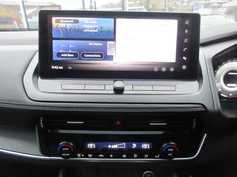 2 front USB-C ports, 2 rear USB-C ports, 360 degree Intelligent around view monitor with moving object detection, Blind spot intervention, Blind spot warning, Drive assist, Drive assist custom mode, Drive modes (sport, normal, eco), Driver drowsiness and attention warning, Electric speed sensitive power steering, Emergency and breakdown call, Emergency lane keep assist, Emergency Stop Signal (ESS), Engine start/stop button, Event data recorder, Front and rear parking sensors, Full Digital 12.3" TFT Digital Combimeter, Google virtual personal assistance, Idle stop/start system, In-car WIFI hotspot, Intelligent Cruise control (ICC), Intelligent forward collision warning, Intelligent speed assist, Lane departure warning system, Nissan connect 12.3 inch touchscreen infotainment system, Nissan connect navigation with google maps, Nissan connect services 2.0 (Google Automotive System), Outside temperature sensor, Rear cross traffic alert, Reversing detection, Wireless Apple CarPlay/Android Auto, Wireless charging pad, Limited slip differential, 6 speakers, AM/FM audio system with DAB, Bluetooth audio streaming, Auto rear wiper when reversing, Body colour mirror caps, Body coloured door handles, Bodyside mouldings, Chrome side window finisher, Electric auto folding door mirrors, Electrically adjustable and heated door mirrors with LED turn indicator, Follow me home headlights, High beam assist, Intelligent auto headlights, LED 3rd brake light, LED daytime running lights, LED Headlights, LED rear lights, One touch front and rear electric windows with remote opening and closing, One touch passenger window, Partially body coloured bumpers, Rear privacy glass, Rear roof spoiler, Rear side wing doors, Rear styling plate, Shark fin antenna, Splash free rain sensing wipers, Super UV and infrared cut glass, Three blink turn signal, 3 bench rear seats in 2nd row, 3 rear headrests, 60/40 split folding rear seat bench, Chrome interior door handles, Cloth upholstery, Dark headlining, Driver seat back pocket, Dual zone automatic climate control with pollen filter, Front door with bottle holders, Height adjustable front headrests, Leather shift knob, Luggage board system, Luggage space lighting, Multifunction steering wheel, Passenger seat back pocket, Rear door bottle holders, RGB ambient light (Full area coverage), Single front passenger seat, Smooth leather steering wheel, Tilt/telescopic adjustable steering wheel, Two rear isofix child seat anchorage points with top tether, 3x3 point rear seatbelt pretensioners + load limiters, Autonomous emergency braking, Child locks on rear doors, Curtain and front side, far side airbags, Driver and passenger airbags, Driver, passenger and 2nd row rear seat belt reminder, Electric handbrake with auto hold function, Front seatbelt pretensioners + load limiters, Height adjustable front seatbelts, Hill start assist, intelligent front emergency braking, Rear automatic braking, Tyre pressure monitoring system, Vehicle dynamic control, Engine immobiliser, Intelligent key with walk away lock and approach unlock functions, Remote central door locking with deadlocking, Thatcham alarm, 18" Diamond cut alloy wheels, Tyre puncture repair kit,