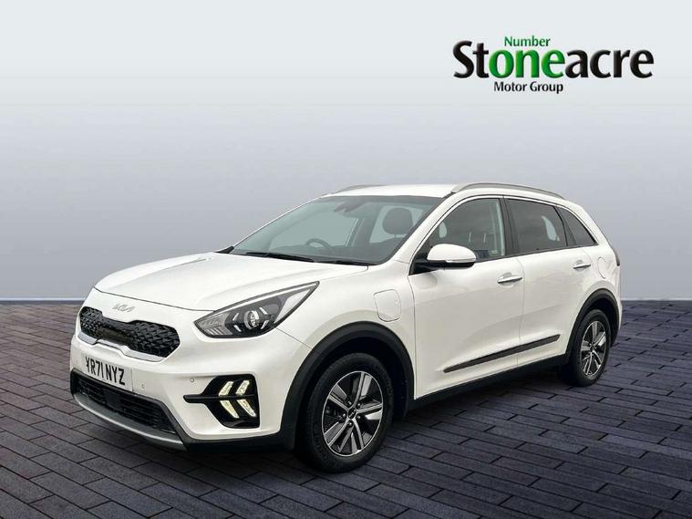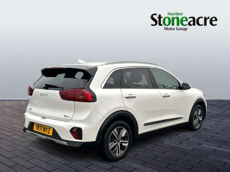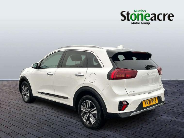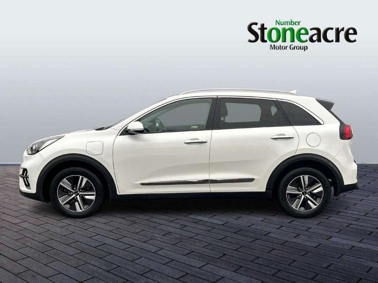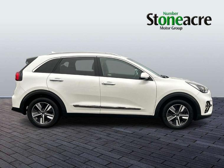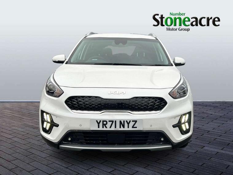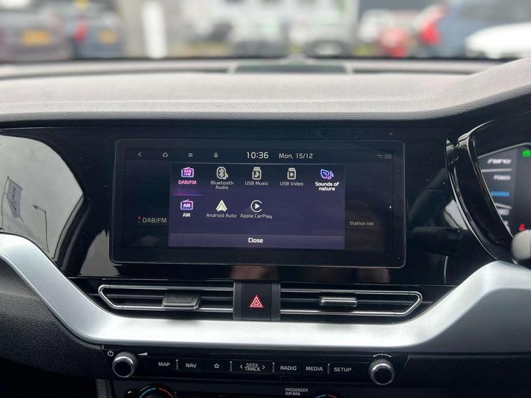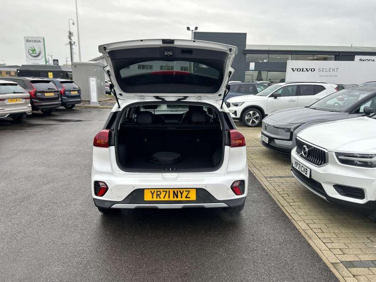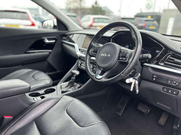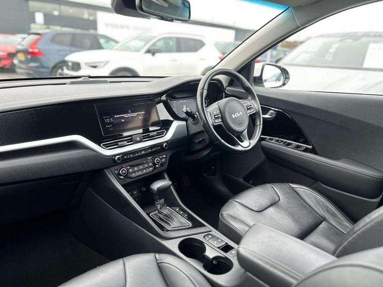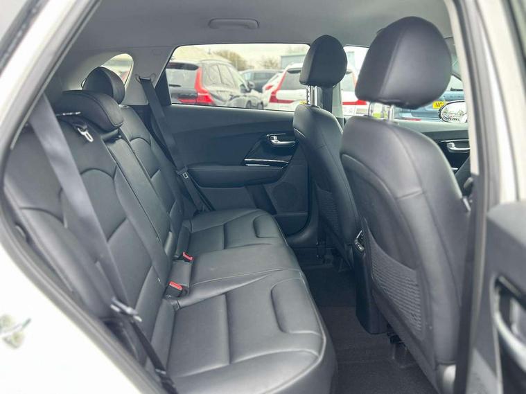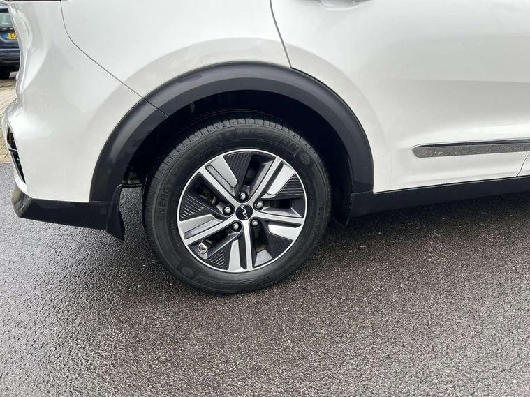 10.25" Touch screen satellite navigation with european mapping and traffic messaging channel, 7" full supervision cluster with TFT colour display, Adaptive smart cruise control function (SCC) with stop and go, Apple car play/Android Auto with voice control, Digital clock, Drive mode selector, Driver attention warning, Emergency stop signalling system, Forward collision avoidance assist, Front parking sensors, Kia connected services featuring TomTom live, Lane Following Assist (LFA), Lane keep assist, Motor driven power steering, Rear parking sensors, Reversing camera, Speed limiter, Trip computer with distance/fuel consumption/average speed, UVO connect, Wireless Smartphone charger, 'Shark fin' mobile antenna, 6 speakers, Bluetooth with music streaming, DAB Radio with MP3, Steering wheel mounted controls, USB connection located in centre console, USB port, All round electric windows with drivers and front passenger auto up/down function, Auto dimming rear view mirror, Automatic defog system, Automatic headlight control system, Black beltline mouldings, Black side sills, Black wheel arch mouldings, Body colour bumpers, Body coloured/high gloss door mirrors, Chrome door handles, Driver's side wide angle mirror, Electrically folding/adjustable/heated door mirrors with LED indicators, LED daytime running lights, LED fog lights, LED rear combination lights, Manual headlight levelling, Matt black radiator grille, Privacy glass - Rear windows and tailgate, Projector headlamps, Rain sensing front wipers, Rear spoiler, Rear wiper, Roof rails, Solar glass, Waistline chrome coating, Welcome and follow-me home light functionality, 3 x passenger assist grips, 60/40 split/folding 2nd row of seats, 8 way electric adjustable drivers seat, All-round height adjustable headrests, Aluminium door scuff plates, Bulb type overhead console lamp with sunglasses case, Centre console storage box, Centre room lamp, Cupholders in rear armrest, Driver/passenger sunvisors with illuminated vanity mirrors, Drivers seat power lumbar support, Dual zone automatic air conditioning, Front and rear door storage, Front/rear centre armrests, Headlining in Light grey, Heated front seats, Heated steering wheel, High gloss black lower console trim, High gloss black steering wheel trim, Illuminated ignition key hole, Interior door lock/unlock function, ISOFIX Child seat top tethers and anchor fixings, Leather trimmed door armrests, Leather trimmed steering wheel, Leather trimmed steering wheel and gearshift, Leather upholstery, Luggage area lamp, Luggage area load cover, Luggage net with hooks, Paddle shifts, Passenger seat height adjuster, Satin finish inner door handles, Seatback pocket - driver, Seatback pocket - front passenger, Tilt/telescopic adjustable steering wheel, Under floor storage box, Ventiliation ducts to rear compartment, Towing pack - Niro, 3 point seatbelts on all seats, ABS, Automatic unlocking of doors in case of impact, Drivers knee airbag, Electric parking brake with auto hold function, Electronic stability control, Front passenger airbag cut-off switch, Height adjustable front seatbelts, Hill start assist control (HAC), Traction control, Twin curtain airbags with roll over sensor, Twin front and side airbags, Tyre pressure monitoring system, Alarm system and engine immobiliser, Deadlocks, Locking wheel nuts, Remote central door locking with fold away key, Speed sensitive auto door locking, Visible vehicle identification number, High gloss black centre fascia, High gloss black door inserts, 16" alloy wheels, Tyre mobility kit,