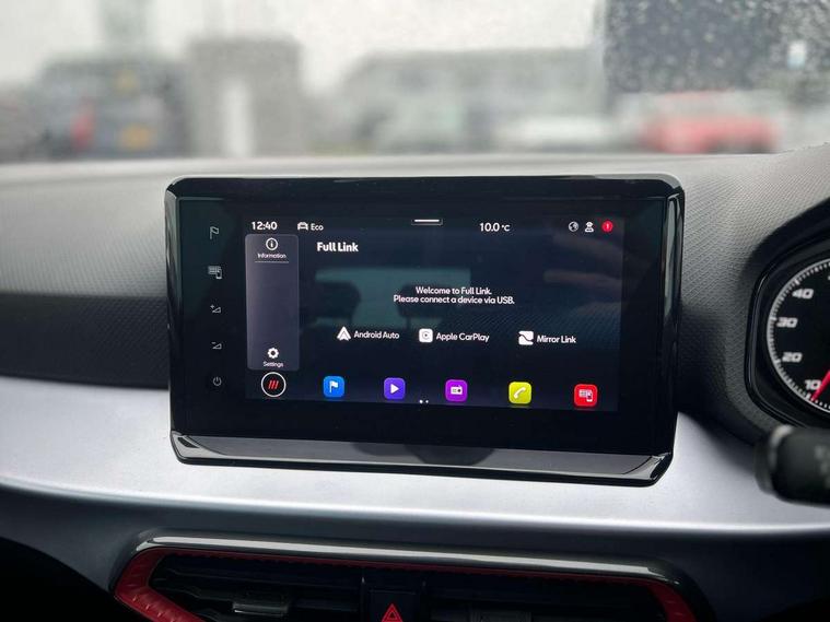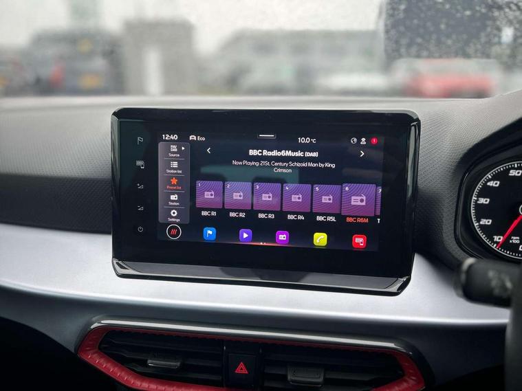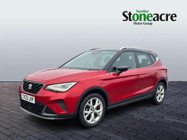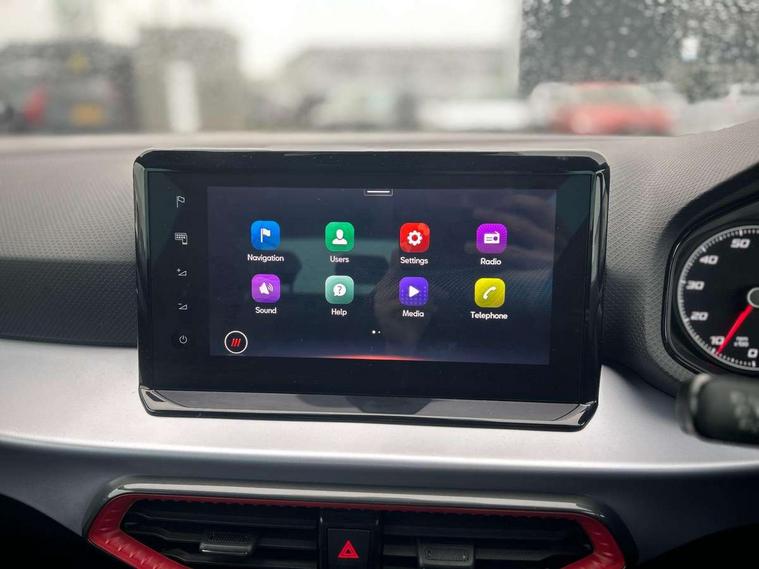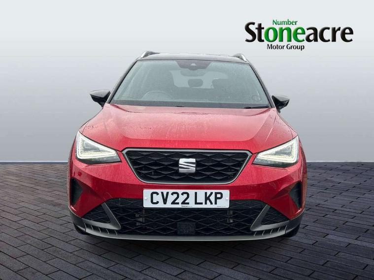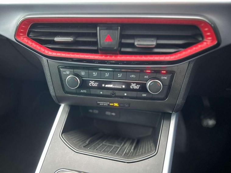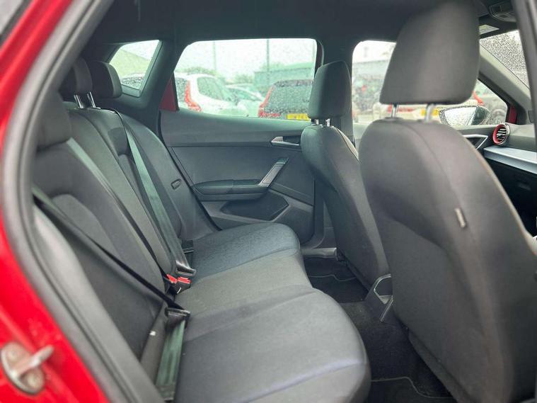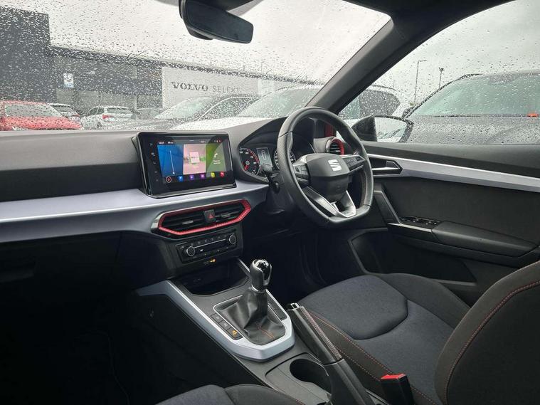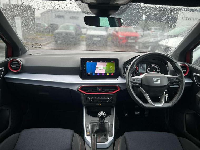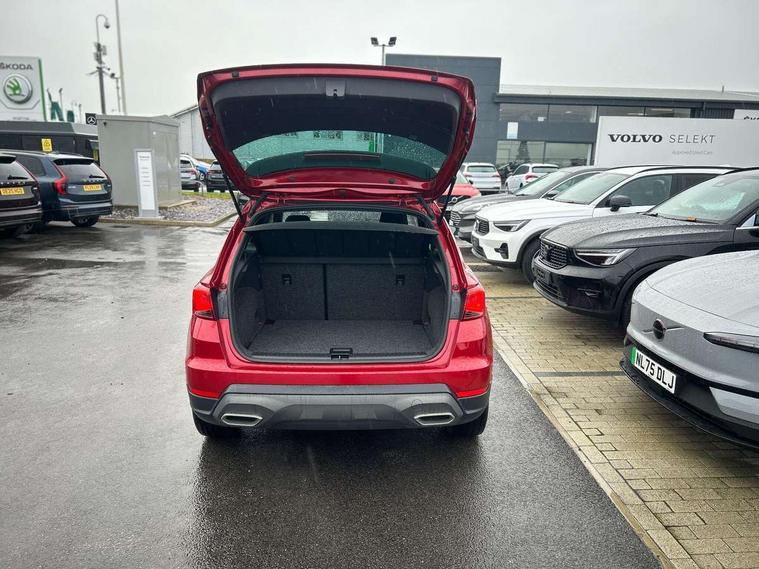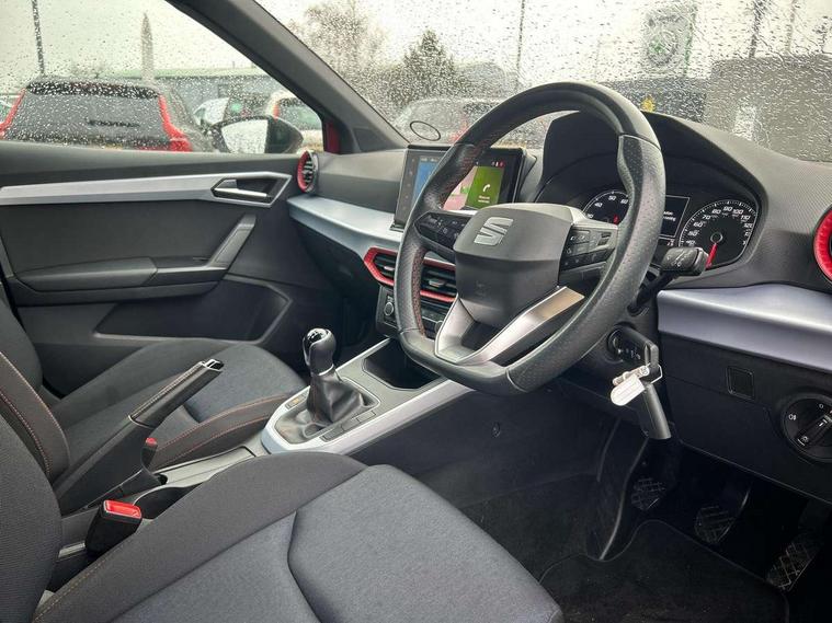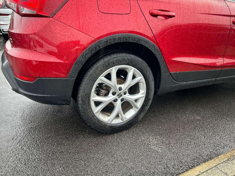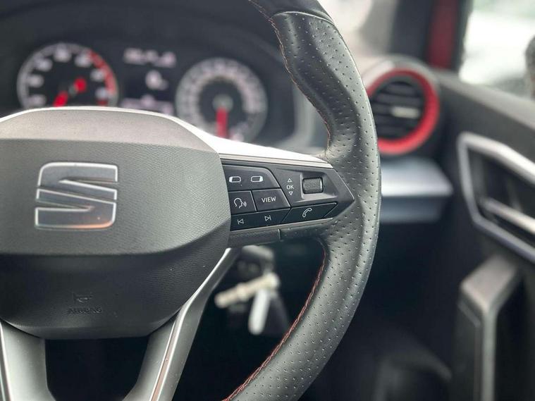 'Lights On' Reminder warning buzzer, 8" Digital cockpit, Digital clock, E-call, Electric speed sensitive power steering, Full Link Smartphone Integration with Mirror Link, Apple Car Play, Google Android Auto with USB Type C cable for Apple and Android compatibility, Lane keeping system, Low fuel warning light, Outside temperature display, Rear parking sensor, RPM counter, Seat connect with safety, service, remote and online, SEAT Drive profile - Four different models normal-sport-eco-individual, steering response, throttle response, Trip computer, Bluetooth interface for hands free and audio streaming, DAB digital radio and AM/FM radio, Steering wheel mounted audio controls, Anti theft roof antenna, Auto dimming interior rear view mirror, Automatic activation of hazard warning lights, Body coloured bumpers, Body coloured door handle inserts, Chrome roof rails and window surrounds, Dark tinted rear windows, Electric front/rear windows, Electrically adjustable, heated and folding door mirrors, Front fog lights with cornering function and rear fog light, FULL LED automatic headlights with dynamic headlight range control, coming and leaving home, LED daytime running lights, LED rear tail lights and licence plate lights, Protective side mouldings, Rain sensing wipers, Rear side wing doors, Rear spoiler, Rear window wash/wipe, Roof colour door mirrors, Third brake light, Twin exhaust pipe styling hidden exhaust pipe, Visible VIN plate, Windshield wiper with intermittent control and potentiometer, 2 cupholders, 3 seat bench in 2nd row, 60/40 split folding rear seat, Aircare filter, Black interior roof, Cloth upholstery, Double boot floor, Driver sunvisor with covered mirror + card holder, Dual zone climate control, Front courtesy light with 2x front and 2x rear reading lights, Front sport seats, Gear shift indicator, Height adjustable front seats, Height/reach adjustable steering column, Illuminated boot, Instrument lighting with brightness control, Interior ambient lighting, Interior light in footwell, central console and door panel, ISOFIX points in outer rear seats with top tether anchorage points, Passenger sunvisor with vanity mirror, Perforated flat bottomed leather steering wheel/gear knob/handbrake with red stitching and FR logo, Single front passenger seat, Two front and three rear height adjustable headrests, Connectivity pack plus - Arona, Interior chrome pack - Arona, 3 point seatbelts on all rear seats, ABS, Active front headrests, Child locks on rear doors, Driver and front passenger airbags with front passenger airbag de activation, front side and curtain airbags, Electronic stability control, Emergency Brake Assist (EBA) and front assist, Front and rear seatbelt reminder, Hill hold control, Multi-Collision braking, Tiredness recognition system, Traction control, Tyre pressure monitoring system, Alarm with back-up horn, Electronic engine immobiliser, Locking wheel bolts, Remote central locking + deadlocks, Tow away protection, Titan black dashboard, 17" Dynamic alloy wheels,