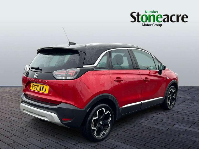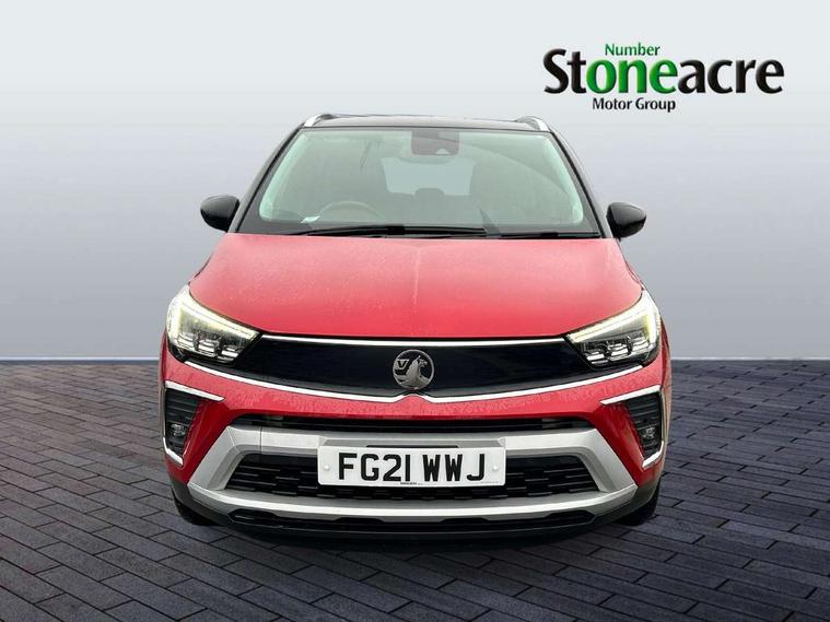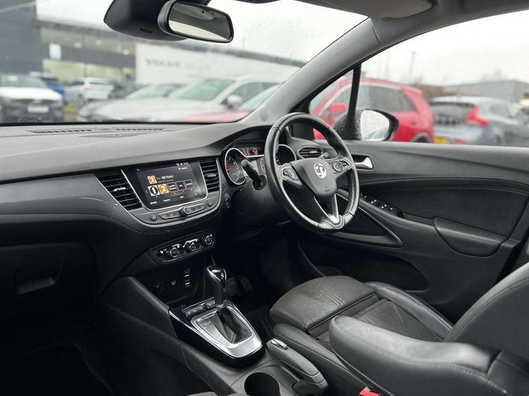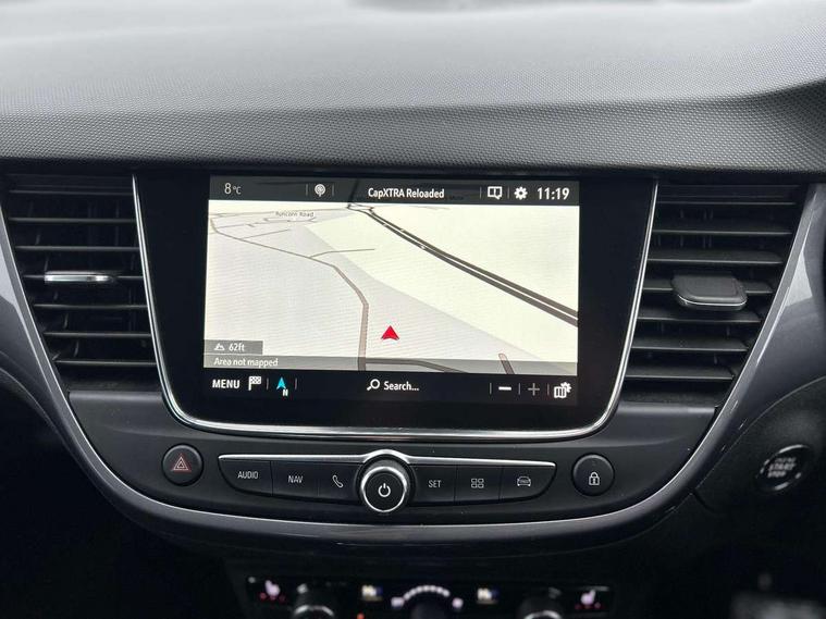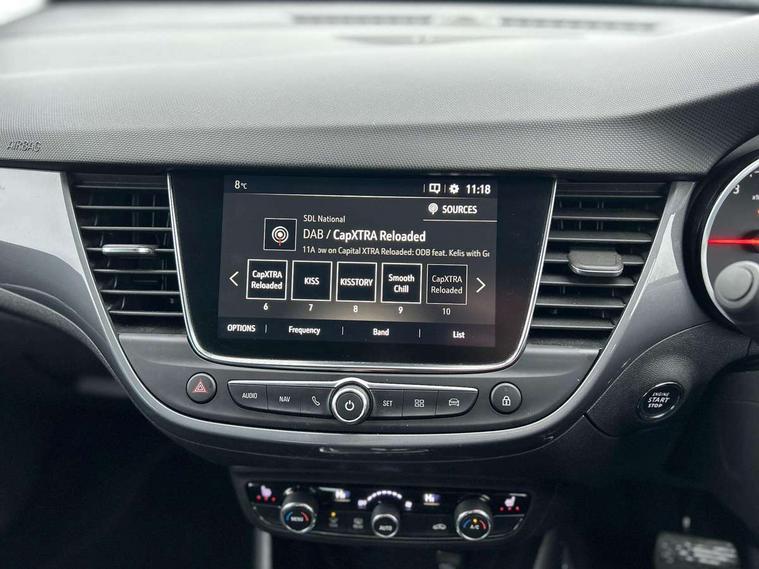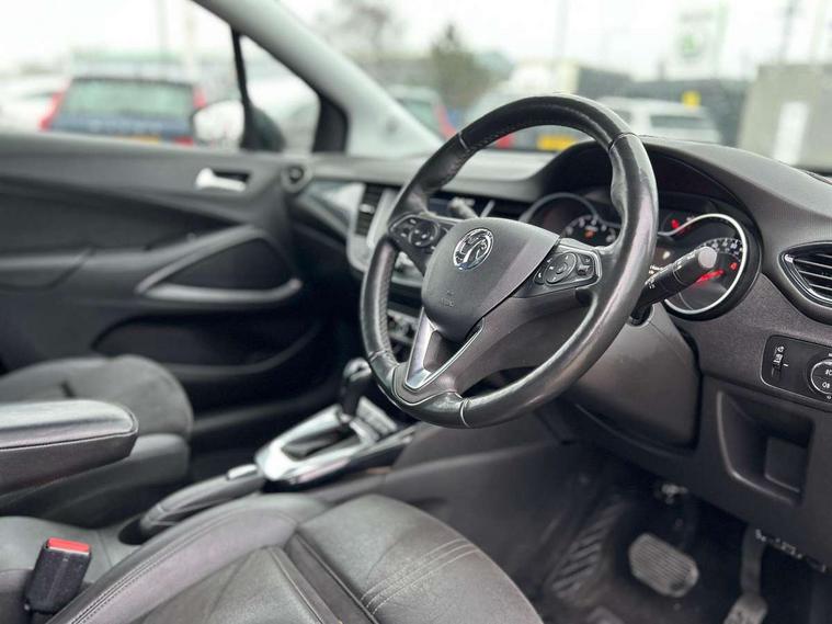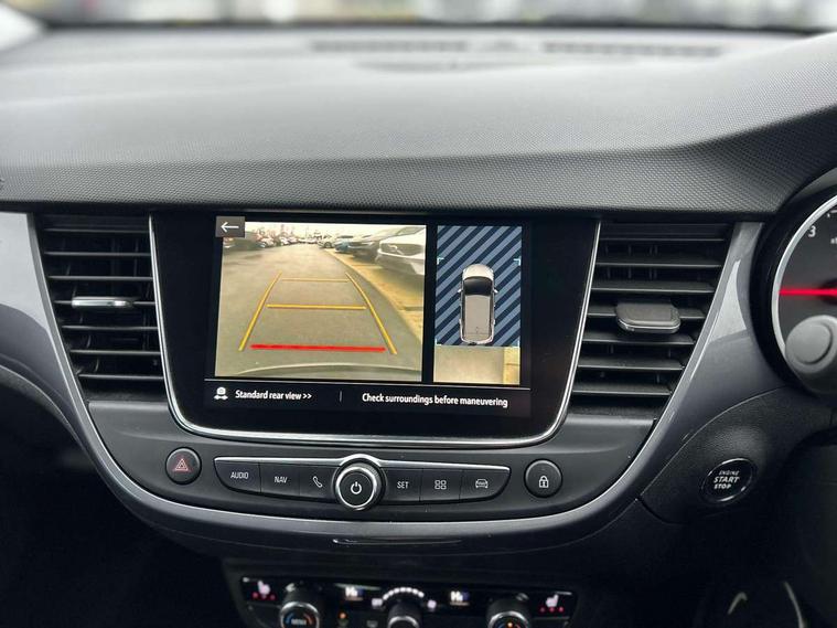 3.5" monochrome instrument colour display, Audible lights on warning, Bluetooth connectivity, Cruise control + speed limiter, Digital clock with automatic RDS time adjustment, Instrumentation - Speedometer, rev counter, low fuel gauge warning light + water temperature gauge warning light, shift up/down indicate light, Lane departure warning system, Multi function trip computer, Multimedia sat nav pro with 8" colour touchscreen, AM/FM, Bluetooth streaming, Bluetooth mobile phone portal, apple CarPlay/Android Auto + 6 speakers, Outside temperature display with ice warning, Refridgerant low indicator, Service interval indicator, Speed sensitive power steering, Speed sign recognition, Vauxhall connect, Wireless charger, Front wheel drive, 2 x USB connections, DAB Digital radio, Steering wheel mounted audio/phone/cruise controls, 2 speed wipers/wash wipe/intermittent wipe, Alloy effect front and rear skid plates, Automatic anti dazzle rear view mirror, Automatic headlamp levelling system, Automatic high beam control with cornering light, Automatic lighting control, Black radiator grille with chrome bar, Body colour door handles, Body colour front and rear bumpers, Chrome effect upper window moulding, Dark tinted rear side windows + tailgate window, Electrically adjustable and heated door mirrors, Front power windows with express up/down and anti-pinch function, Hazard warning lights, Headlamps for left side traffic, Heated rear window, Integrated tailgate spoiler, Intermittent rear wash/wipe, LED daytime running lights, LED front fog lights, LED Headlights, LED side repeat indicators, LED tail lights, Rain sensitive windscreen wipers, Rear fog lights, Rear power windows with express up/down and anti-pinch function, Reversing light, Side window demist vents, Silver effect side door mouldings, Silver roof rails, Silver skid plates - painted, Solar heat absorbing windscreen and windows, Two tone molding rocker with door side inserts in chroms, Welcome lighting, Windscreen demist vents, 12v power outlet - front, 12V power outlets on rear seat, 2 way front passive headrests, 3 spoke flat bottomed leather covered steering wheel with bezel decoration, 4 way electrically adjustable lumbar support for drivers seat, 4 way electrically adjustable lumbar support for front passenger seat, Adjustable rear seat backrest, Air recirculation facility, Alcantara suede/vinyl upholstery, Ambient lighting, Anti submarining ramps in front seats, Cabin particulate filter - removes dust, airborne particles and pollen, Driver and front passenger illuminated vanity mirrors with flip up covers, Dual zone electronic climate control, Ergonomic active front seats with 8 way manual adjustable driver and front passenger seats with height, reach, and backrest, Fade up/fade down on interior lighting, Four adjustable facia vents, Front door pockets with bottle holders, Front map reading lights, Fully carpeted luggage area, Glovebox with lid, Height adjustable front/rear head restraints, Illuminated load area, Interior courtesy light operated by all doors, Isofix system on outer rear seats, Jet black premium leather side bolsters, Luggage compartment cover, Multi-speed fan with Illuminated control, Open storage compartment in centre console, Passenger assist handles, Reach + rake adjustable steering column, Rear door pockets with bottle holders, Rear floor ventilation ducts, Rear reading lights, Satin chrome effect bezel on steering wheel, Seat cushion extension, Sliding 60/40 rear seat with centre rear seat armrest, Storage pockets on front seat backs, Two drinks holders in centre console, Uplevel centre console front centre armrest with storage, Rear view camera plus pack - Crossland, Versatility pack - Crossland, Winter pack - Crossland, 3x3 point rear seatbelts, 6 airbags - Driver and co-driver front, front side, head curtain roof airbags, front and rear row coverage airbags, ABS, Child locks on rear doors, CSC - Cornering stability control, Deactivate switch for side impact airbags, Deformation zones front and rear, Dual seatbelt pretensioners on front seats, EBD - Electronic brakeforce distribution, Energy absorbing steering column, Engine drag torque control, ESP + traction control, Front and rear seatbelt unfastened audible warning and warning light, Front side impact airbag, HBA (Hydraulic Brake Assist), Hill start assist, Hydraulic brake boost, Inertia reel lap and diagonal seatbelts for all seats, Passenger airbag deactivate switch, Rear seat belt pretensioners, Reinforced passenger safety cell, Seatbelt load limiter, Side impact protection beams, Smart seatbelt reminder for front and rear seats, Tyre pressure monitoring system, 2 remote folding keys, Electronically protected audio equipment, Engine immobiliser, Keyless entry and start, Locking wheel nuts, Remote central deadlocking, Remote control central locking activation switch on driver door, Remote control central locking operates on doors, tailgate and fuel filler flap, Remote security alarm system, Visible vehicle identification number, Black facia with silver trim insert, Black trim inserts on front doors, Cluster black with chrome rings, 17" five twin spoke diamond bi colour alloy wheels,