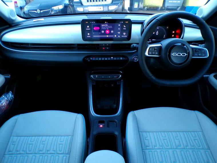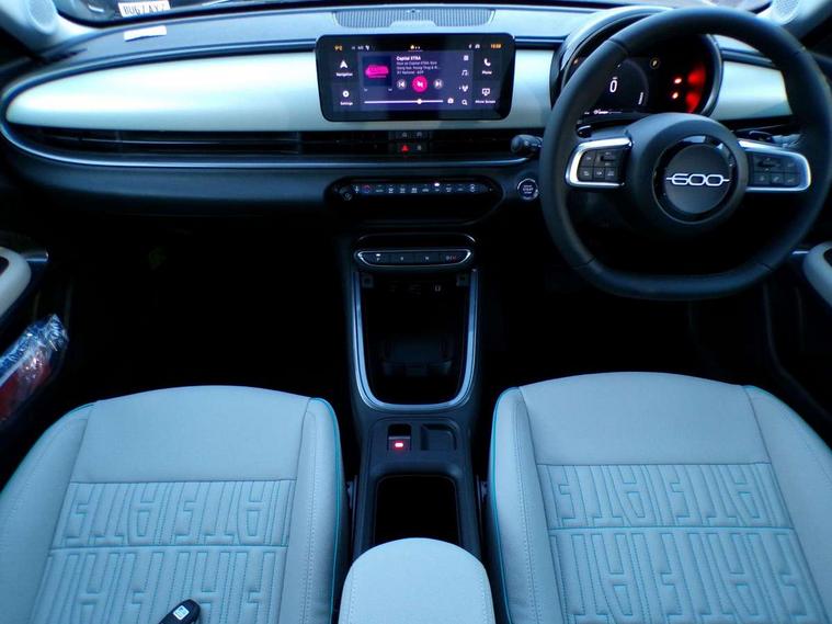 360 degree parking sensors with 180 degree rear view camera, 7" TFT digital cluster, Autonomous driving level 2: Adaptive cruise control with stop & go and lane centering, Blind spot detection, Bluetooth connectivity, BSRF connectivity box, Connected services, Drowsy driver detection, Emergency E-call assist, Engine emission level default, GSR II step 1, Hands free power liftgate, Intelligent speed assist, Lane keeping assistant (LKA), Odometer, Power assist steering, Rain and dusk sensors, Semi-automatic parking with Visiopark 1 system, Traffic sign recognition, Wireless apple car play/android Auto, Wireless charging pad for smartphones, Without drive mode selector, L2-AGM 12V battery, 1st Row USB type-A and USB type-C, 2nd Row USB type-C, 6 speaker audio system, Radio, Uconnect infotainment 10.25" touchscreen with integrated navigation system and DAB, All power windows express Up/Down, Auto dimming frameless rear view mirror, Automatic headlights, Automatic high/low beam, Body coloured door handles, Chrome day light openings, Chromed exhaust tip, Electric adjustable/heated/folding door mirrors, Exterior chrome accents, Front and rear Chromed 600 logo, Gloss black finish B pillar, Gloss black shark fin antenna, Glossy black door mirrors, Heated windscreen wiper blade area, LED 3rd brake light, LED daytime running lights, LED Fog lamps with cornering function, LED front signature lighting, LED front turn indicators and position lights, LED rear lights, LED rear signature lighting, LED reflector headlamps, Matt black side skirts with 600 chromed logo, Privacy glass, Puddle lights, Rear bumper embossed 600 logo, Rear roof spoiler, Rear side wing doors, Rear wiper, 2 Spoke synthetic leather steering wheel with audio control, 3 rear headrests, 3 seat bench in 2nd row, 6 way manually adjustable front passenger seat, 6 way power adjustable driver seat with lumbar support and massage function, Adjustable trunk floor, Automatic climate control, Auxilliary 12V power socket, Cargo flex fit, Chrome interior door handles, Dark metachrome dashboard ring, English handbook, Front centre armrest, Front headrests, Front passenger grab handle, Front seatback pockets, Heated front seats, ISOFIX attachment on front passenger and rear passenger seats, Matt Ivory painted dashboard fascia, Metachrome central compartment bezel, Monogram Synthetic leather upholstery, Paddle shifts, Partial body cover for shipment, Predisposal for accessory upgrade to default tunnel pad cover (dedicated prnd bezel), Rear seat 40/60 split, Single front passenger seat, Smart 15L storage central tunnel with La prima tunnel pad cover, Sunvisor label ciao Fiat, Sunvisors with vanity mirrors, Velour floor mats, 3x3 point rear seatbelts, 6 airbags, ABS, Autonomous Emergency Brake (AEB) & Vulnerable Road User (VRU) Protection, Child locks on rear doors, Electronic parking brake with auto hold, ESC (Electronic Stability Control), Front passenger airbag deactivation, Seatbelt reminder and pretensioners for all seats, Anti-theft volumetric alarm, Anti-theft wheel bolts, Passive entry and keyless go, 18" Diamond cut alloy wheels, Fix and go puncture repair kit,