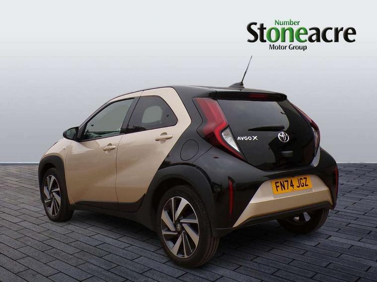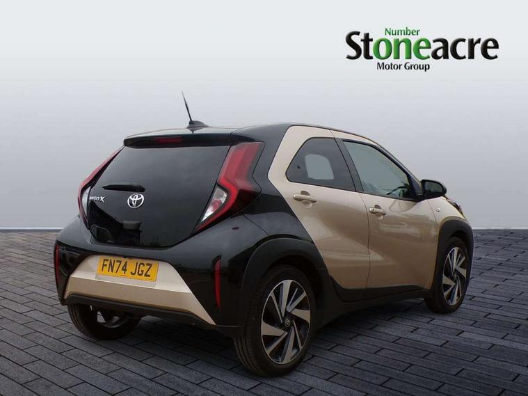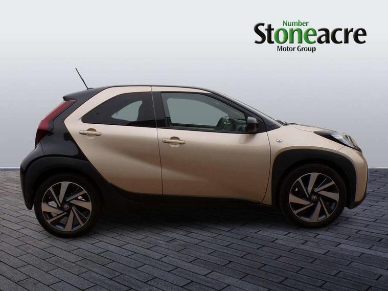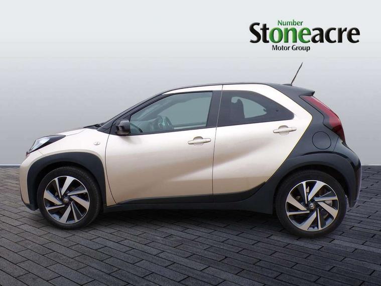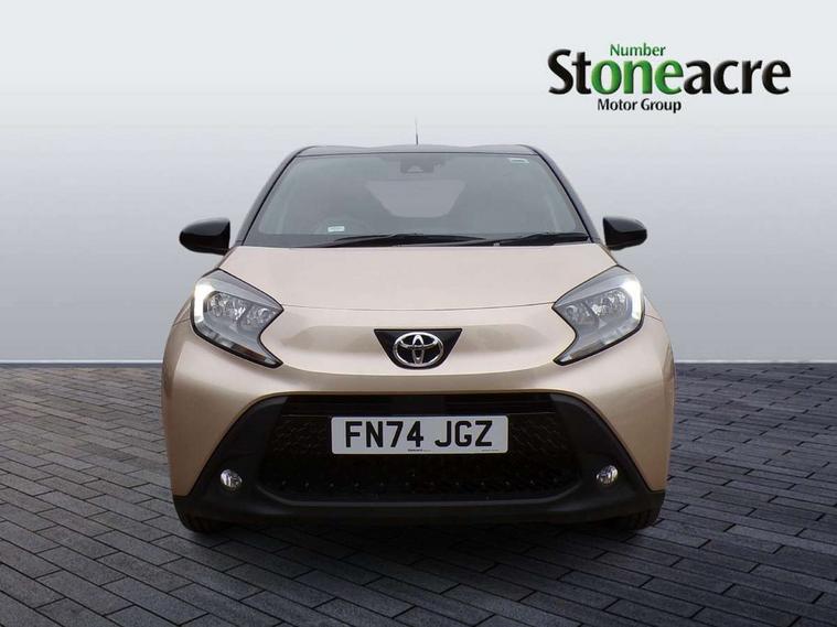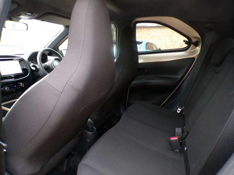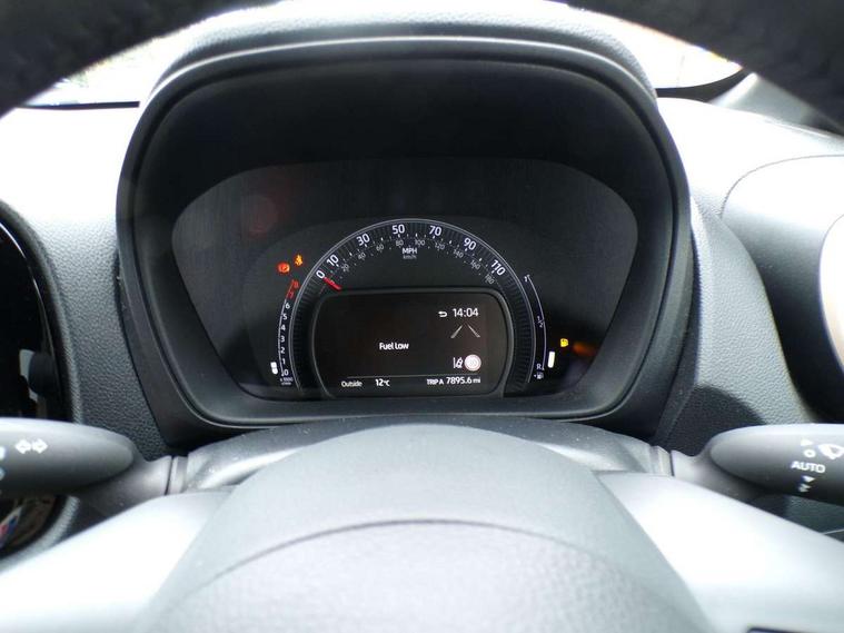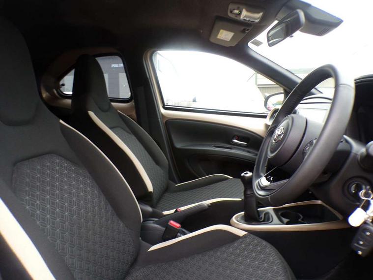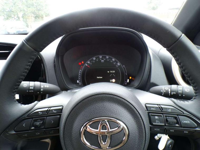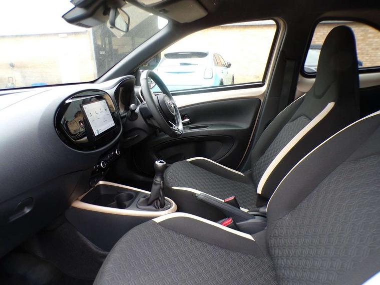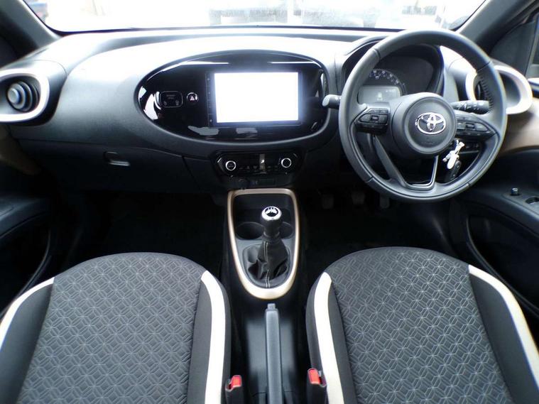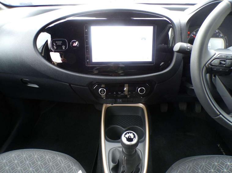 4.2" TFT colour screen, Adjustable speed limiter, Analogue speedometer, Bluetooth connectivity, Digital tachograph, Driver attention alert system, eCall emergency call system, Electric power steering, Intersection turn assist, Key reminder warning, Noise reduction kit, Pre collision system with emergency steering assist, Reversing camera with static guide lines, Smart phone integration with Apple car play/Android Auto, Speed limit display, Start and stop, Vehicle Stability Control (VSC), 4 speakers, 9" HD multimedia display touch screen with Toyota smart connect, DAB digital audio broadcast, USB connector, Auto headlights, Auto wipers, Automatic headlights cut-off, Bicycle towing hook, Black contrast roof, Black side protection mouldings, Black wheel arch mouldings, Body colour door handles, Body coloured front bumper, Boot door scuff plate, Eclipse black rear bumper, Electric heated door mirrors, Follow me home headlights, Front fog lights, Front power windows, Gloss black door mirrors, Gloss black upper front grille, Headlight cut-off reminder, LED daytime running lights, LED front light guide, LED High mounted stop lamp, Manual day/night rear view mirror, Manual headlight levelling, Pagoda roof, Power adjustable door mirrors, Power back door, Privacy glass, Projector halogen headlights, Rain sensor, Rear combination lights LED bulb type, Rear side wing doors, Rear windscreen defogger, Rear windscreen wiper, Short antenna, Variable intermittent windscreen wipers, 12v power outlet - front, 2 seat bench in 2nd row, 3 spoke leather steering wheel, 50/50 split folding rear seat, Adhesive roof headlining, Adjustable speed limiter switch on steering wheel, Audio and telephone switches on steering wheel, Auto air conditioning, Black insert on steering wheel, Black roof lining, Boot light, Centre room light, Chrome interior door handles, Chrome surround on air conditioning buttons, Clean air filter, Console box storage in body color, Fabric upholstery, Floor mats, Front and rear cup holders, Front head rest deco art, Front head restraints, Height adjustable driver seat, Intelligent adaptive cruise control switch on steering wheel, ISOFIX child restraint system on rear seats, Lane departure alert switch on steering wheel, Leather gearshift knob, Manual tilt steering wheel, Manually reclining and sliding driver seat, Manually reclining and sliding front passenger seat, Multimedia switches on steering wheel, Pollen filter, Rear door pockets, Rear head restraints, Satin silver insert on gear shift knob, Single compartment glovebox with lights, Single front passenger seat, Soft tonneau cover, Sun visors with mirror on driver and passenger side, Voice recognition switch on steering wheel, Toyota safety sense pack - Aygo X, Anti lock braking system + Electronic brake force distribution, Child safety door lock, Emergency brake light signal (EBS), Hill start assist control (HAC), Passenger airbag on/off switch, Seat belt reminder for front and rear seats, Supplement restraints system (SRS) - 6 airbags, Traction control, Tyre pressure warning system, Immobiliser, Remote power door locks, Black wheel centre caps, Tyre repair kit,