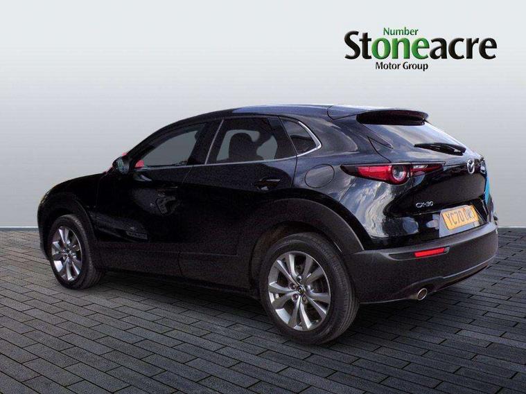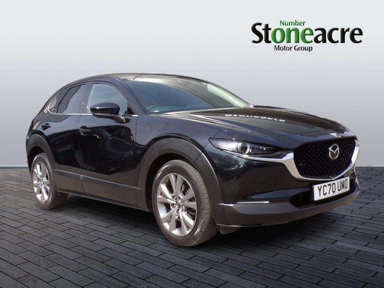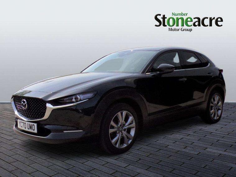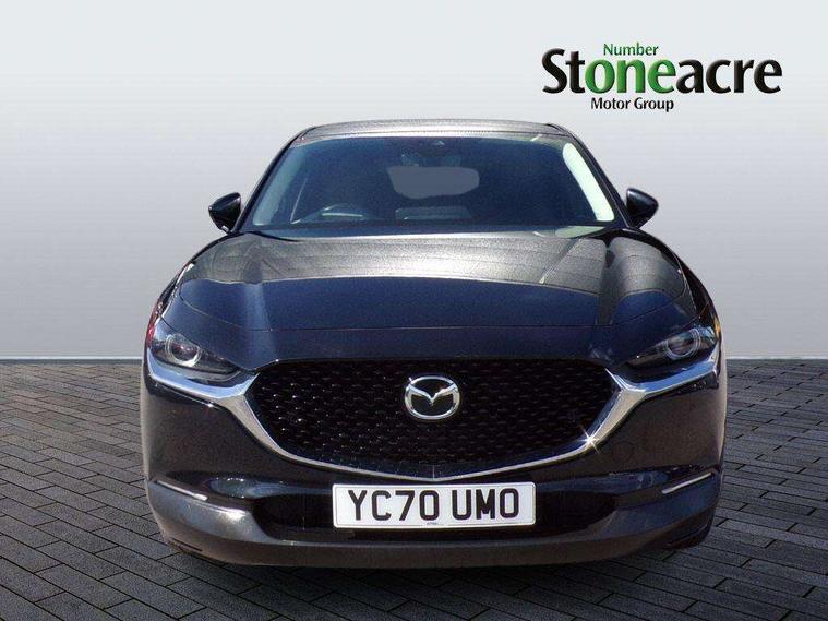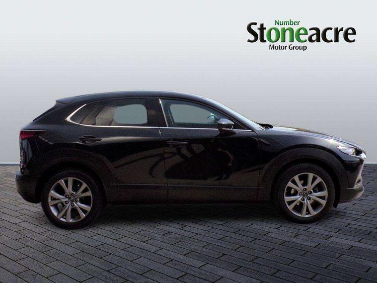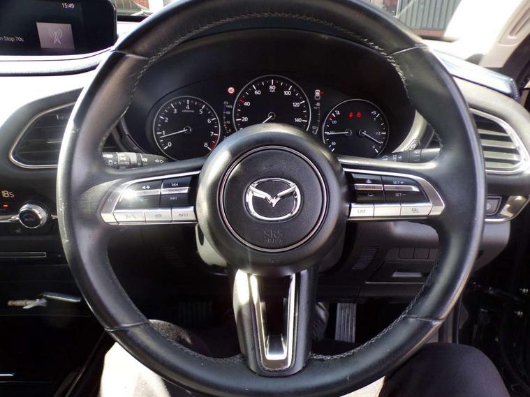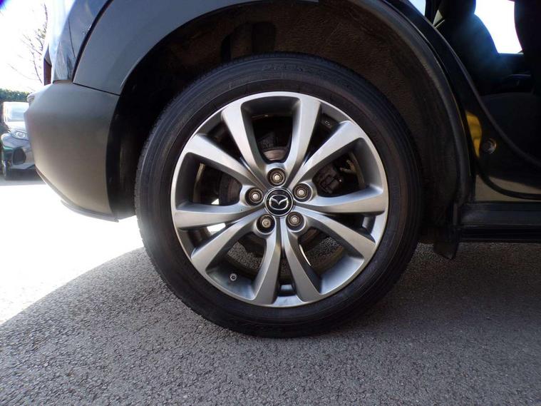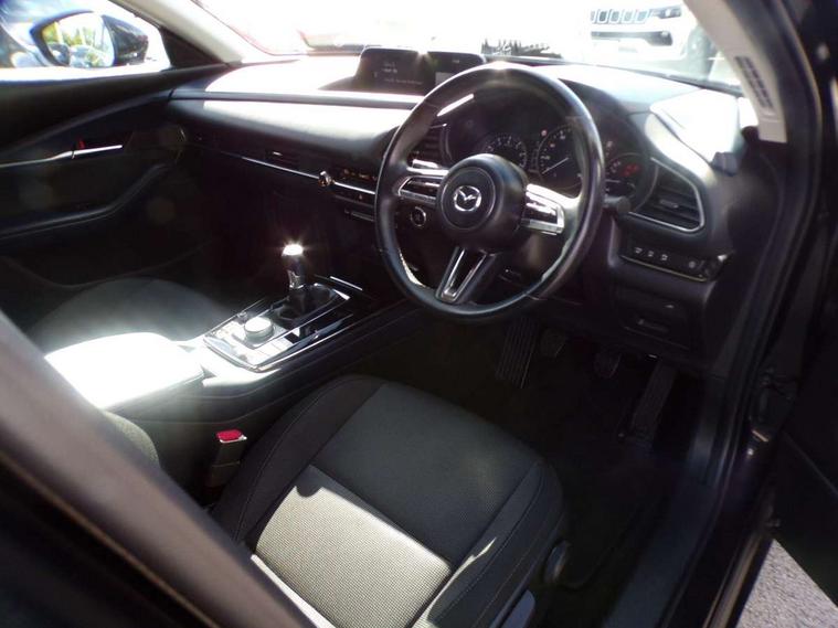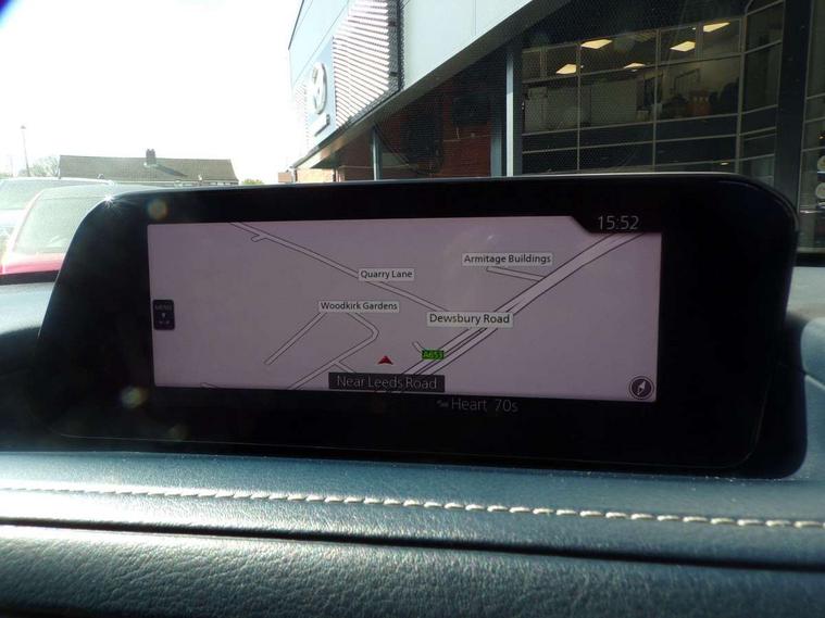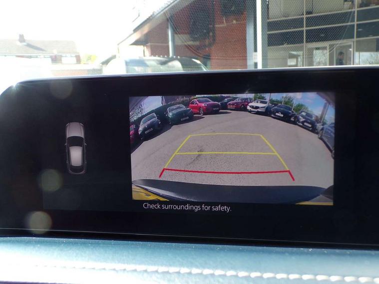 7" TFT Colour driver instrument panel display, 8.8" Colour centre touch screen display with Mazda Connect infotainment, Adaptive cruise control (Mazda radar cruise control) features stop and go, Apple car play/Android Auto, Blind spot monitoring with rear cross traffic alert, Driver attention alert system, E-call with GPS, Emergency stop signalling system, Engine start/stop button, Front and rear parking sensors, Integrated bluetooth, Integrated Mazda navigation system, Intelligent speed assist, Lane keep assist system (LAS) with Lane departure warning system (LDWS), PAS, Power lift gate, Reversing camera, Service indicator, Trip computer, Window projected colour active driving display (head up display) with traffic sign recognition, Cylinder Deactivation, i-stop, 2 USB charging ports, AM / FM / DAB radio with 8 speakers, CD player, Multimedia Commander including separate volume dial, Steering wheel mounted audio/bluetooth controls, Adaptive LED Headlights, Auto dimming driver's door mirror, B-pillar and C-pillar garnishes in gloss black finish, Body coloured, electrically adjustable, heated auto power folding door mirrors with integrated indicators, Coming/leaving home lighting function, Dual chrome exhaust, Dusk sensing headlights, Electric front/rear windows with one touch auto up/down, Frameless auto dimming interior rear view mirror, Front kodo turn signal, Gloss black front grille, Gloss black rear roof spoiler, High beam assist, LED headlamps with auto levelling, Privacy glass (rear side windows and rear screen), Rain sensing front wipers with adjustable speed and intermittent wipe, Rear fog lights, Rear wiper, Signature front LED daytime running lights, Signature LED rear combination lights with LED rear turn lights, 12V power outlet in centre console, 60/40 split fold down rear seats, Chrome horn pad ring, Cloth door panel inserts, Cloth upholstery with interior accents, Dashboard, door cards and front centre armrest in navy blue cloth, Driver and front passenger visors with covered vanity mirror and driver ticket holder, Driver seat manual slide, recline and height adjust, Driver, Front passenger and two rear grab handles with coathooks, Dual zone climate control air conditioning with rear air vents, Folding rear centre armrest with two cup holders, Front and rear (x3) head restraints, Front and rear door pockets, Front and rear LED lighting, Front armrest, Front centre storage with two cupholders, Front passengers seat manual slide, recline and height adjustment, Gear shift indicator, Glovebox illumination, Heated front seats with 3 stage setting, ISOFIX child seat anchorage points attached on outer rear seats, Leather wrapped gear shift knob, Leather wrapped steering wheel with telescopic and tilt adjustment, Luggage compartment light, Rear passenger seat map pockets, Roof mounted sunglasses holder, 3 point ELR front seat belts x2 with pretensioners, 3 point ELR rear seat belts, Anti-lock braking system (ABS), Driver/Front Passenger airbags, Drivers knee airbag, DSC - Dynamic Stability Control, Electronic parking brake with auto disengage function and auto hold function, Front and rear curtain airbags, Front passenger airbag cut-off switch, Front side airbags, Front smart city brake support, G-Vectoring control plus, Hill launch assist, Mild Hybrid system with regenerative braking, Seatbelt reminder for driver/front passenger and rear seats, Traction control system (TCS), Tyre pressure monitoring system (TPMS), Remote central locking with deadlocking and automatic door lock when driving, Smart keyless entry, Thatcham accredited alarm and immobiliser, 18" Silver metallic alloy wheels, Emergency tyre repair kit,