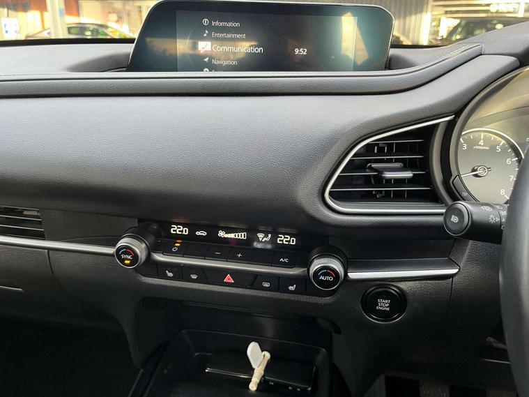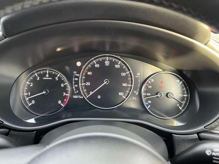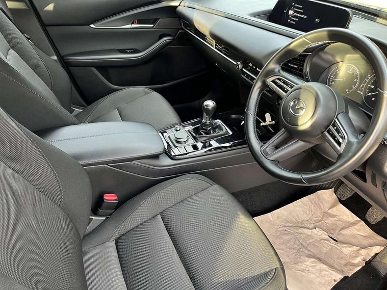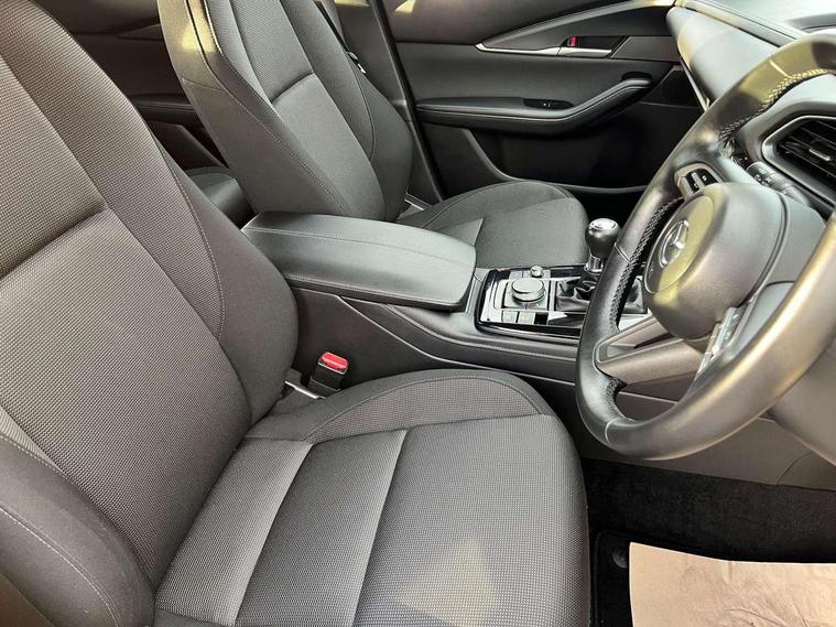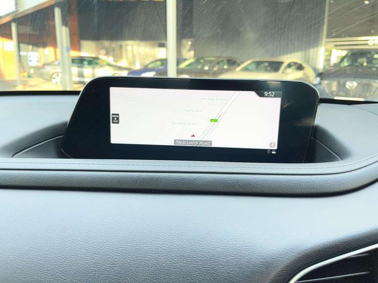 7" TFT Colour driver instrument panel display, 8.8" Colour centre touch screen display with Mazda Connect infotainment, Adaptive cruise control (Mazda radar cruise control), Apple car play/Android Auto, Blind spot monitoring with rear cross traffic alert, Driver attention alert system, E-call with GPS, Emergency stop signalling system, Engine start/stop button, Front and rear parking sensors, Integrated bluetooth, Integrated Mazda navigation system, Intelligent speed assist, Lane keep assist system (LAS) with Lane departure warning system (LDWS), Mazda connected services, PAS, Reversing camera, Service indicator, Tailgate, Traffic sign recognition, Trip computer, Windscreen projected colour active driving display (HUD), Cylinder Deactivation, i-stop, 2 USB charging ports in front inner central armrest, AM / FM / DAB radio with 8 speakers, Multimedia Commander including separate volume dial, Steering wheel mounted audio/bluetooth controls, B-pillar and C-pillar garnishes in satin black finish, Auto dimming driver's door mirror, Auto dimming rear view mirror, Auto headlight levelling, Body coloured, electrically adjustable, heated auto power folding door mirrors with integrated indicators, Chrome finish signature wing in front grille, Coming/leaving home lighting function, Dual chrome exhaust, Dusk sensing headlights, Electric front/rear windows with one touch auto up/down, Front kodo turn signal, Gloss black rear roof spoiler, LED headlights with halogen daytime running lights and high beam control, LED rear combination lights, Rain sensing front wipers with adjustable speed and intermittent wipe, Rear fog lights, Rear side wing doors, Rear wiper, Satin black front grille, Third brake light, 12V power outlet in centre console, 3 seat bench in 2nd row, 60/40 split fold down rear seats, Cloth upholstery with interior accents, Dark cloth door panel inserts, Dashboard, door cards and front centre armrest in black cloth, Driver and front passenger visors with covered vanity mirror and driver ticket holder, Driver seat manual slide, recline, height and seat tilt adjust, Driver, front passenger and two rear door storage, Driver, Front passenger and two rear grab handles with coathooks, Dual zone climate control air conditioning with rear air vents, Folding rear centre armrest with two cup holders, Front and rear (x3) head restraints, Front and rear LED lighting, Front armrest, Front centre storage with two cupholders, Front passenger seatback pockets, Front passengers seat manual slide, recline and height adjustment, Gear shift indicator, Glovebox illumination, Heated front seats with 3 stage setting, ISOFIX child seat anchorage points attached on outer rear seats, Leather wrapped gear shift knob, Leather wrapped steering wheel with telescopic and tilt adjustment, LED luggage compartment lighting, Light roof headlining and pillars, Roof mounted sunglasses holder, Single front passenger seat, 3 point ELR front seat belts x2 with pretensioners, 3 point ELR rear seat belts, Anti-lock braking system (ABS), Drivers knee airbag, DSC - Dynamic Stability Control, Electronic parking brake with auto disengage function and auto hold function, Front and rear curtain airbags, Front dual stage driver and single stage front passenger airbags, Front passenger airbag cut-off switch, Front side airbags, Front smart city brake support, G-Vectoring control plus, Hill launch assist, Manual child lock in rear doors, Mild Hybrid system with regenerative braking, Seatbelt reminder for driver/front passenger and rear seats, Traction control system (TCS), Tyre pressure monitoring system (TPMS), Remote central locking with deadlocking and automatic door lock when driving, Smart keyless entry, Thatcham accredited alarm and immobiliser, 16" Grey alloy wheels, Emergency tyre repair kit,