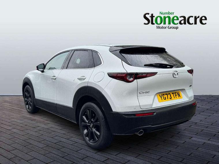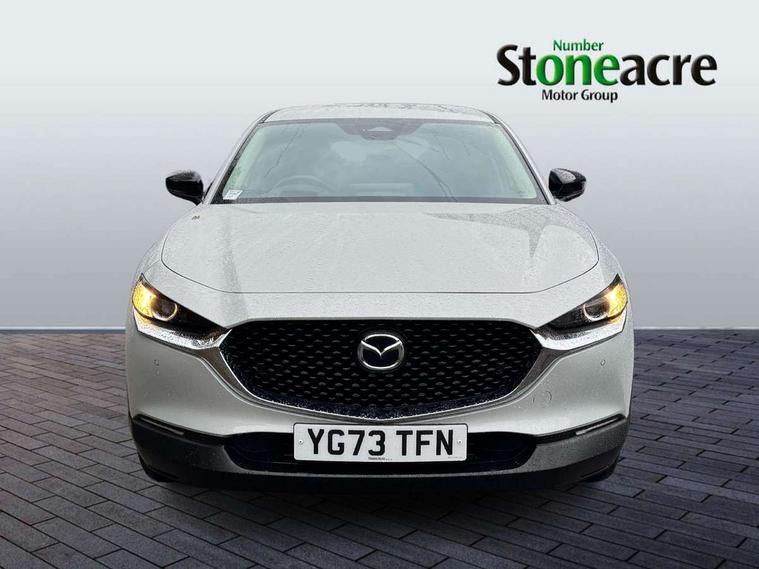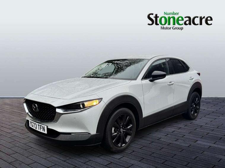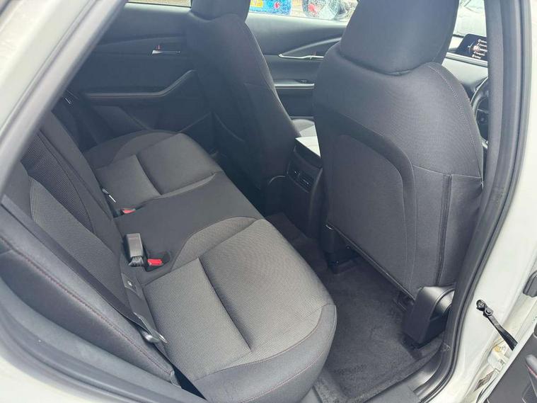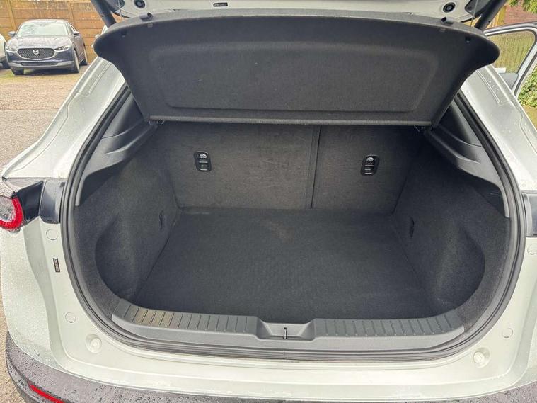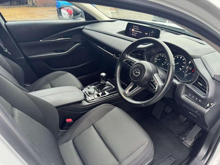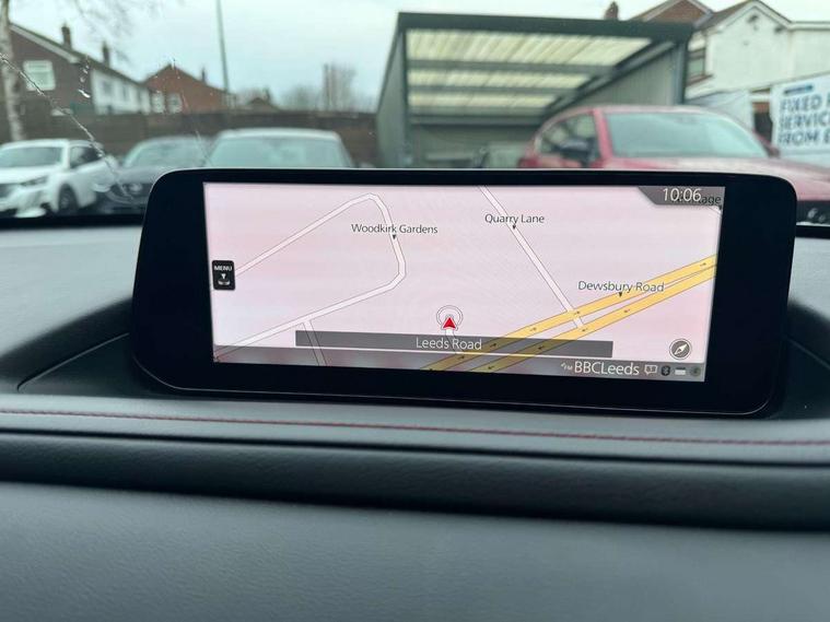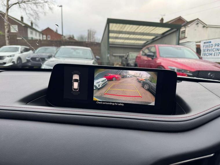 10.25" display with Mazda Connect infotainment, 7" TFT Colour driver instrument panel display, Adaptive cruise control (Mazda radar cruise control), Blind spot monitoring with rear cross traffic alert, Driver attention alert system, E-call with GPS, Emergency stop signalling system, Engine start/stop button, Front and rear parking sensors, Integrated bluetooth, Integrated Mazda navigation system, Intelligent speed assist, Lane keep assist system (LAS) with Lane departure warning system (LDWS), Mazda connected services, PAS, Power lift gate, Qi wireless charging, Reversing camera, Service indicator, Tailgate, Traffic sign recognition, Trip computer, Windscreen projected colour active driving display (HUD), Wireless Apple CarPlay/Android Auto, Cylinder Deactivation, i-stop, 2 USB charging ports in front inner central armrest, AM / FM / DAB radio with 8 speakers, Multimedia Commander including separate volume dial, Steering wheel mounted audio/bluetooth controls, Auto dimming rear view mirror, Auto headlight levelling, B-pillar and C-pillar garnishes in piano black finish, Black electrically adjustable, heated auto power folding door mirrors with integrated indicators, Chrome finish signature wing in front grille, Coming/leaving home lighting function, Dual chrome exhaust, Dusk sensing headlights, Electric front/rear windows with one touch auto up/down, Front kodo turn signal, Gloss black front grille, Gloss black rear roof spoiler, LED headlights with halogen daytime running lights and high beam control, LED rear combination lights, Privacy glass (rear side windows and rear screen), Rain sensing front wipers with adjustable speed and intermittent wipe, Rear fog lights, Rear side wing doors, Rear wiper, Third brake light, 12V power outlet in centre console, 3 seat bench in 2nd row, 60/40 split fold down rear seats, Chrome interior trim accents with steering wheel centre bezel, surround of engine start / stop button and glove box handle, Cloth upholstery with red stitching and interior accents, Dark cloth door panel inserts, Dashboard, door cards and front centre armrest in black cloth with red stitching, Driver and front passenger visors with covered vanity mirror and driver ticket holder, Driver seat manual slide, recline, height and seat tilt adjust, Driver, front passenger and two rear door storage, Driver, Front passenger and two rear grab handles with coathooks, Dual zone climate control air conditioning with rear air vents, Folding rear centre armrest with two cup holders, Front and rear (x3) head restraints, Front and rear LED lighting, Front armrest, Front centre storage with two cupholders, Front passenger seatback pockets, Front passengers seat manual slide, recline and height adjustment, Gear shift indicator, Glovebox illumination, Heated front seats with 3 stage setting, ISOFIX child seat anchorage points attached on outer rear seats, Leather wrapped gear shift knob, Leather wrapped steering wheel with telescopic and tilt adjustment, LED luggage compartment lighting, Light roof headlining and pillars, Roof mounted sunglasses holder, Single front passenger seat, 3 point ELR front seat belts x2 with pretensioners, 3 point ELR rear seat belts, Anti-lock braking system (ABS), Drivers knee airbag, DSC - Dynamic Stability Control, Electronic parking brake with auto disengage function and auto hold function, Front and rear curtain airbags, Front dual stage driver and single stage front passenger airbags, Front passenger airbag cut-off switch, Front side airbags, Front smart city brake support, G-Vectoring control plus, Hill launch assist, Manual child lock in rear doors, Mild Hybrid system with regenerative braking, Seatbelt reminder for driver/front passenger and rear seats, Traction control system (TCS), Tyre pressure monitoring system (TPMS), Remote central locking with deadlocking and automatic door lock when driving, Smart keyless entry, Thatcham accredited alarm and immobiliser, 18" Black metallic alloy wheels, Emergency tyre repair kit,
