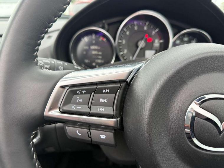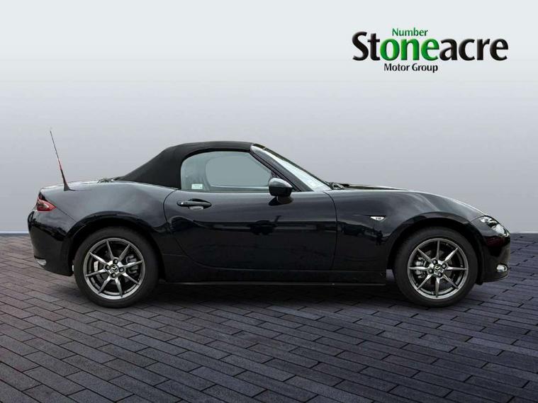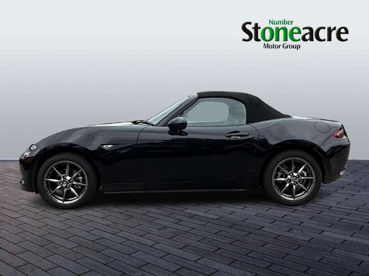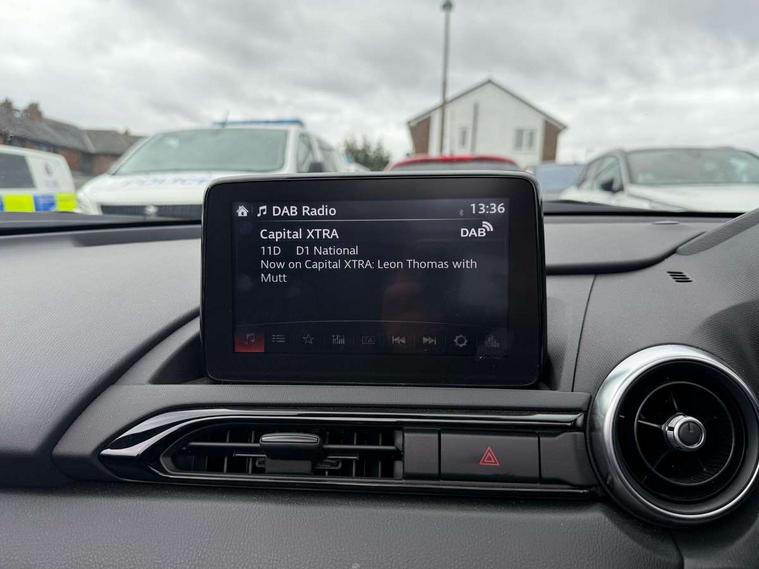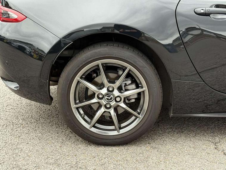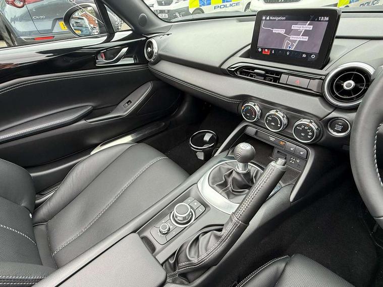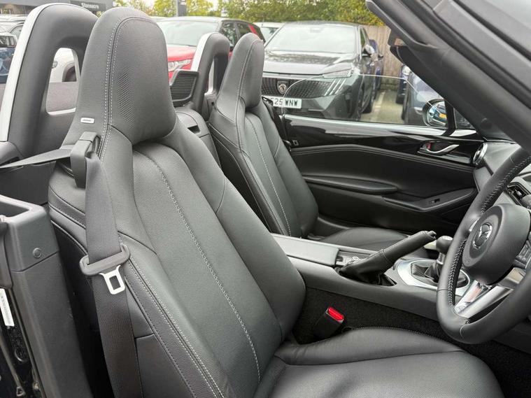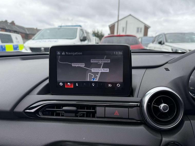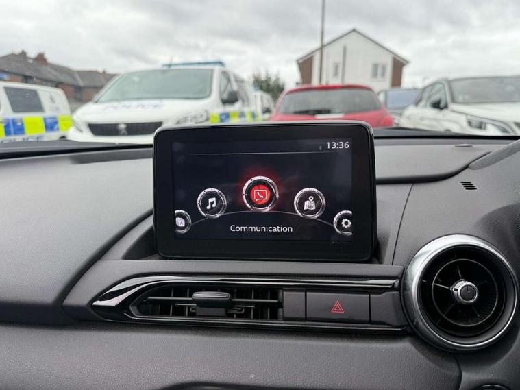 7" colour touch screen with Mazda connect infotainment, Aha and stitcher app, Analogue speedometer, Apple car play/Android Auto, Cruise control + speed limiter, Driver alert system, eCall emergency call system, Emergency stop signalling system, Engine start/stop button, Hands free phone preparation, Integrated bluetooth with hands-free calling, bluetooth audio and easy access to phone contacts, Integrated navigation system, Lane departure warning system, Multi dot display tachometer and electric odometer, PAS, Rear parking sensor, Service indicator, Traffic sign recognition, Trip computer, Water temperature gauge, I-ELOOP, i-stop, 2 USB/aux input socket, Multimedia Commander including separate volume dial, Premium Bose sound system with 9 speakers with 2 in each front headrest, AM/FM/DAB radio and MP3, Steering wheel mounted audio/bluetooth controls, Adaptive front lighting system, Auto dimming rear view mirror, Automatic headlamp levelling, Black scuff plates with stainless steel insert, Body colour bumpers, Body colour co ordinated interior upper door trim, Body coloured electric/heated door mirrors, Coming/leaving home lighting function, Dual exhaust pipes, Dusk sensitive headlamps, Electric front windows/one touch facility, High mounted rear brake light with Black coloured cover, LED 3rd brake light, LED daytime running lights, LED Headlights, LED indicator lights, LED rear lights, Manually operated black premium cloth soft top with heated rear glass window, Piano Black fashion bars, Rain sensing front wipers, Rear boot, 12V socket, Centre console storage box, Chrome Air conditioning dials, Climate control air conditioning, Coin Box, Driver and front passenger sunvisors with covered vanity mirror and driver ticket holder, Driver seat manual slide, recline and tilt adjustment, Front centre armrest, Front head restraints, Gear shift indicator, Heated front seats, in 3 heat levels, Interior courtesy light, ISOFIX front passenger seat child seat compliance, Leather gear knob, Leather handbrake lever, Leather steering wheel, Lockable rear centre box with lid, Passenger seat + manual slide/recline adjust, Perforated leather upholstery, Side door trim in black vinyl with silver stitching, Single front passenger seat, Sports seats, Tilt/telescopic steering column, Two cupholders, Windblocker, 3 point ELR front seatbelts with pretensioners, ABS+Electronic Brake force Distribution, Deployable Hood System (DHS), Driver and front passenger airbags, Driver and passenger seatbelt reminder audible warning, Front dynamic yaw stability control, Hill hold assist, Passenger airbag deactivate switch, SCBS - Smart City Brake Support, rear plus front with autonomous emergency braking, Side airbags, Traction control, Tyre pressure monitor, Remote central locking with deadlocking and remote boot release, Smart keyless entry, Superlocking, Thatcham category 1 alarm + immobiliser, Chrome air vent surrounds, Chrome meter rings, Dashboard panel - vinyl leather Black, 16" Bright Silver alloy wheels, Tyre puncture repair kit,