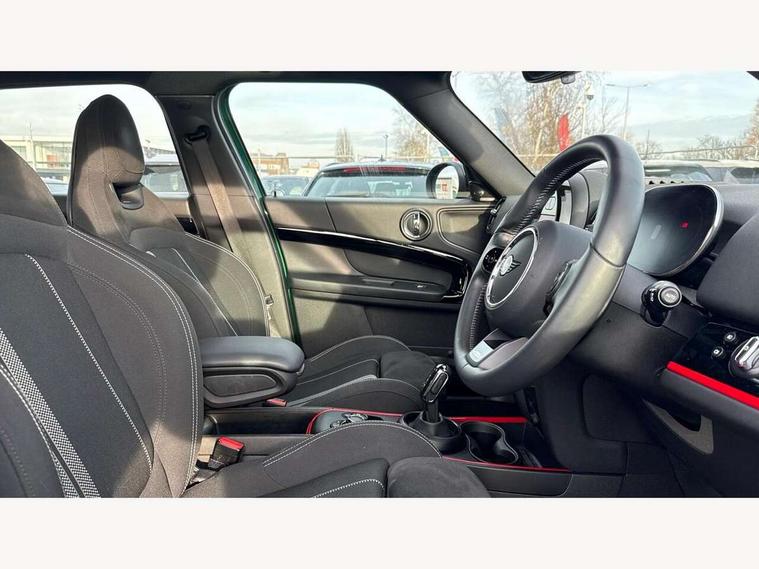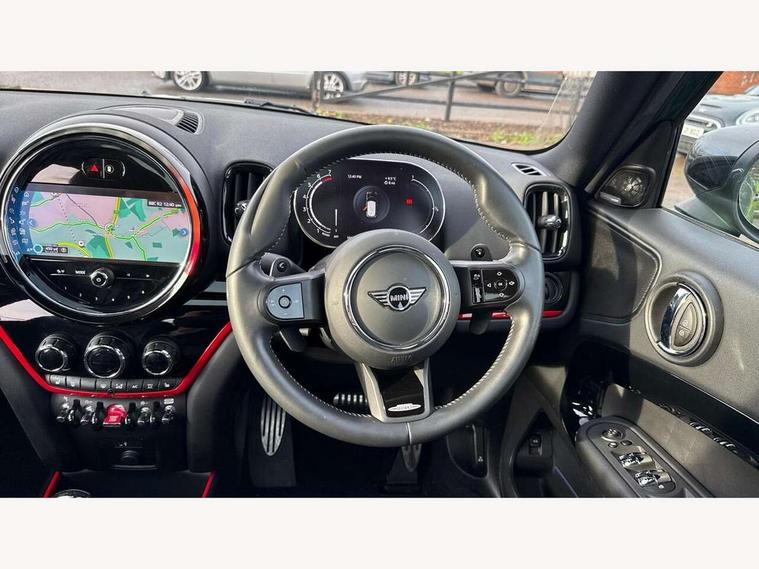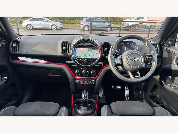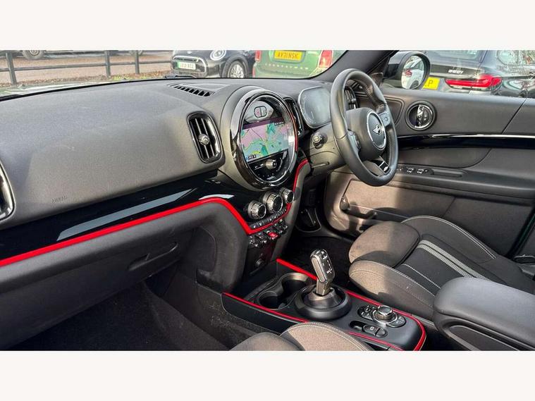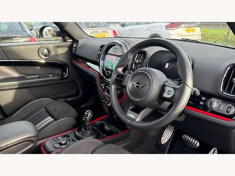 Active Guard incl speed limiting and lane departure functions with auto steering, and front collision warning with brake intervention, Automatic start/stop function with brake energy recuperation, Compatible mobile phone bluetooth with audio streaming, Cruise control with brake assist, Electro-mechanical speed dependant steering assistance, Instrument cluster, MINI Driving Modes - centre toggle switch to control driving setting (sport, mid and green), Mini E-call, On board computer, Double Vanos system, Fully variable valve control, High precision injection, Performance Control, Steptronic sport transmission with double clutch and steering wheel paddles, FM tuner and DAB digital radio, 3rd brake light, Bonnet scoop, Chrome fuel filler cap, Day time driving lights, Dynamic brake lights, Electric windows, Heated rear window, Heated windscreen washer jets, John Cooper Works - aerodynamic kit (front and rear apron, spoiler), front and rear sport bumpers and part-painted side sills with door sill finishers, John Cooper Works Logo, LED fog lights, Metal door sill strips with Cooper S imprint, Model logo, Model logo on Tailgate, Rain sensor with auto headlights, Rear fog lights, Rear side wing doors, Rear window wiper, Side scuttle panel with integrated indicator, Split rear doors, Sun/heat protection glass, White indicator lenses, 12V socket in centre console, 3 seat bench in 2nd row, 360L luggage compartment capacity, 4 lashing eyes in luggage compartment, 40:20:40 split folding rear seats, Anthracite headlining with grab handles and clothes hooks, Chrome interior highlights, Colour line - Carbon black, Cupholders, English handbook, Front headrests, Glove compartment, Height and length steering column adjustment, Interior lighting with 12 basic colours selectable via toggle switch in roof, Isofix rear child seat preparation, LED reading lights, vanity mirror lights, front foot well light and spotlight on front seats, Mini John Cooper Works leather gearshift lever and handbrake gaiters, Multifunction steering wheel, Nappa leather steering wheel with MINI Yours logo, Rear headrests, Single front passenger seat, Stainless steel pedals and foot rest, Storage compartments in doors, Sunvisors with vanity mirrors, Excitement pack - Countryman, Navigation pack - Countryman, Piano black exterior pack - Countryman Cooper S/SD/SE/Boardwalk, 2 tone horn, 3 point seatbelts on all seats, 6 Airbags - front, side, head and seat belt tensioners, Anti-lock braking system (ABS), DSC - Dynamic Stability Control, Electronic handbrake, Front and rear disc brakes, Hill start assist, Manual rear child locks, Tyre pressure monitoring system, Alarm system with tilt sensor, monitoring doors, bonnet interior and tailgate, Auto drive away locking, Deadlocking function, Electronic vehicle immobiliser, Locking wheel bolts, Start/stop toggle with keyless go, Piano black JCW interior trim, Tool kit,