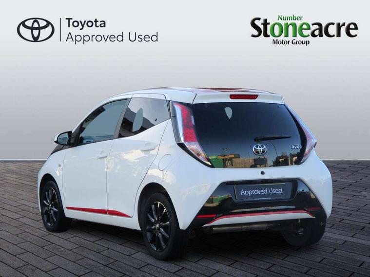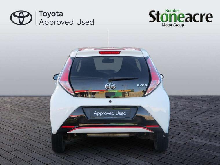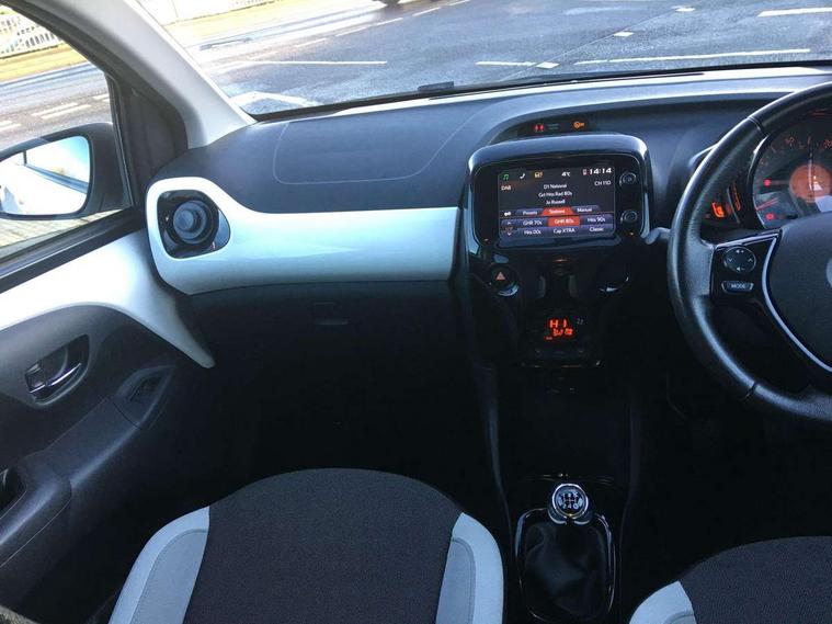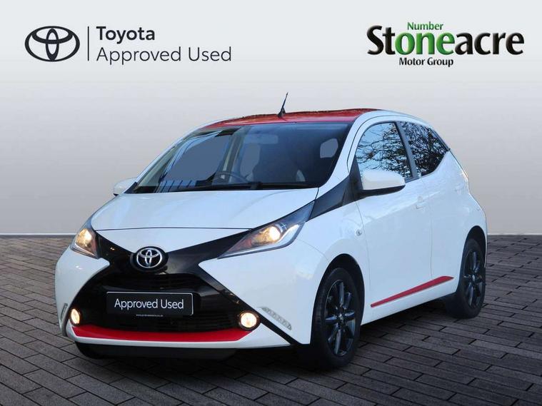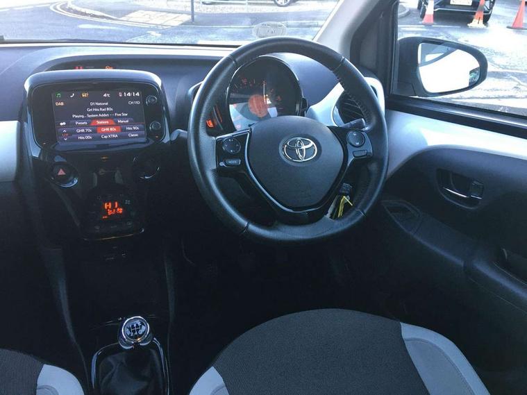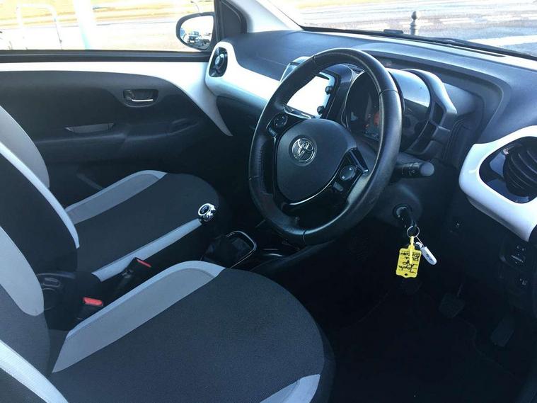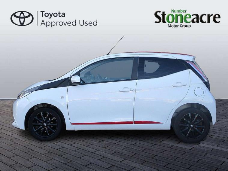 7" touch screen, Bluetooth system, Digital clock, Electric power steering, Fuel indicator with low level warning, Lights on warning, MirrorLink, Rear view camera, Speed limiter, Tachometer, Vehicle Stability Control (VSC), 4 speakers, Auxiliary input socket, Bluetooth audio streaming, DAB Digital radio, Multimedia System, Stereo radio, USB connection, 2 speed wipers/variable intermittent/mist function, Automatic headlights, Body colour bumpers, Body colour door handles, Body colour door mirrors, Electric adjustable door mirrors, Electric front windows, Front fog lights, Green tinted glass, Headlamp levelling, Heated door mirrors, Heated rear windscreen, LED daytime running lights, Privacy glass, Rear spoiler, Rear window demister, Rear wiper, Red front bumper accent, Red roof decal, Red side sills, Roof mounted aerial, 12V Accessory socket, 3 spoke leather steering wheel, 50/50 split folding rear seat, Air recirculation system, Auto air conditioning, Body colour instrument panel, Centre console storage, Chrome insert to gearknob, Chrome interior door handles, Driver and passenger sunvisors, Driver's seat height adjuster, Driver/passenger seat recline/slide adjust, Driver/passenger vanity mirrors with covers, Front and rear door pockets, Front cupholder, Front map reading lights, Front sports seats, Gleam cloth upholstery, Glovebox, Height adjustable front head restraints, Isofix system on outer rear seats, Leather gear knob, Pollen filter, Rear cupholders, Rear headrests, Steering wheel mounted radio/phone controls, Stepless tilt adjustable steering column, Storage bins on all doors, Tonneau cover, Outburst pack red pop - Aygo, ABS, Driver and passenger airbags, ESP, Fasten seatbelt reminder, Front side airbags, Height adjustable front seatbelts with pre-tensioners and load limiters, Hill start assist, Passenger airbag deactivate switch, Rear child proof door locks, Side curtain airbags, Tyre pressure warning, Engine immobiliser, Lockable fuel cap, Remote central locking, Body colour dashboard, Gloss black air vent surround, Gloss black centre console, Tyre repair kit,