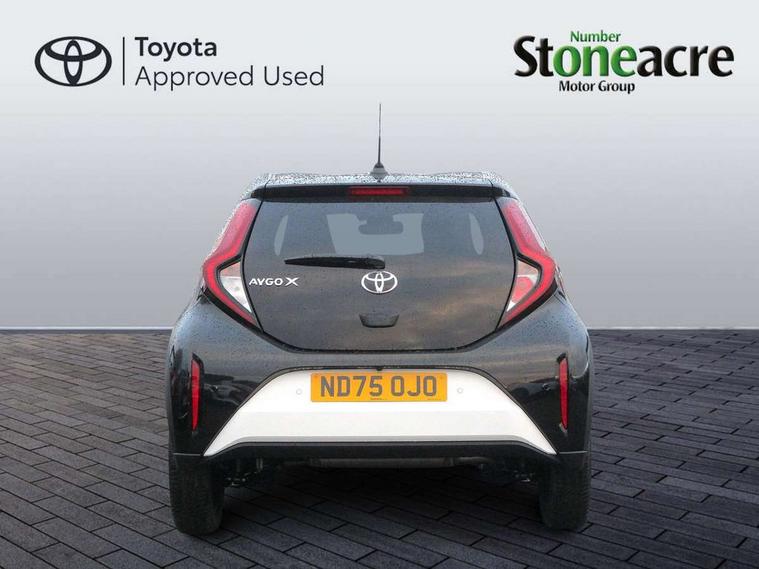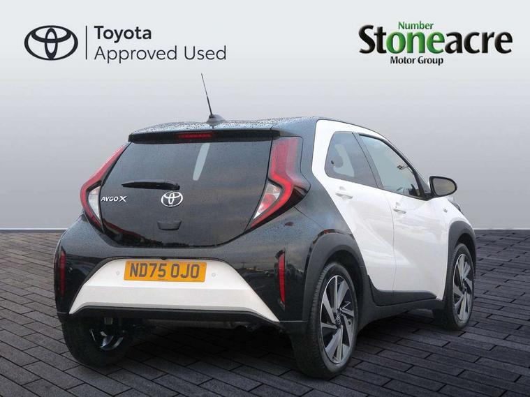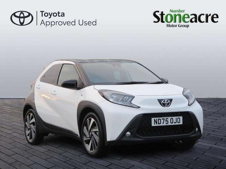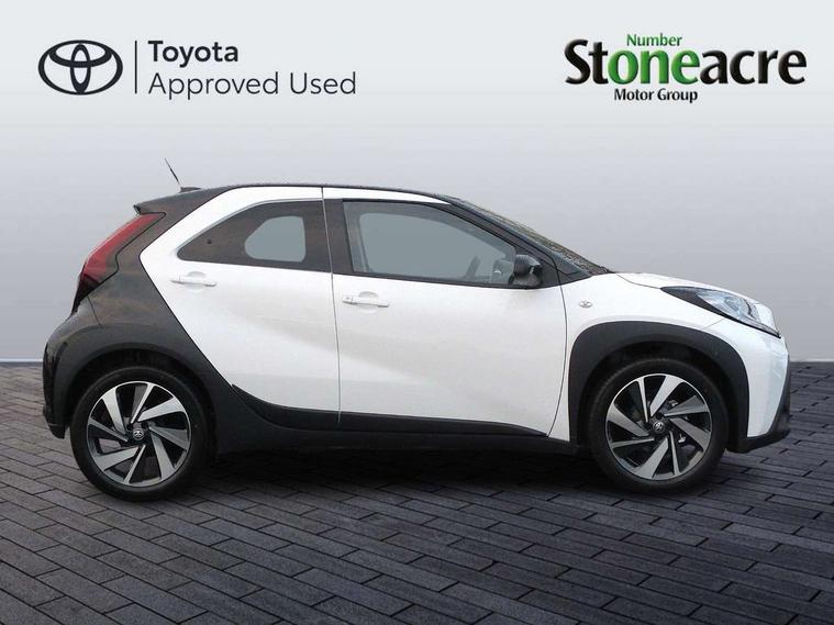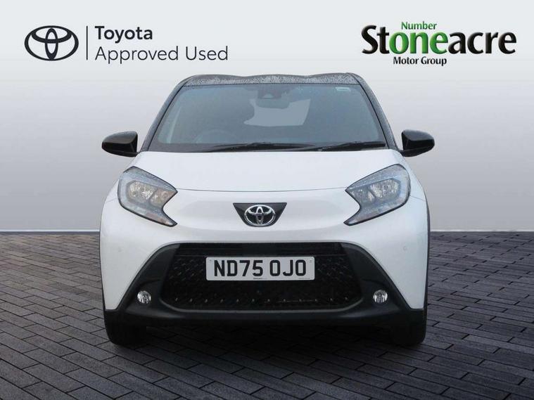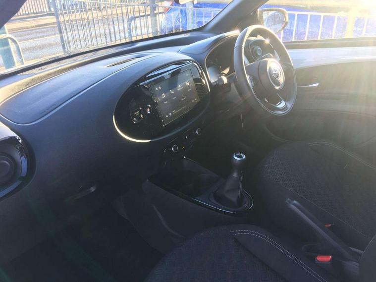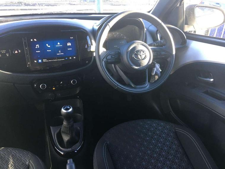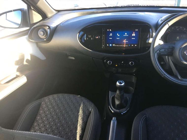 4.2" TFT colour screen, Adjustable speed limiter, Analogue speedometer, Bluetooth connectivity, Digital tachograph, Driver attention alert system, eCall emergency call system, Electric power steering, Intersection turn assist, Key reminder warning, Noise reduction kit, Pre collision system with emergency steering assist, Reversing camera with static guide lines, Smart phone integration with Apple car play/Android Auto, Speed limit display, Start and stop, Vehicle Stability Control (VSC), 4 speakers, 9" HD multimedia display touch screen with Toyota smart connect, DAB digital audio broadcast, USB connector, Auto headlights, Auto wipers, Automatic headlights cut-off, Bicycle towing hook, Black contrast roof, Black side protection mouldings, Black wheel arch mouldings, Body colour door handles, Body coloured front bumper, Boot door scuff plate, Eclipse black rear bumper, Electric heated door mirrors, Follow me home headlights, Front fog lights, Front power windows, Gloss black door mirrors, Gloss black upper front grille, Headlight cut-off reminder, LED daytime running lights, LED front light guide, LED High mounted stop lamp, Manual day/night rear view mirror, Manual headlight levelling, Pagoda roof, Power adjustable door mirrors, Power back door, Privacy glass, Projector halogen headlights, Rain sensor, Rear combination lights LED bulb type, Rear side wing doors, Rear windscreen defogger, Rear windscreen wiper, Short antenna, Variable intermittent windscreen wipers, 12v power outlet - front, 2 seat bench in 2nd row, 3 spoke leather steering wheel, 50/50 split folding rear seat, Adhesive roof headlining, Adjustable speed limiter switch on steering wheel, Audio and telephone switches on steering wheel, Auto air conditioning, Black insert on steering wheel, Black roof lining, Boot light, Centre room light, Chrome interior door handles, Chrome surround on air conditioning buttons, Clean air filter, Console box storage in body color, Fabric upholstery, Floor mats, Front and rear cup holders, Front head rest deco art, Front head restraints, Height adjustable driver seat, Intelligent adaptive cruise control switch on steering wheel, ISOFIX child restraint system on rear seats, Lane departure alert switch on steering wheel, Leather gearshift knob, Manual tilt steering wheel, Manually reclining and sliding driver seat, Manually reclining and sliding front passenger seat, Multimedia switches on steering wheel, Pollen filter, Rear door pockets, Rear head restraints, Satin silver insert on gear shift knob, Single compartment glovebox with lights, Single front passenger seat, Soft tonneau cover, Sun visors with mirror on driver and passenger side, Voice recognition switch on steering wheel, Toyota safety sense pack - Aygo X, Anti lock braking system + Electronic brake force distribution, Child safety door lock, Emergency brake light signal (EBS), Hill start assist control (HAC), Passenger airbag on/off switch, Seat belt reminder for front and rear seats, Supplement restraints system (SRS) - 6 airbags, Traction control, Tyre pressure warning system, Immobiliser, Remote power door locks, Black wheel centre caps, Tyre repair kit,