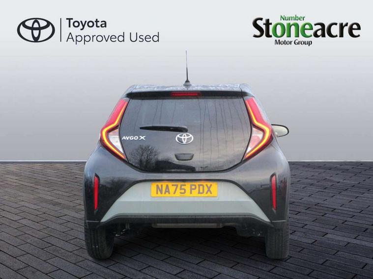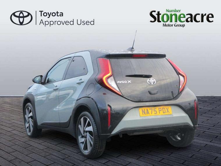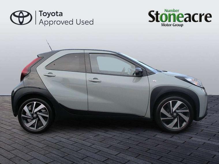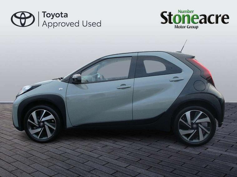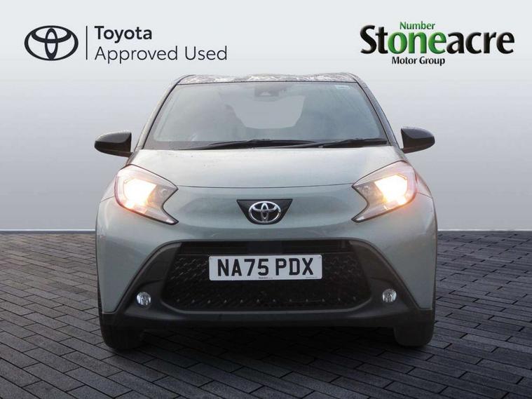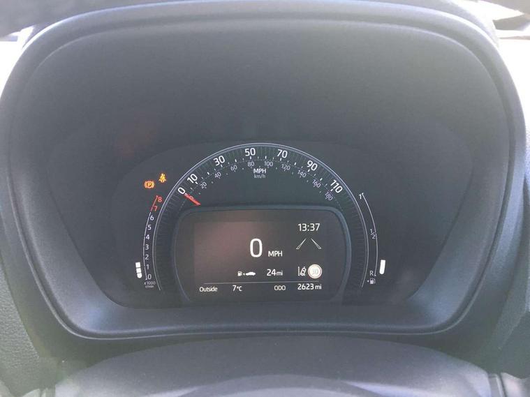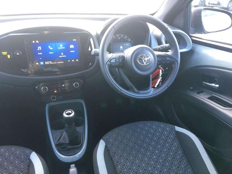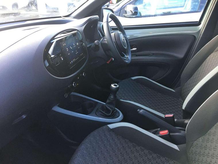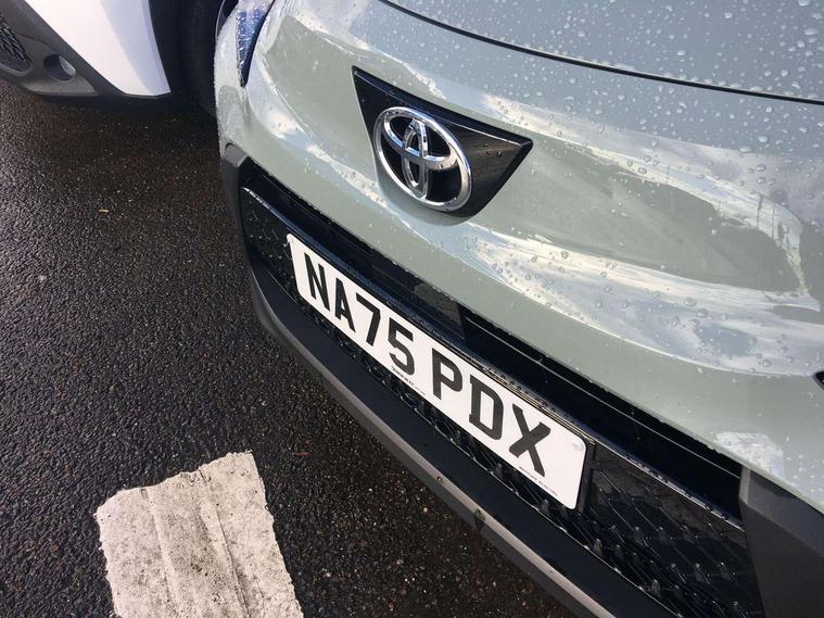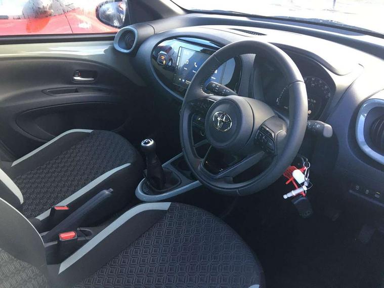 4.2" TFT colour screen, Adjustable speed limiter, Analogue speedometer, Bluetooth connectivity, Digital tachograph, Driver attention alert system, eCall emergency call system, Electric power steering, Intersection turn assist, Key reminder warning, Noise reduction kit, Pre collision system with emergency steering assist, Reversing camera with static guide lines, Smart phone integration with Apple car play/Android Auto, Speed limit display, Start and stop, Vehicle Stability Control (VSC), 4 speakers, 9" HD multimedia display touch screen with Toyota smart connect, DAB digital audio broadcast, USB connector, Auto headlights, Auto wipers, Automatic headlights cut-off, Bicycle towing hook, Black contrast roof, Black side protection mouldings, Black wheel arch mouldings, Body colour door handles, Body coloured front bumper, Boot door scuff plate, Eclipse black rear bumper, Electric heated door mirrors, Follow me home headlights, Front fog lights, Front power windows, Gloss black door mirrors, Gloss black upper front grille, Headlight cut-off reminder, LED daytime running lights, LED front light guide, LED High mounted stop lamp, Manual day/night rear view mirror, Manual headlight levelling, Pagoda roof, Power adjustable door mirrors, Power back door, Privacy glass, Projector halogen headlights, Rain sensor, Rear combination lights LED bulb type, Rear side wing doors, Rear windscreen defogger, Rear windscreen wiper, Short antenna, Variable intermittent windscreen wipers, 12v power outlet - front, 2 seat bench in 2nd row, 3 spoke leather steering wheel, 50/50 split folding rear seat, Adhesive roof headlining, Adjustable speed limiter switch on steering wheel, Audio and telephone switches on steering wheel, Auto air conditioning, Black insert on steering wheel, Black roof lining, Boot light, Centre room light, Chrome interior door handles, Chrome surround on air conditioning buttons, Clean air filter, Console box storage in body color, Fabric upholstery, Floor mats, Front and rear cup holders, Front head rest deco art, Front head restraints, Height adjustable driver seat, Intelligent adaptive cruise control switch on steering wheel, ISOFIX child restraint system on rear seats, Lane departure alert switch on steering wheel, Leather gearshift knob, Manual tilt steering wheel, Manually reclining and sliding driver seat, Manually reclining and sliding front passenger seat, Multimedia switches on steering wheel, Pollen filter, Rear door pockets, Rear head restraints, Satin silver insert on gear shift knob, Single compartment glovebox with lights, Single front passenger seat, Soft tonneau cover, Sun visors with mirror on driver and passenger side, Voice recognition switch on steering wheel, Toyota safety sense pack - Aygo X, Anti lock braking system + Electronic brake force distribution, Child safety door lock, Emergency brake light signal (EBS), Hill start assist control (HAC), Passenger airbag on/off switch, Seat belt reminder for front and rear seats, Supplement restraints system (SRS) - 6 airbags, Traction control, Tyre pressure warning system, Immobiliser, Remote power door locks, Black wheel centre caps, Tyre repair kit,