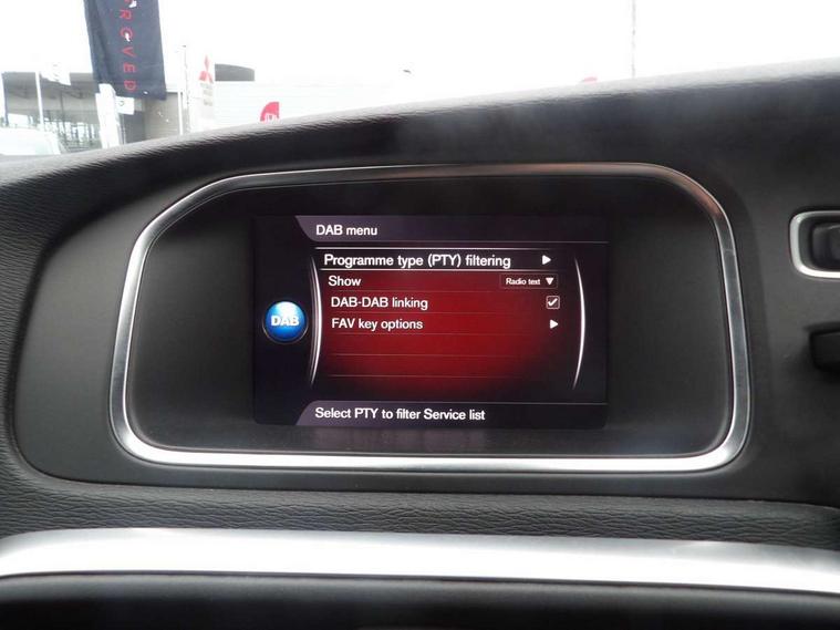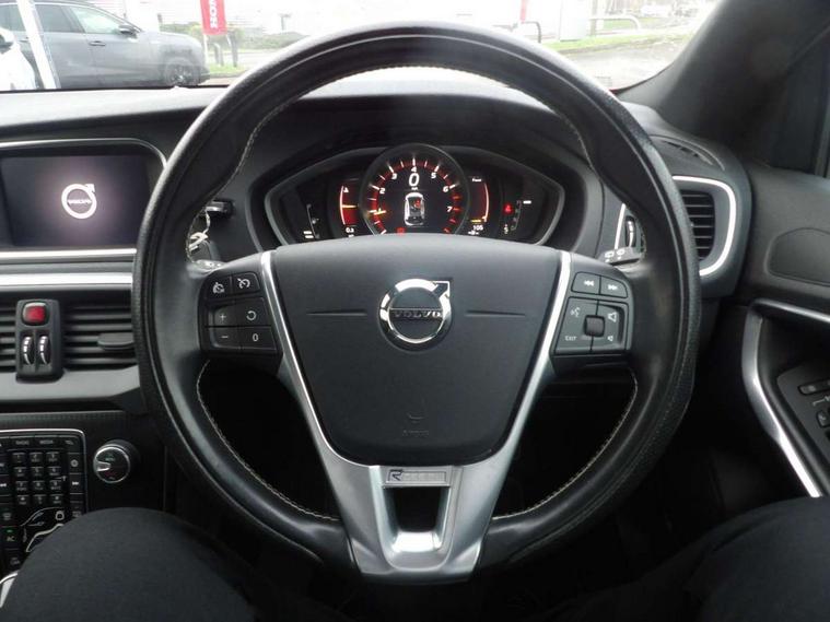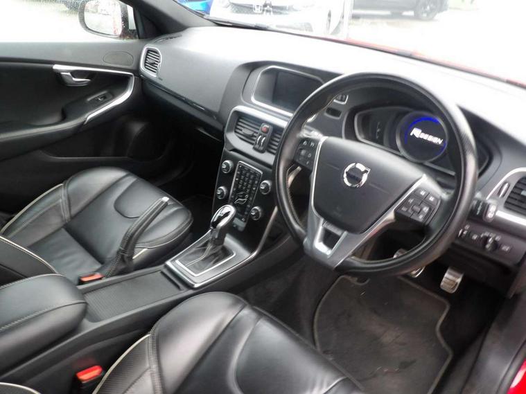 Active TFT crystal driver's instrument display, Front park assist, Information centre, Intelligent driver information system (IDIS), Rear park assist, Rear parking camera, Sensus navigation system, Service interval indicator, Speed limiter, Speed sensitive steering, Dynamic chassis, DAB Digital radio, Steering wheel audio controls, Active bending LED headlights, Adaptive brake lights, Auto dimming rear view mirror, Automatic folding door mirrors with ground lights, Automatic headlights, Body colour bumpers, Body colour door handles, Dark tinted rear side windows, Dual exhaust pipes, Electrically adjustable and heated door mirrors, Frameless rear view mirror, Front and rear electric windows, Headlamp levelling, Headlight cleaning system, High level LED brake light, Home safe and approach lighting, LED daytime running lights, LED Headlights, Matt silver finish door mirrors, R Design front grille, R Design lower front nose, Rain sensor windscreen wipers, Rear diffuser, Rear tailgate emblem, Rear wiper, Roof spoiler, Silk metal window trim surround, Visible VIN plate, 12V socket in front + rear tunnel console, 3 spoke leather steering wheel with chrome trim and R design logo, 5 headrests, 60/40 split folding rear seat, A-pillar parking ticket holder, Adjustable front centre armrest, Charcoal headlining, Door sill tread plates, Electronic climate control (ECC), Flexible load floor and grocery bag holder, Folding front passenger seat with height/lumbar adjust, Footwell lights, Front cupholders, Front door step lamp, Front reading lights, Front sports seats, Front storage box, Height adjustable drivers seat with lumbar support, Height/reach adjustable steering column, Illuminated driver/passenger vanity mirrors, Illuminated gear knob, Isofix attachments on outer rear seats, Load cover, Lockable glovebox, Pollen filter, R Design leather sports upholstery, Rear armrest with cupholder, Rear reading lights, Rear theatre lighting, Sports floor mats, Sports pedals, WHIPS - Whiplash Protection System, 5 x 3 point seatbelts, ABS+EBA, City safety braking system, Drivers knee airbag, DSTC-Dynamic Stability and Traction Control, Dual stage driver's airbag, Dual stage passenger airbag, Front/rear seatbelt pre-tensioners, Hill start assist, Inflatable curtain, Manual rear child locks, Passenger airbag cut-off device, Pedestrian airbag system, Side airbags, Side curtain airbags, Side impact protection, Tyre pressure monitor, Warning triangle, Anti-theft alarm including immobiliser/volume sensor + level sensor, Deadlocking system, Key integrated remote control central locking, Locking wheel nuts, Stealth aluminium trim,