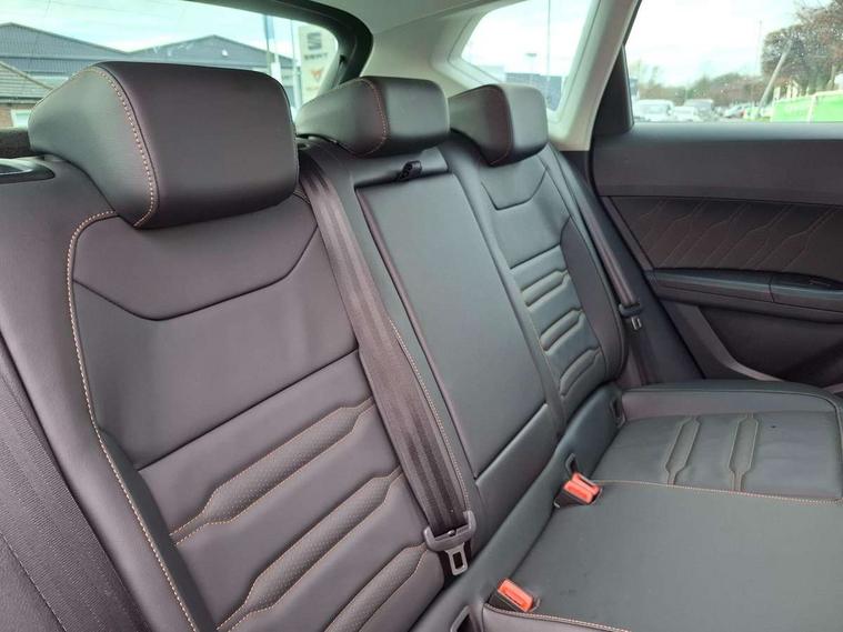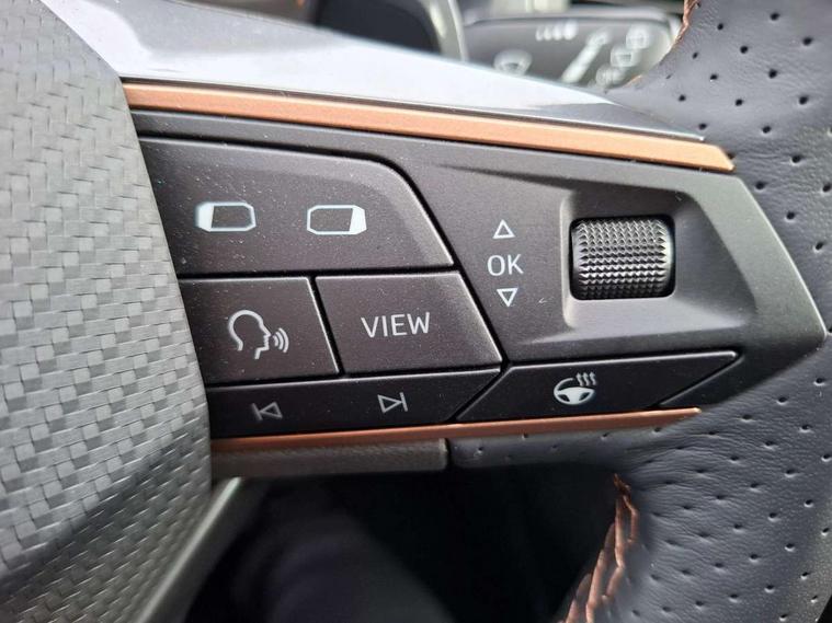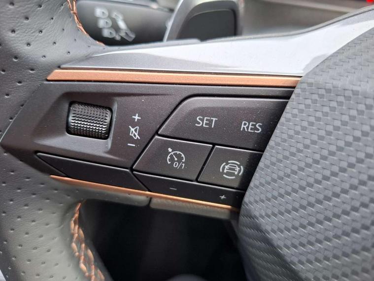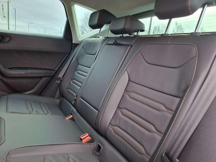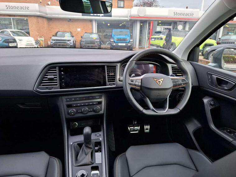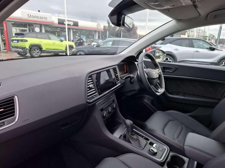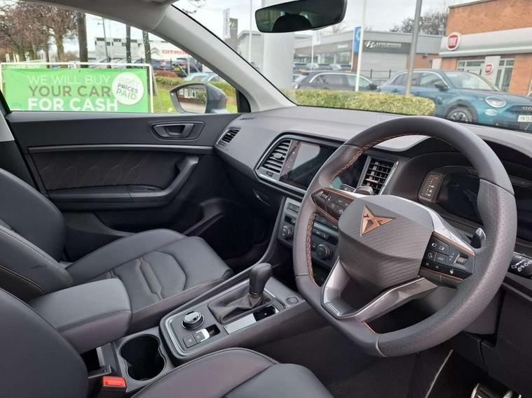 Cruise control system with speed limiter, Digital cockpit, Driving profile selection and conventional shock absorber, E-call, Electric tailgate with virtual pedal, Outside temperature gauge, Progressive power assisted steering, Rear view camera, Self parking functionality (includes front and rear parking sensors), Trip computer, wired and wireless full link smartphone integration, Wireless phone charger, Front and rear shock absorption, chassis with increased ride height, Steering wheel mounted audio/phone controls, Body colour bumpers with dark aluminium diffusor, Body coloured wheel arch surrounds, Dark tinted rear windows, Daytime running lights, Door mirrors with welcome CUPRA light silhouette, Dynamic headlight range control with self adjusting whilst driving, Electric adjustable/heated/folding door mirrors, Front and rear electric windows, Front grille frame in chrome, Full LED headlamps with lens and LED front fog lamps with cornering function, Gloss black door mirrors, Gloss black roof rails, Gloss black side mouldings, Gloss black side window trim, Illuminated aluminium front door sill, LED rear tail lights with dynamic indicators, Rear fog lights, Rear side wing doors, Rear spoiler, Rear wash/wipe, Specific CUPRA design front bumper, Standard rear exhaust tailpipes, Third brake light, 12V socket in front, 3 seat bench in 2nd row, 60/40 split folding rear seat, Aluminium pedals, Cupra steering wheel emblem, Dual zone climate control, Electric driver seat with memory function, Front and rear head restraints, Front centre armrest, Front seat back storage pockets, Grey roof lining, Heated front seats, Heated steering wheel, Height adjustable driver and passenger seat with lumbar adjustment, ISOFIX points in outer rear seats with top tether anchorage points, Leather sport bucket seats, Leather steering wheel and gear knob, Multicoloured ambient lighting with LED interior illumination, Pedal cluster, Rear armrest and easy back seat release mechanism from boot, Single front passenger seat, Sports steering wheel, Steering wheel mounted gearshift paddles, Storage compartment in roof console for sunglass, Storage compartment under driver's seat, Convenience pack - Ateca, Interior lighting pack - Ateca, Navigation system plus pack with DAB - Ateca, Safety and driving pack - Ateca, 3x3 point rear seatbelts, ABS, Traction control system (TCS), Electronic stability control (ESC) and Electronic differential lock system (XDS), Airbags - Driver and front passenger airbag with deactivation, front side, two curtain and driver's knee airbags, Black brake callipers with CUPRA logo, Electric parking brake with auto hold function, Front and rear seatbelt reminder, Front assist with autonomous emergency braking, Hill hold control, Manual rear child locks, Single tone horn, Tiredness recognition system, Tyre pressure monitoring system, Alarm, Keyless entry, Locking wheel bolts, 19" Sport machined alloy wheels 36/3 in black/silver,