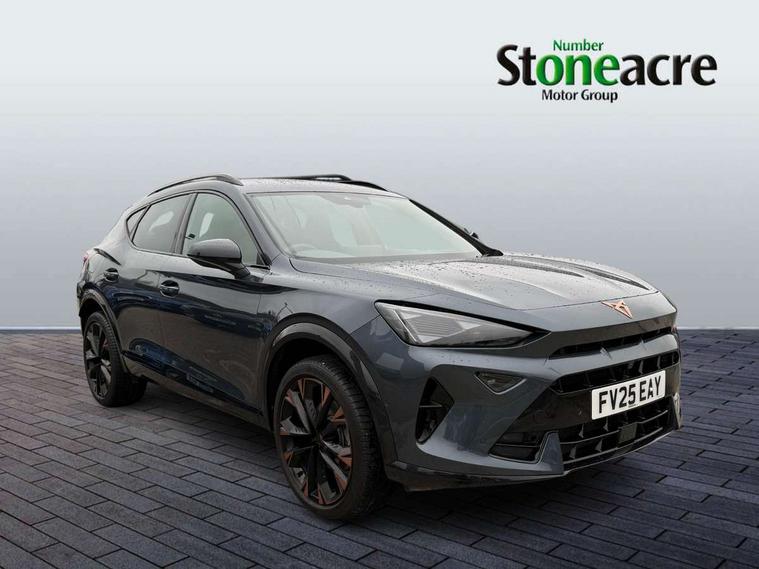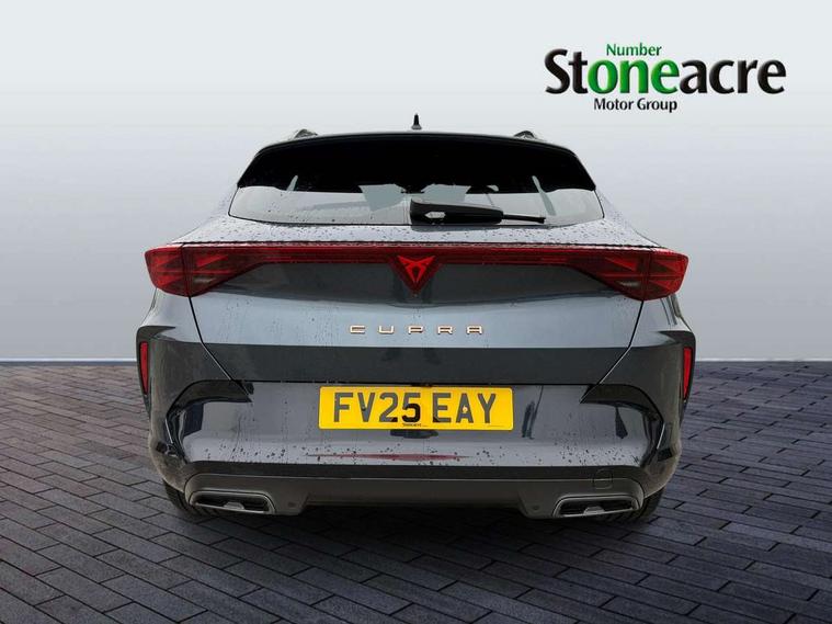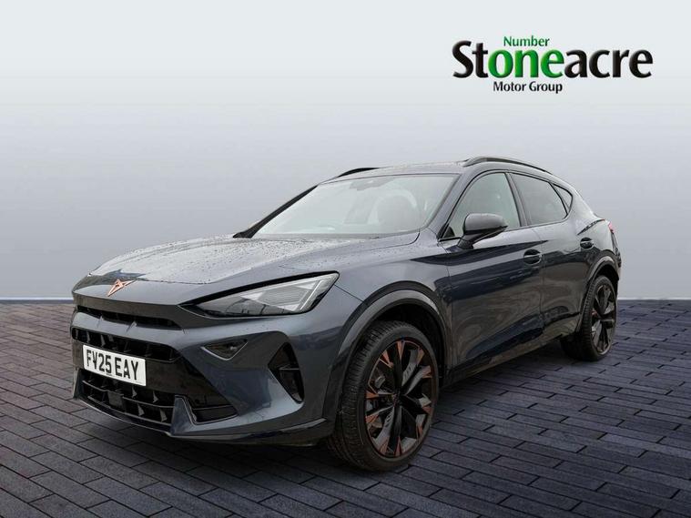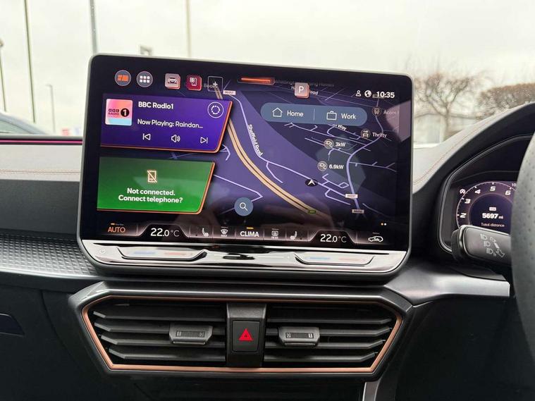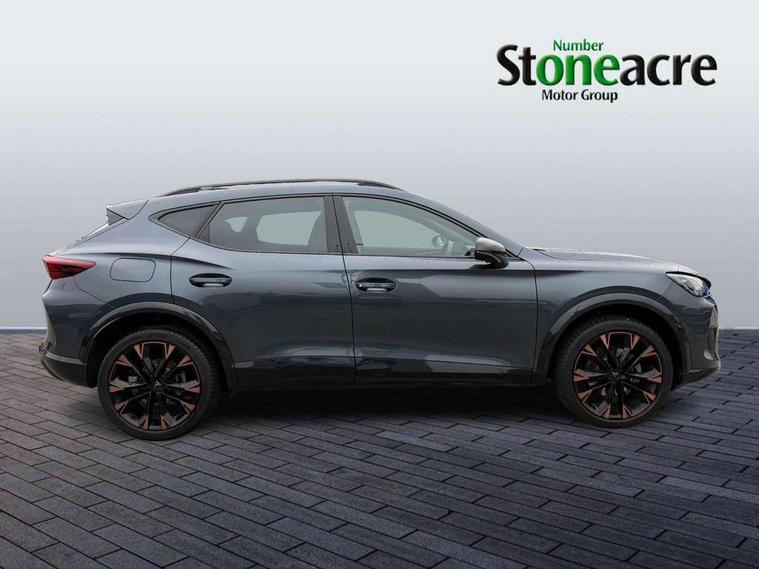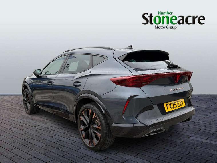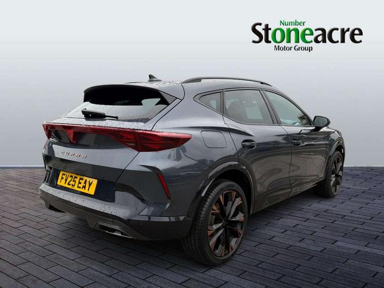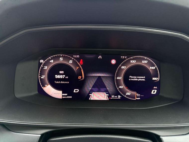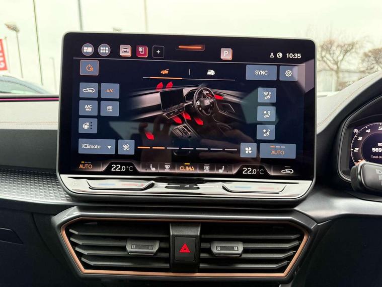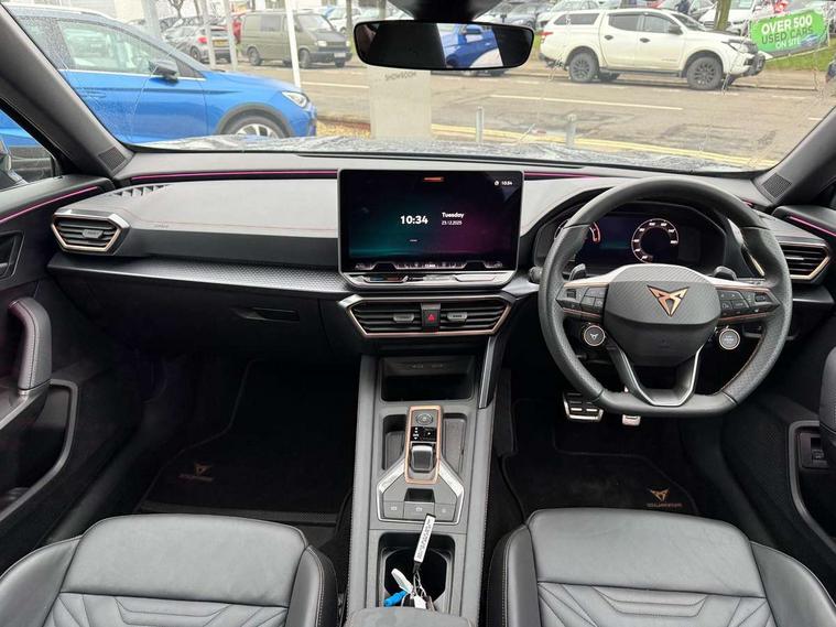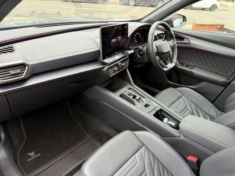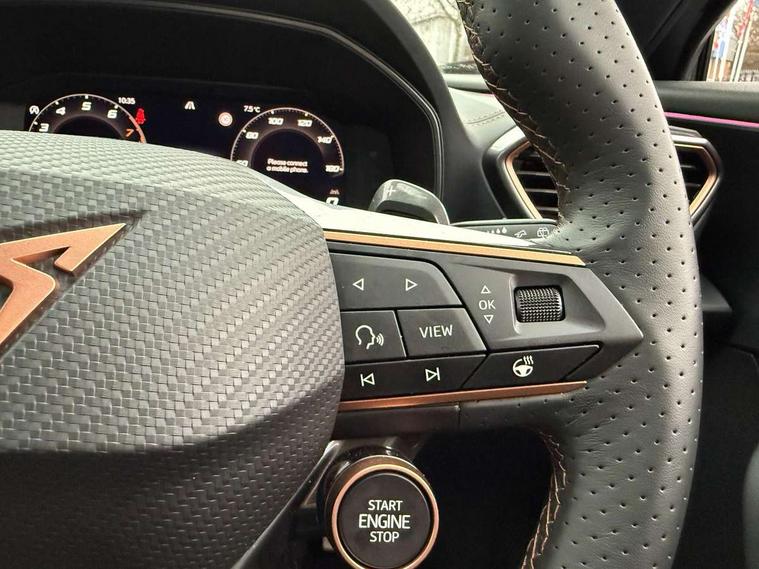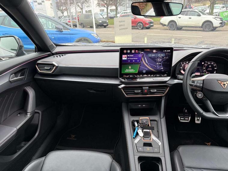 10.25" digital cockpit and configurable dashboard, Adaptive cruise control with follow-to-stop and speed limiter, Advanced driver alert system, Advanced lane assist with semi-automatic vehicle control in a medical emergency and traffic jam assist, Driving profile selection, Dynamic road sign display, Emergency steering support with turn assist, Forward collision warning with automatic braking, Full link phone integration, Intelligent park assist, Progressive steering, RPM, trip computer, outside temp gauge, instrument light brightness, low fuel warning light, lights on reminder, gearshift indicator, Service interval indicator, Side and exit assist, Start/stop system with regenerative braking, Top view camera, Virtual pedal and electric tailgate, Voice control system, Wired Android Auto, Wireless apple carplay, Wireless phone charger, CUPRA sport suspension, Electronic locking differential and dynamic traction support, 2 front and 2 rear USB type C sockets, Media system with navigation, 12.9" touchscreen display, voice control, DAB, steering wheel mounted controls, Auto dimming rear view mirror, Body colour door handles, Body coloured bumpers, Dark grey wing mirror, Daytime running light with automatic headlight control and coming home feature, Door panel ambient lighting, Dynamic headlight range control, Electric front/rear windows, Electrically adjustable heated and folding door mirrors with memory function, Gloss black roof rails and window surrounds, High beam assist, LED 3rd brake light, LED front fog lamps with cornering function, LED Headlights, LED Taillights with dynamic indicator, Rain sensing wipers, Rear diffuser with black simulated exhaust pipes, Rear fog lights, Rear side wing doors, Rear wash/wipe, Tinted rear windows, Welcome lights (within exterior mirror housing), 12V socket, 2 front and 2 rear reading lights, 3 seat bench in 2nd row, 60/40 split rear bench seat with armrest and mechanical seat release, Black headlining, Black interior roof lining, Cupra sports pedals, Dust/pollen filter, Electrically adjustable front seats with lumbar support and memory function, Front and rear head restraints, Front centre armrest, Heated front seats, Heated supersports multifunction leather steering wheel with satellite buttons and gear shift paddles, Height/reach adjust steering wheel, Illuminated aluminium doorsteps, Illuminated interior front door sills, Illuminated sunvisor with mirror, Isofix, Leather dashboard, door insert and side trim panel, LED smart wraparound lighting, PVC/Leather upholstery, Satellite steering wheel, Single front passenger seat, Storage pockets on rear of front seats, Three zone climate control with control panel in rear, Variable luggage/load compartment floor, 3 point seatbelts on all rear seats, ABS, Brake control system - ESC and brake booster, Child proof door locks, Driver and front passenger airbags with front passenger airbag de-activation, Electronic parking brake, Front and rear disc brakes, Front side curtain airbags, Hill hold control, Pre-crash front and rear seat belt tensioner, window closure and hazard lights, Public e-call, Seat belt reminder for front and rear seats, Tyre pressure monitoring system, Anti theft alarm system, KESSY Advanced - Keyless start, keyless entry with SAFELOCK, Locking wheel bolts, Copper and aluminium interior detailing,