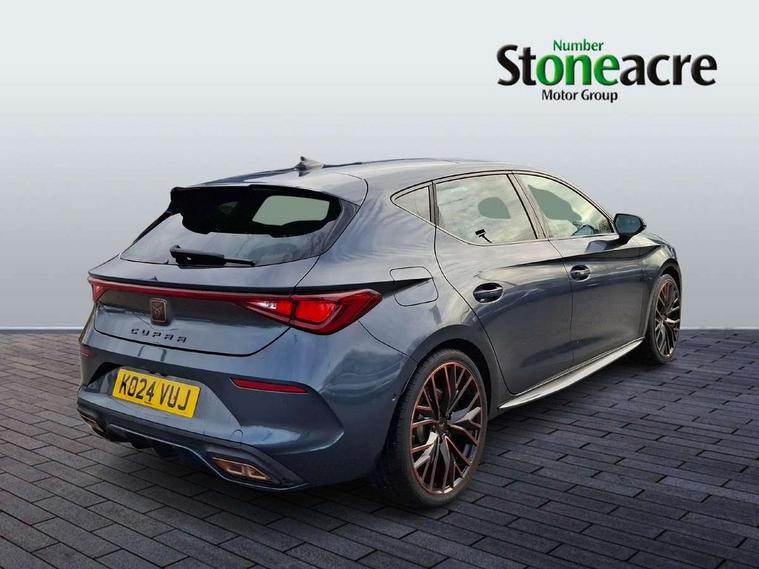 CUPRA drive profile selection with 4 modes (Comfort/Cupra/Sport/Individual), throttle response and gearshift mode, Digital cockpit, E-call, Four x USB Type C ports (2 in front and 2 in rear), Front assist with forward collision warning braking reaction to vehicles, pedestrians and cyclists, Full link smartphone integration with Mirror Link, wireless Apple CarPlay and wired Google Android Auto, Lane assist, Lockable tailgate, Park assist (inc front/rear parking sensors), Rear view camera, RPM, trip computer, outside temp gauge, instrument light brightness, low fuel warning light, lights on reminder, gearshift indicator, Service interval indicator, Start/stop system with regenerative braking, Wireless phone charger, 10 amp mode 2 charging cable, 16 amp mode 3 charging cable, 3.6 kw On-board charger, Standard suspension, XDS electronic differential lock and dynamic traction support, Auxiliary input socket, Auto dimming rear view mirror, Body colour door handles, Body coloured bumpers, Cupra sports bumpers, Dark tinted rear windows, Electric front/rear windows, Electrically adjustable, heated and folding door mirrors, LED front fog lamps with cornering function, LED headlights with dynamic turn signals, tail lights, rear fog lights with rear coast to coast lighting, Panoramic sunroof, Rain sensing wipers, Rear diffuser with twin exhaust pipe on each side with simulated exhausts, Rear side wing doors, Rear wash/wipe, Separate daytime running light with automatic headlight control and coming home feature, Third brake light, 12v power supply in centre console, 3 seat bench in 2nd row, 5 headrests, 60/40 split rear bench seat with armrest, Ambient lighting (glovebox, footwell, ambient lighting multicoloured), Black headlining, CUPRA Leather flat bottomed, heated, perforated steering and gearshift paddles, Cupra sports pedals, Driver/passenger manual seat height adjustment, Dust/pollen filter, Folding boot cover, Front and rear reading lights X 4, Front centre armrest, Front seats manual lumbar adjustment, Height/reach adjust steering wheel, Illuminated interior front door sills, Interior wraparound lighting, ISOFIX points in outer rear seats with top tether anchorage points, Luggage tie-down hooks, PVC/Cloth upholstery with copper stitching + Cupra embossed logo on headrest, Single front passenger seat, Sports bucket seats, Storage pockets on rear of front seats, Sunvisors with illuminated mirror, Three zone climate control, Design pack - Cupra Leon, Dynamic and comfort pack - Leon Cupra, Media system plus with navigation pack - Leon Cupra, 3 point seatbelts on all rear seats, ABS, Brake control system - ESC and brake booster, Child proof door locks, Cupra black brake calipers, Driver and front passenger airbags with front passenger airbag de-activation, front side and curtain airbags, Electronic parking brake, Extended safety system - seat belt tensioner, window closure and hazard lights, Hill hold control, Rear disc brakes, Seat belt reminder for front and rear seats, Tiredness recognition system, Tyre pressure monitoring system, Anti theft alarm system with interior monitoring in cab, backup horn and towing protection, KESSY Advanced - Keyless start, keyless entry, Locking wheel bolts, Chrome and copper interior detailing, 19" Performance satin black and copper alloy wheels with 91Y tyres, Breakdown kit, Tool kit,